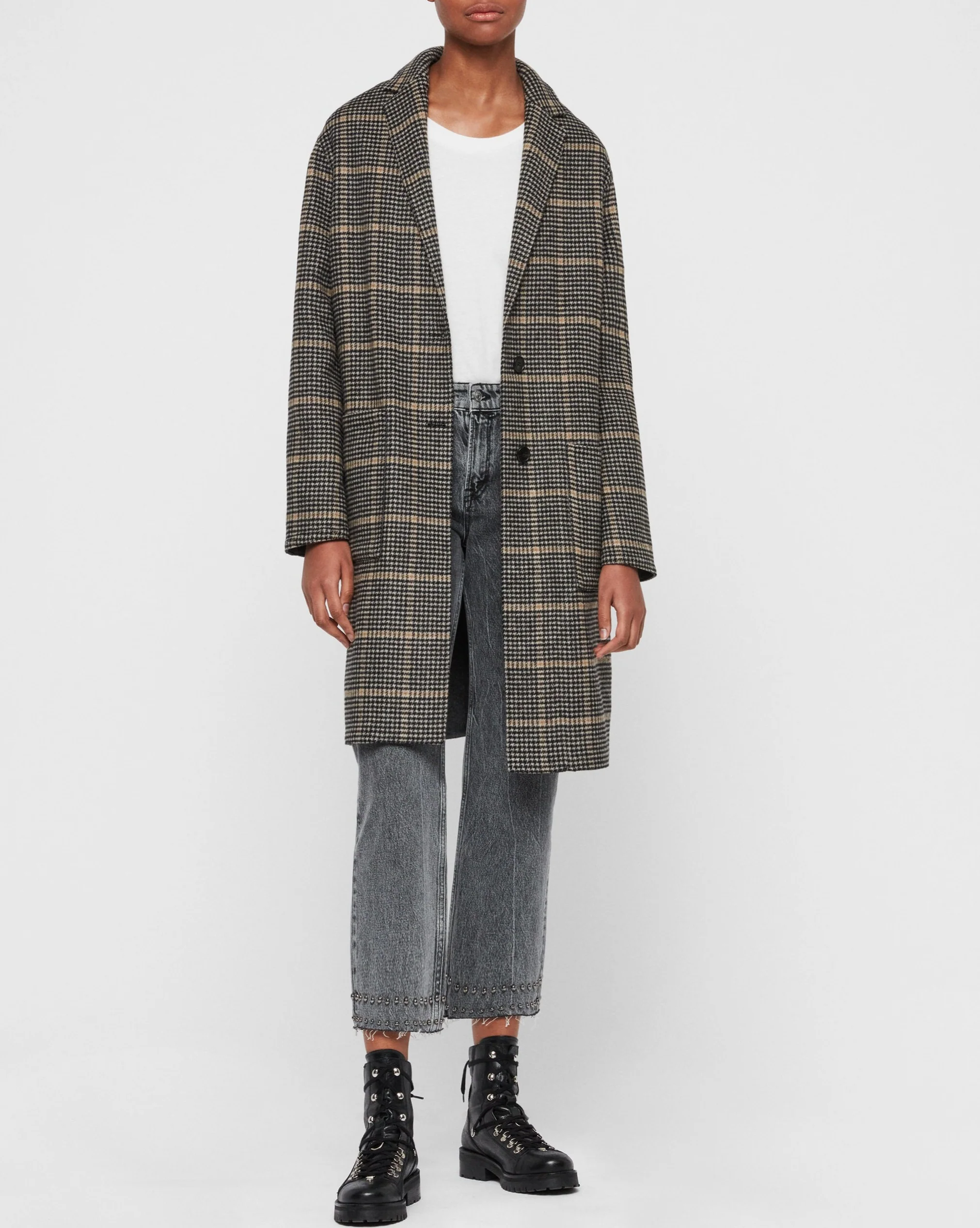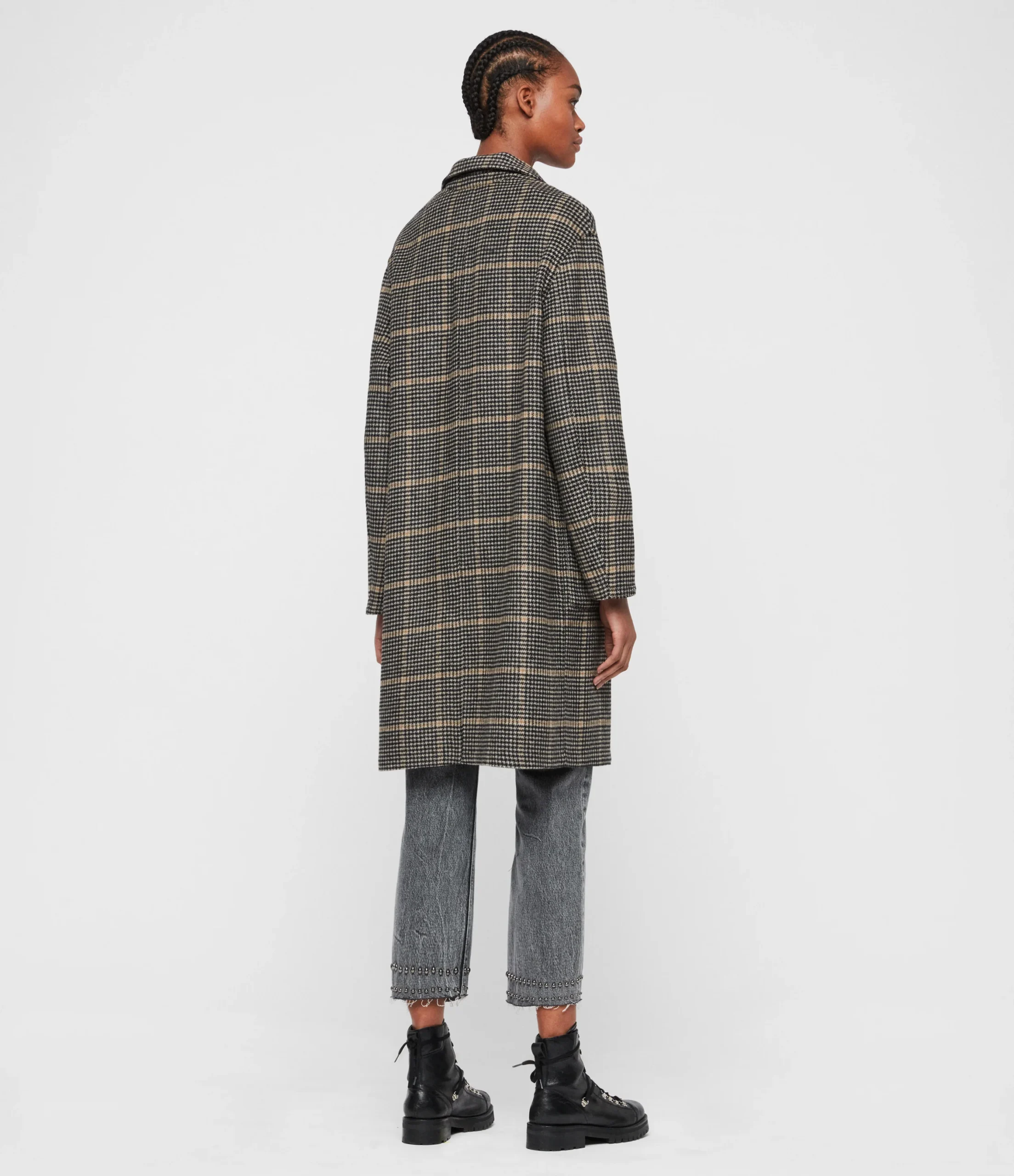Abrigo Anya Aurora Negro Y Camello para mujer , marca AllSaints. Consultar composición e instrucciones de lavado en etiqueta interna. Los tallajes numéricos para esta marca están expresados en tallas británicas, para conocer su equivalencia, consulta el cuadro de tallas