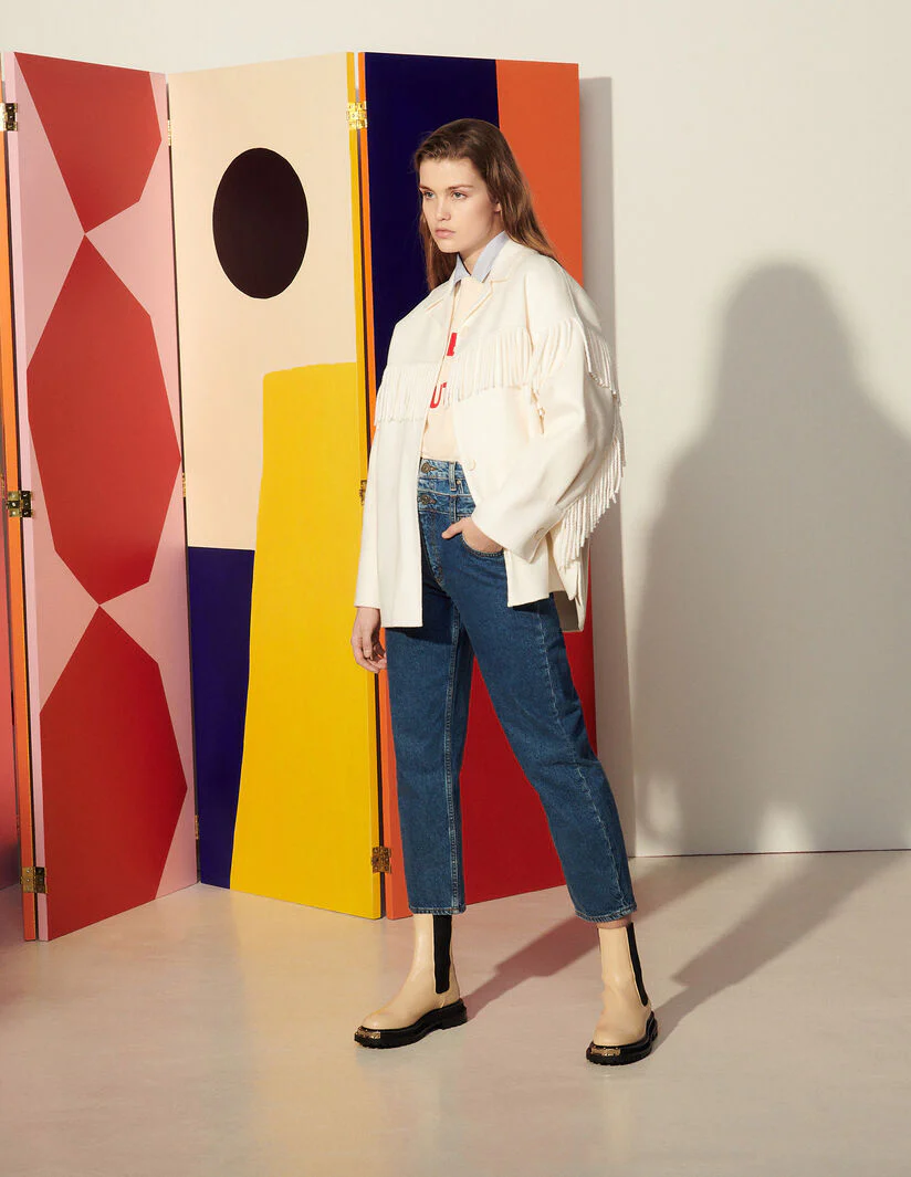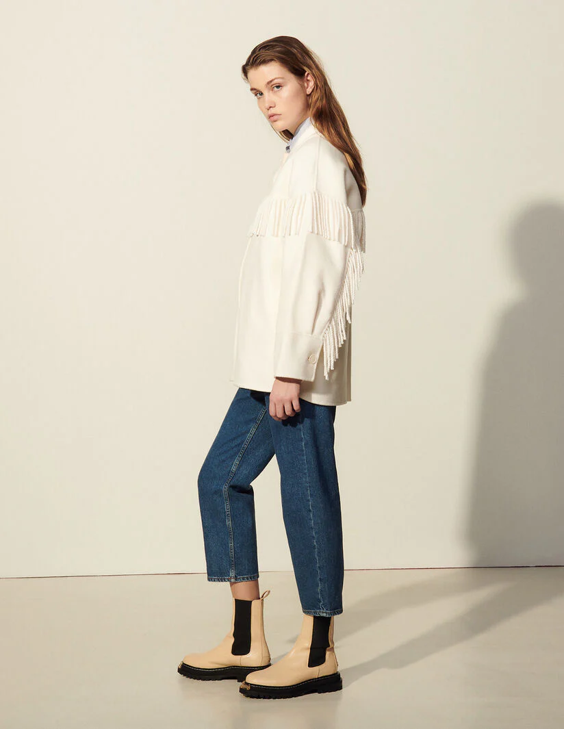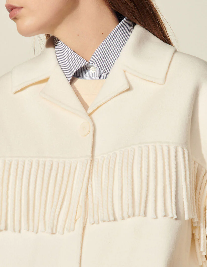 Chaqueta De Mujer Sandro • Chaqueta Con Flecos De Lana De Doble Cara • Cuello Sastre • Flecos A Lo Largo De Las Mangas Y La Parte Superior De La Prenda • Manga Larga Con Cierre De Botón • Bolsillos En La Costura Lateral • Parte Inferior De La Prenda En Forma De Liquette • Botonadura En La Parte Delantera • La Modelo Lleva La Talla 36Référence : Sfpou00290 Composición Tejido Principal: 80% Lana, 20% Poliamida Forro: 100% Poliéster