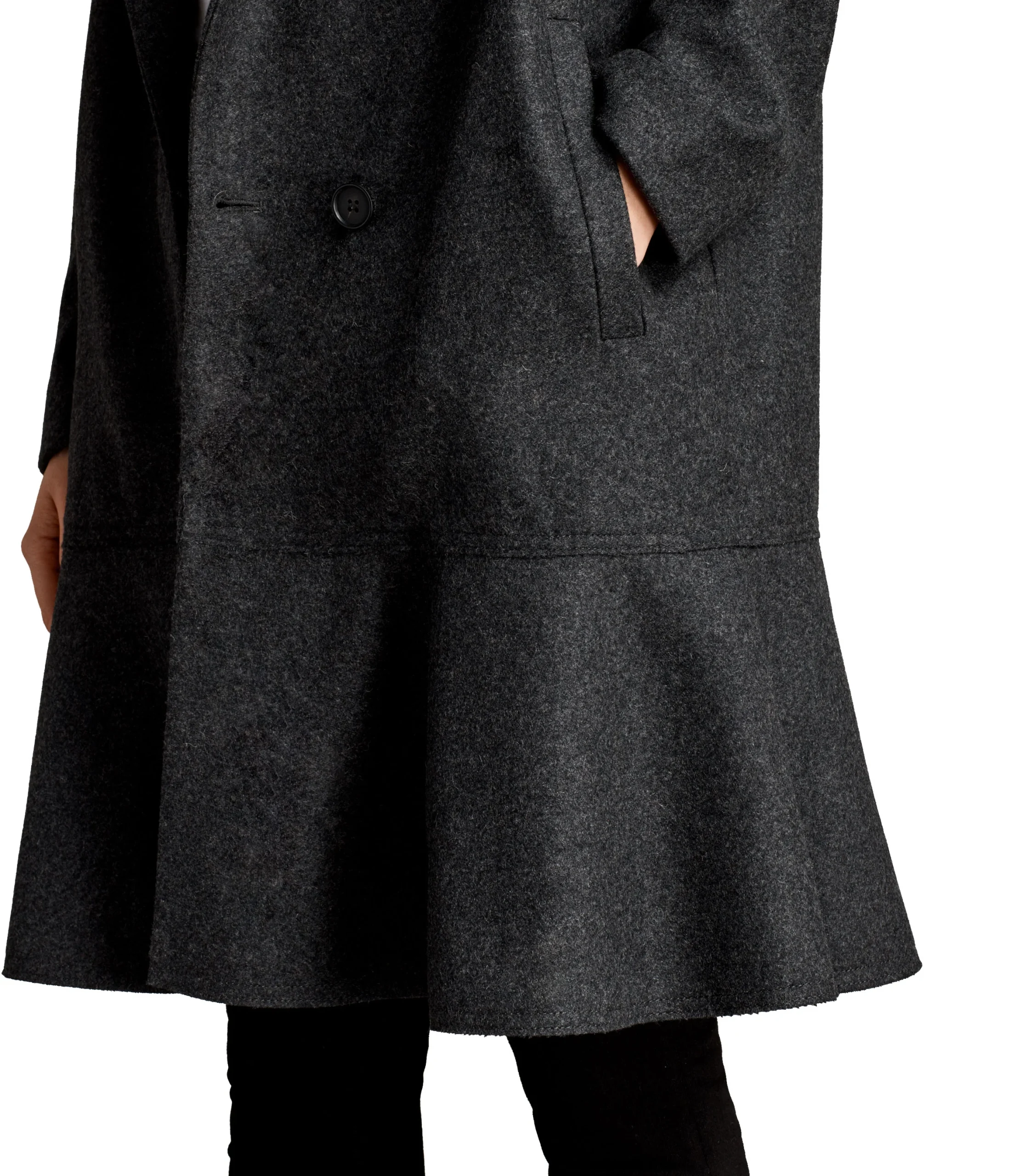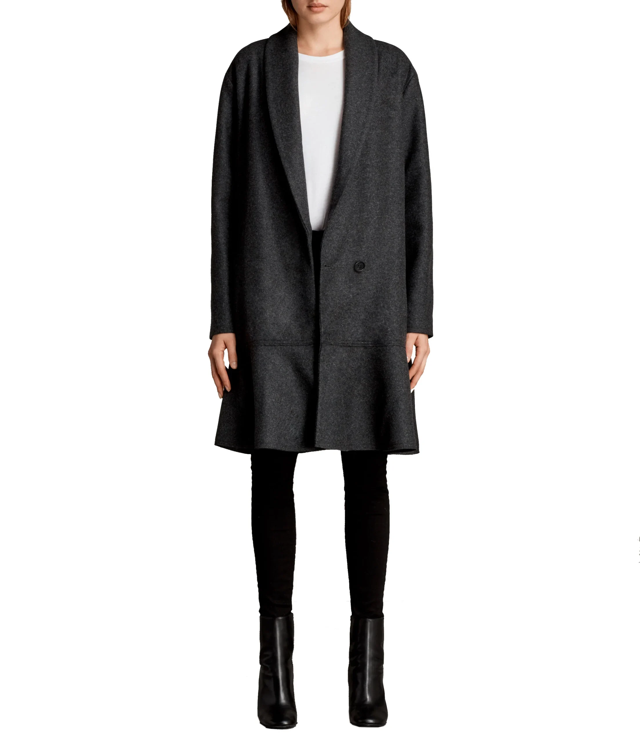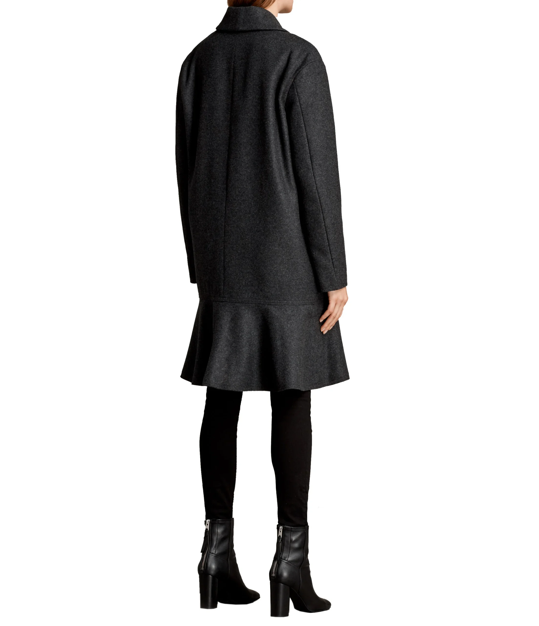 ABRIGO CORTE REGULAR, CIERRE CON BOTONES, DECORADO CON VOLANTE INFERIOR, 2 BOLSILLOS ABIERTOS EN LA PARTE DELANTERA, MARCA ALLSAINTS. CAPA EXTERIOR:LANA Y POLIAMIDA