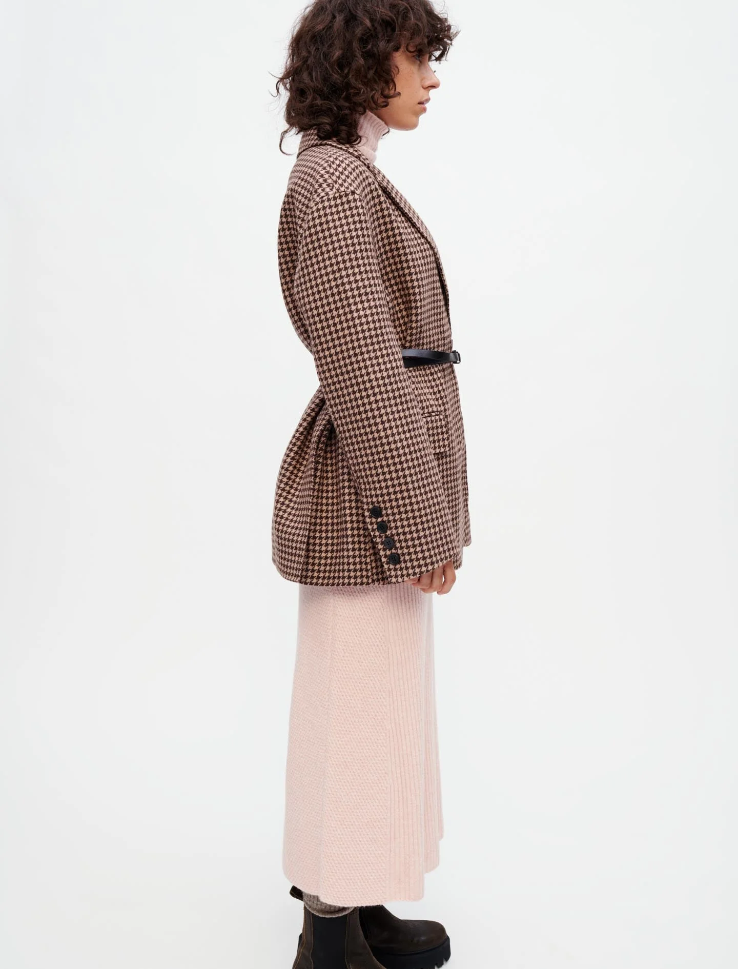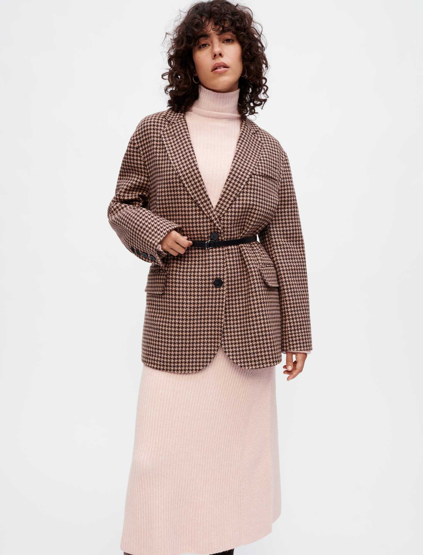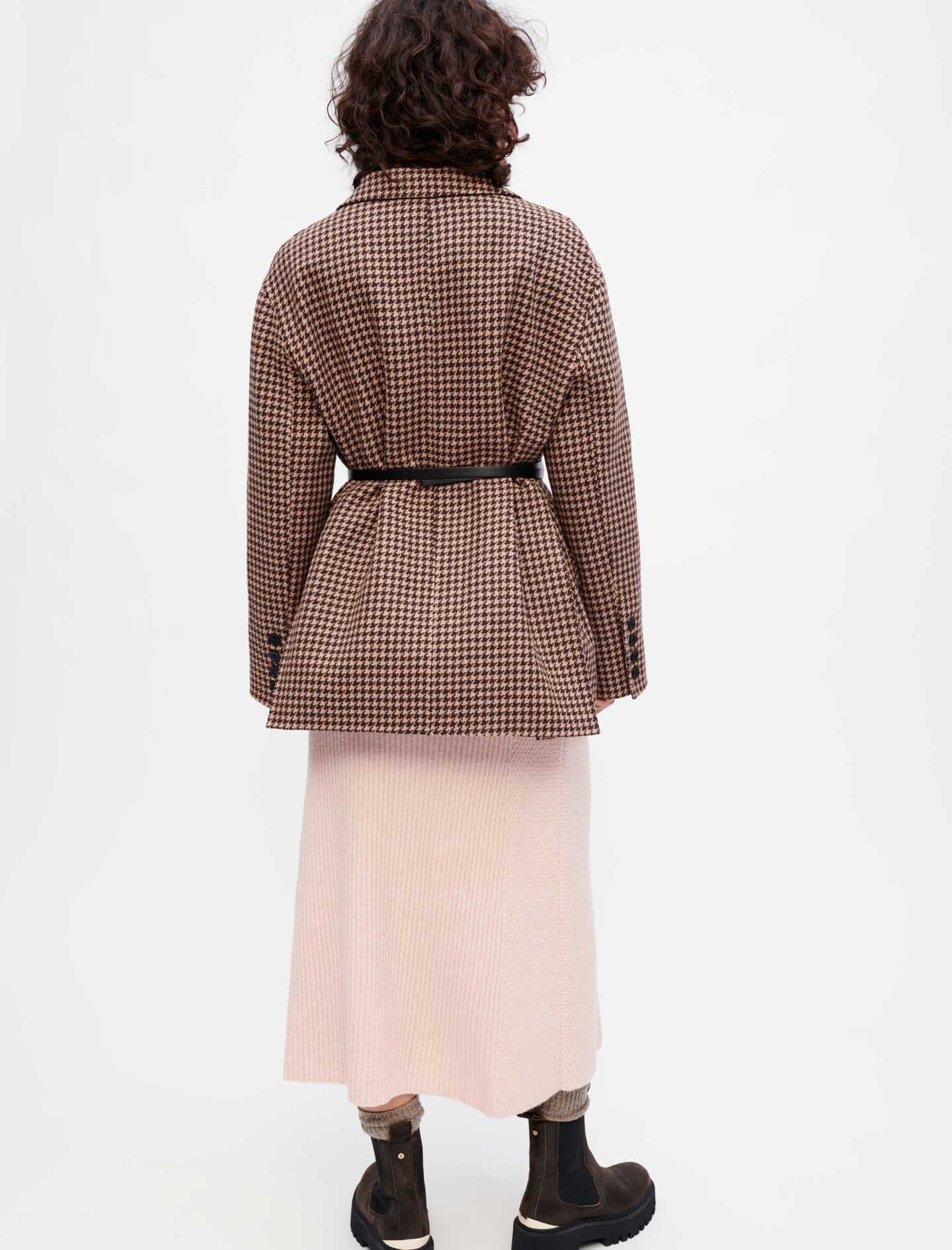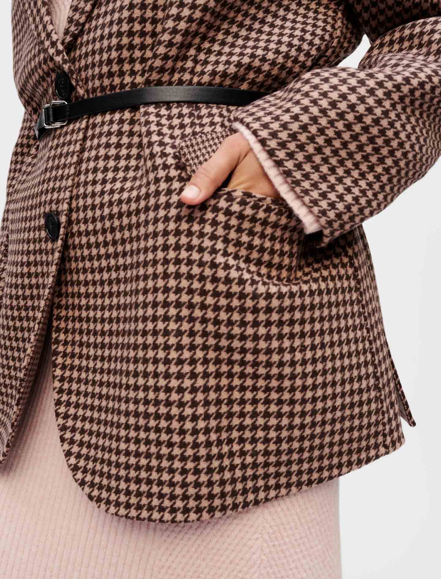 Abrigo holgado de largo medio de doble faz lisa. Estampado de pata de gallo marrón y camel. Mangas largas y rectas. Cinturón desmontable con hebilla metálica. Botones con las siglas de Maje. Modelo oversize.
