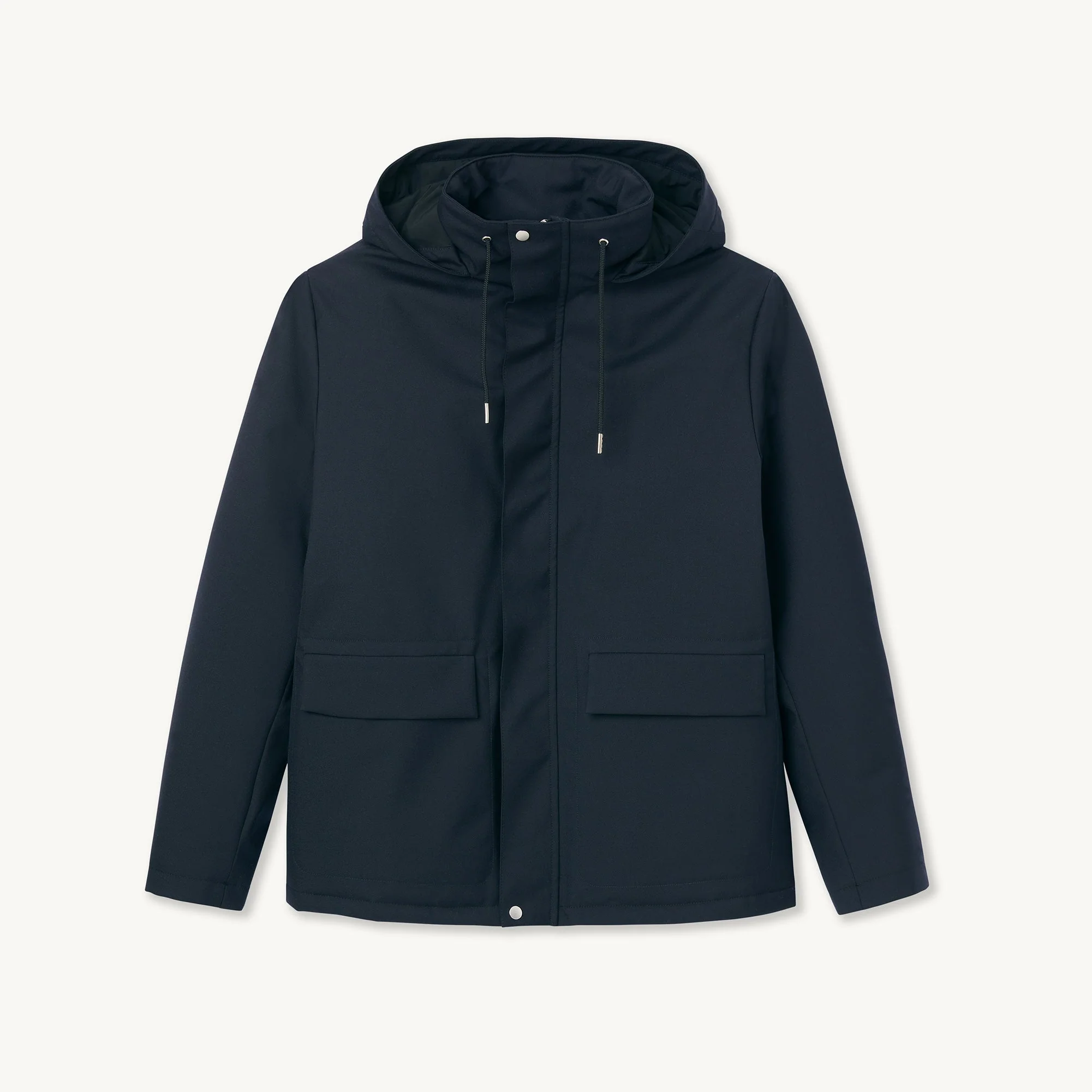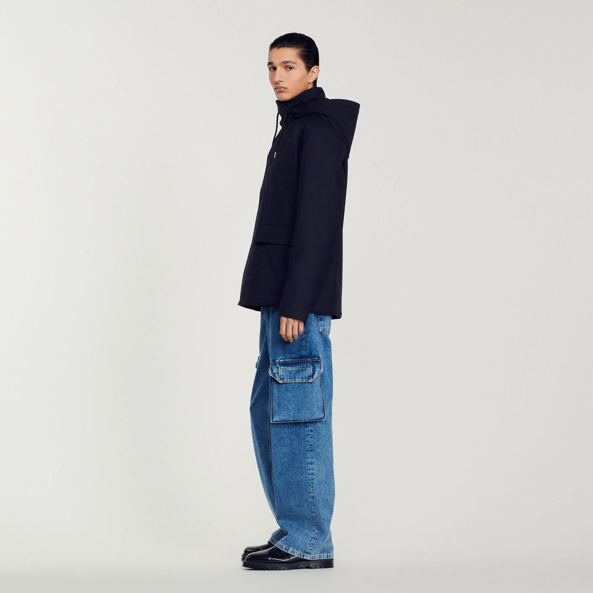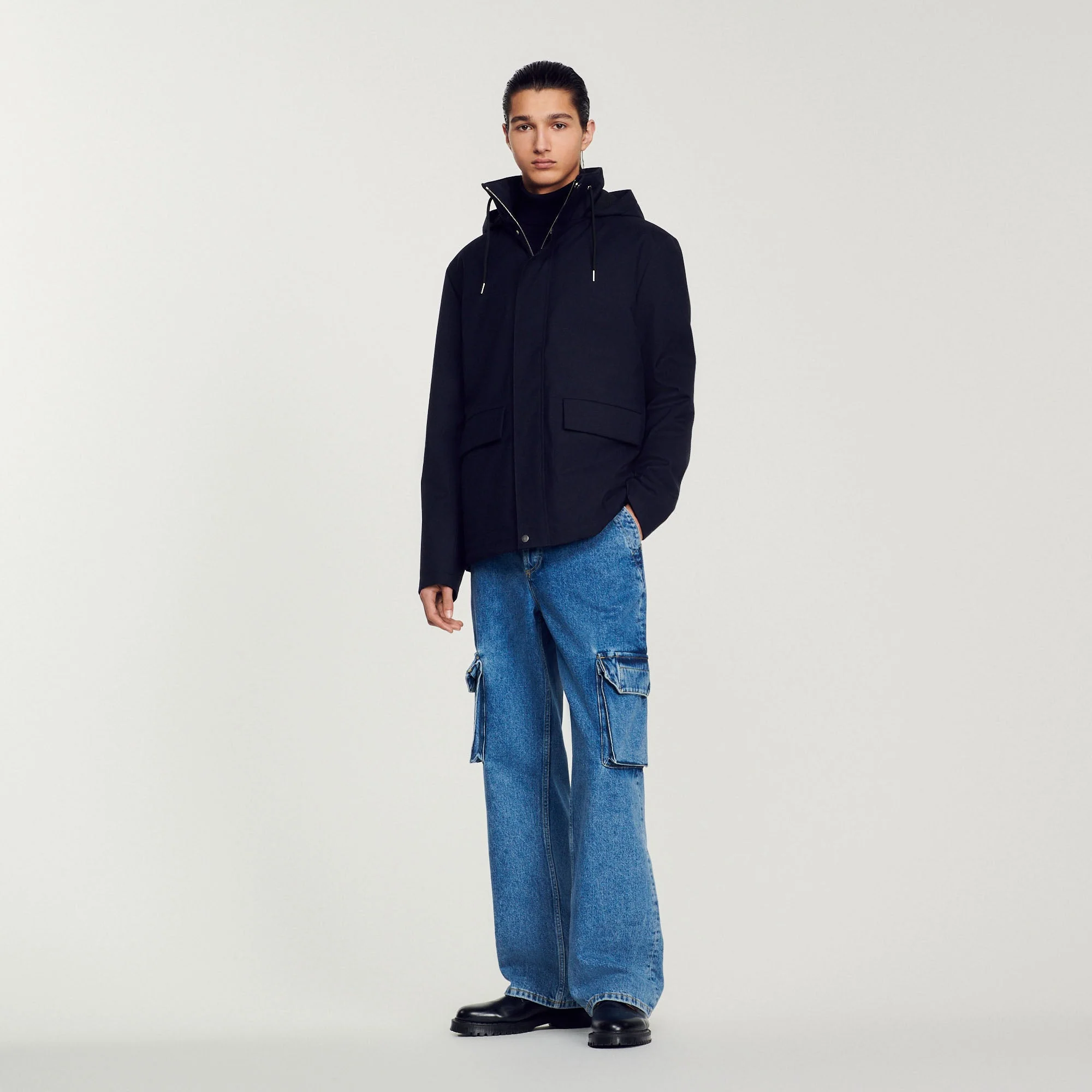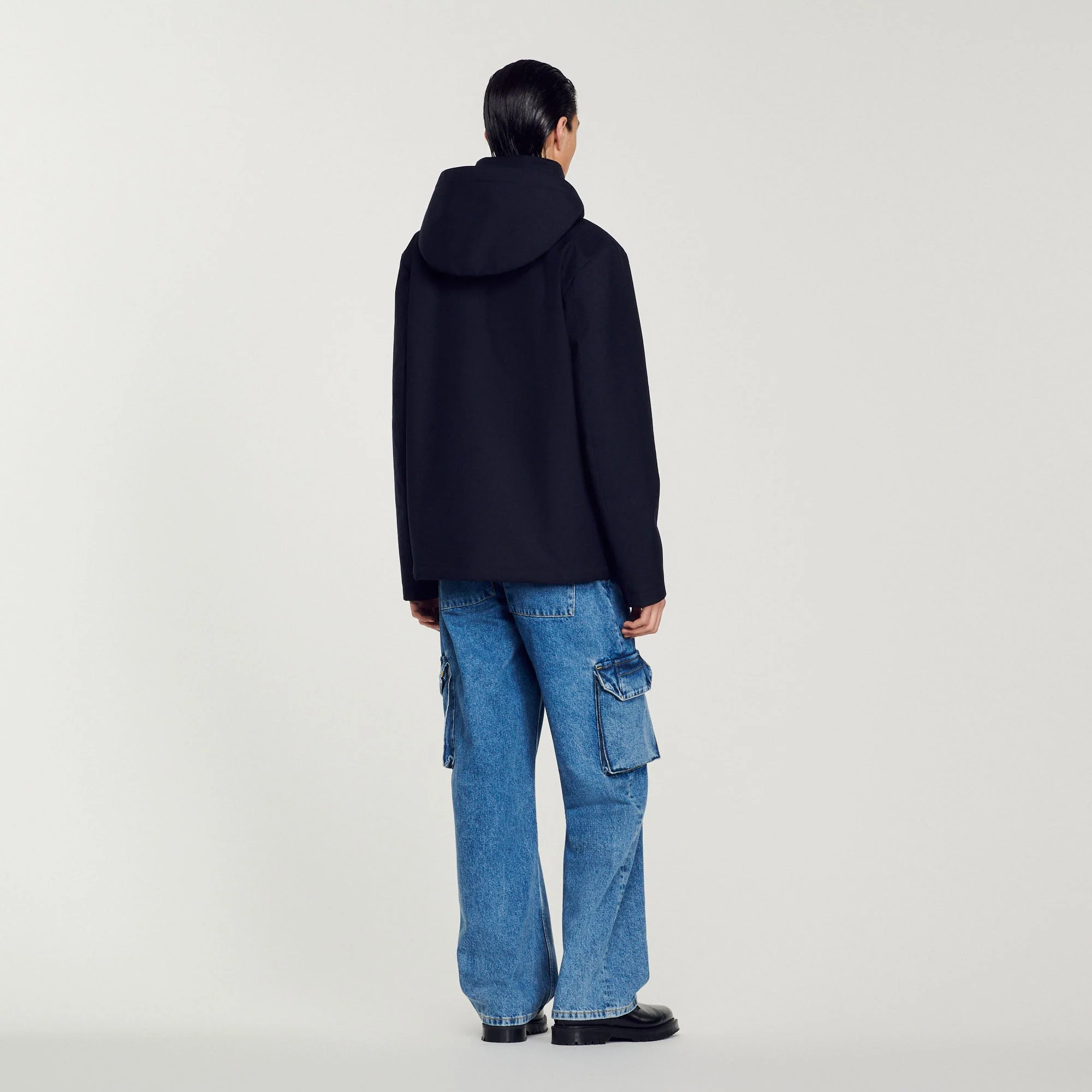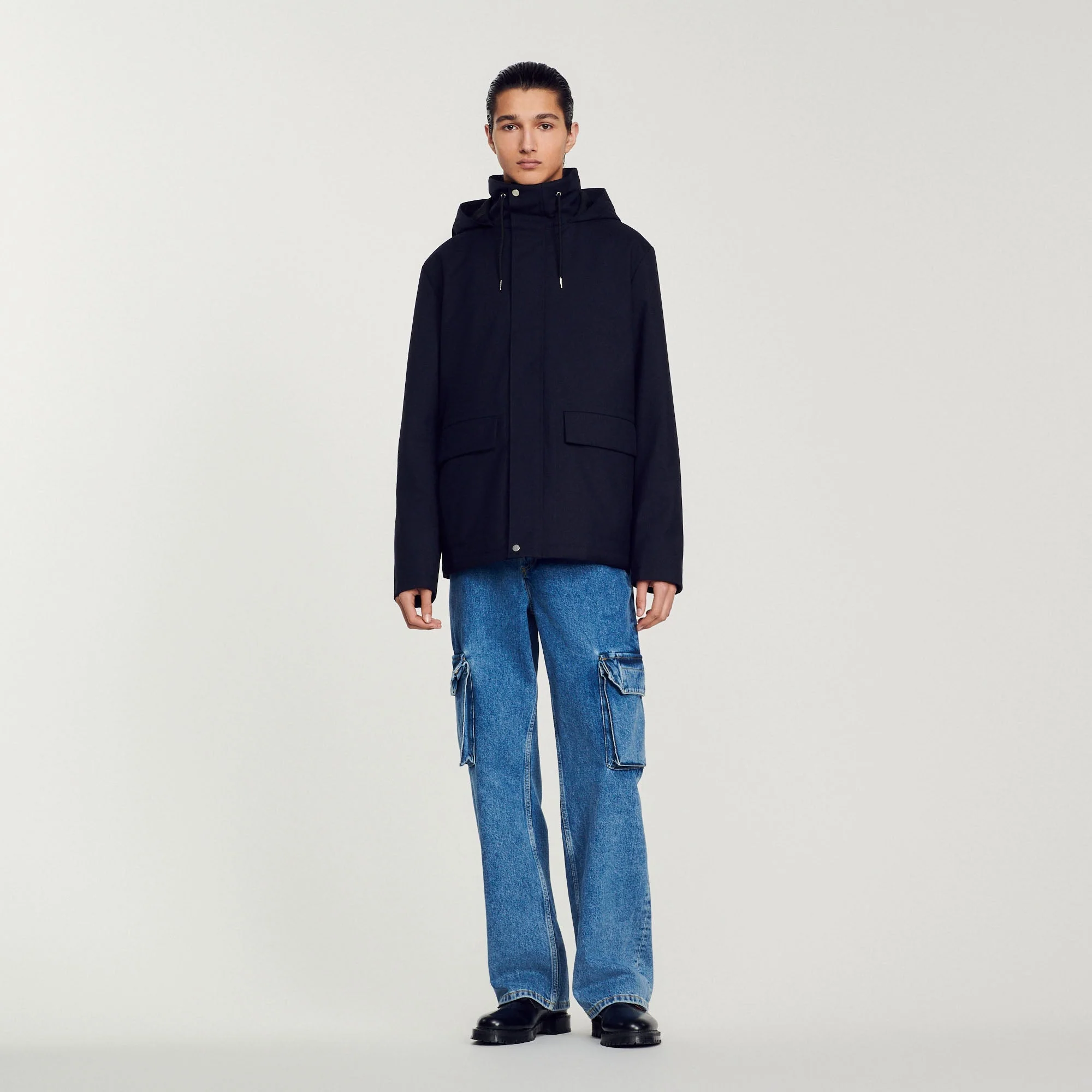 Abrigo de tejido técnico japonés de manga larga con cierre de cremallera y tapeta de botones recubierta, provisto de una capucha con cordones de ajuste y bolsillos ribeteados.• Abrigo de tejido técnico Sandro de hombre