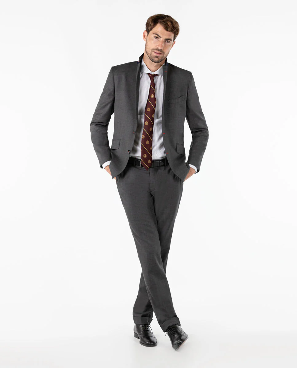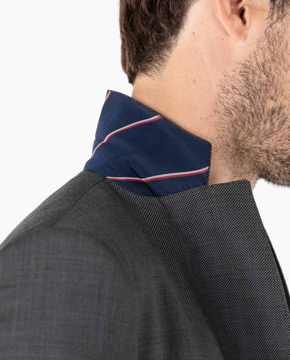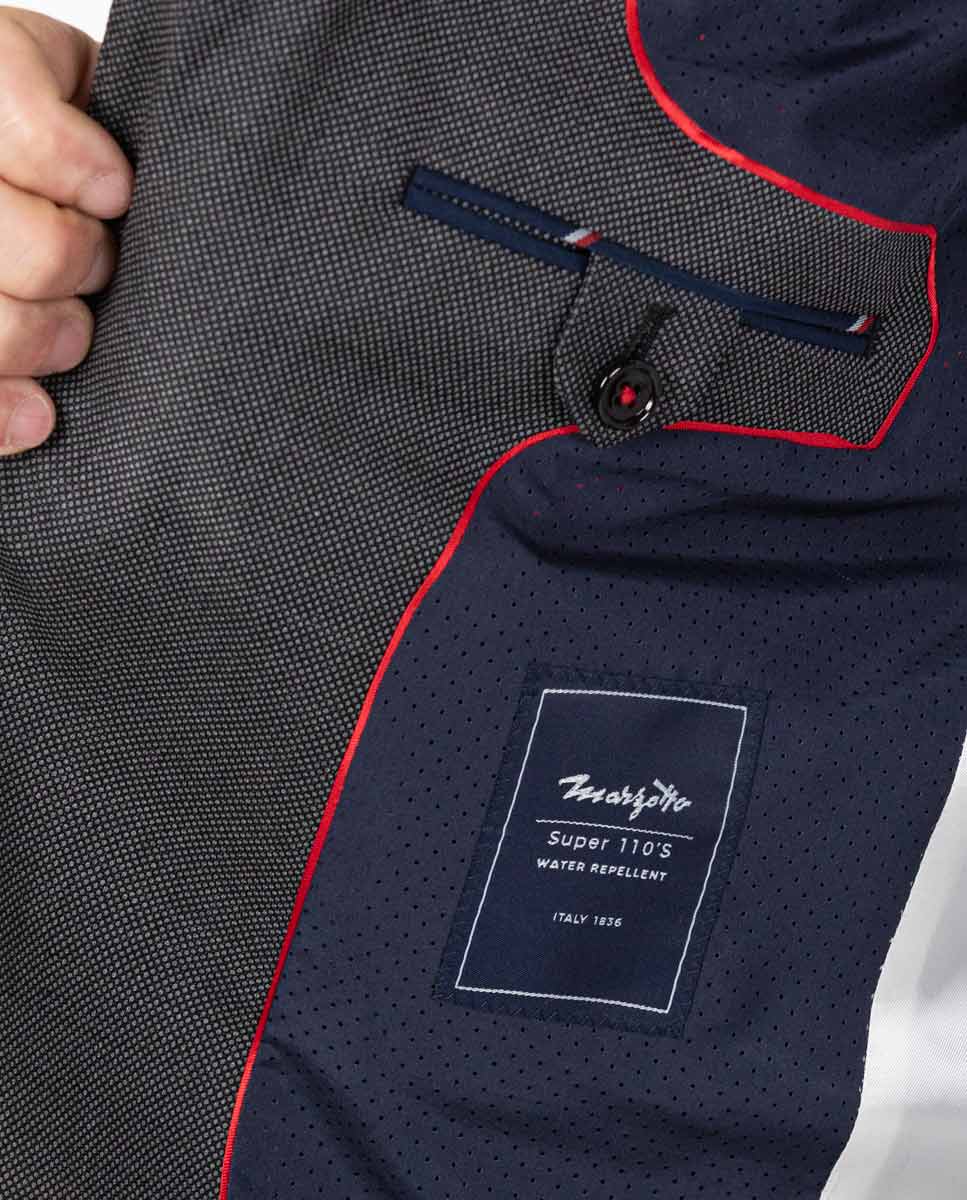 Americana ojo de perdiz gris confeccionada en 100% lana del fabricante italiano Marzotto con un acabado repelente al agua. Corte Slim Fit, cuello con solapas de muesca y cierre con botones. Bolsillos de solapa en cadera, un bolsillo insertado a la altura del pecho. Puño de 4 botones. Dos aberturas en la parte posterior. Detalle de tejido corbatero de rayas en el interior del cuello. Hecha en Portugal.