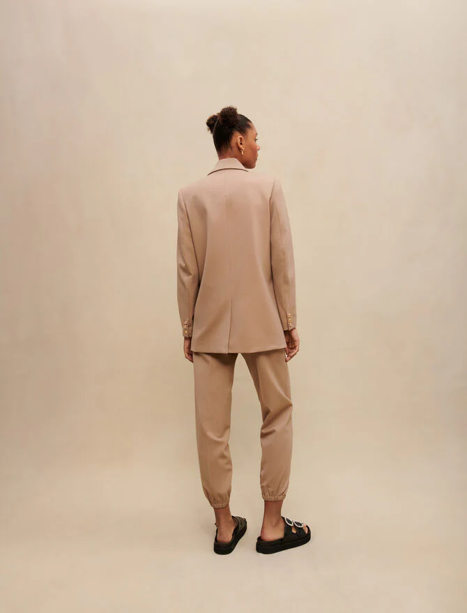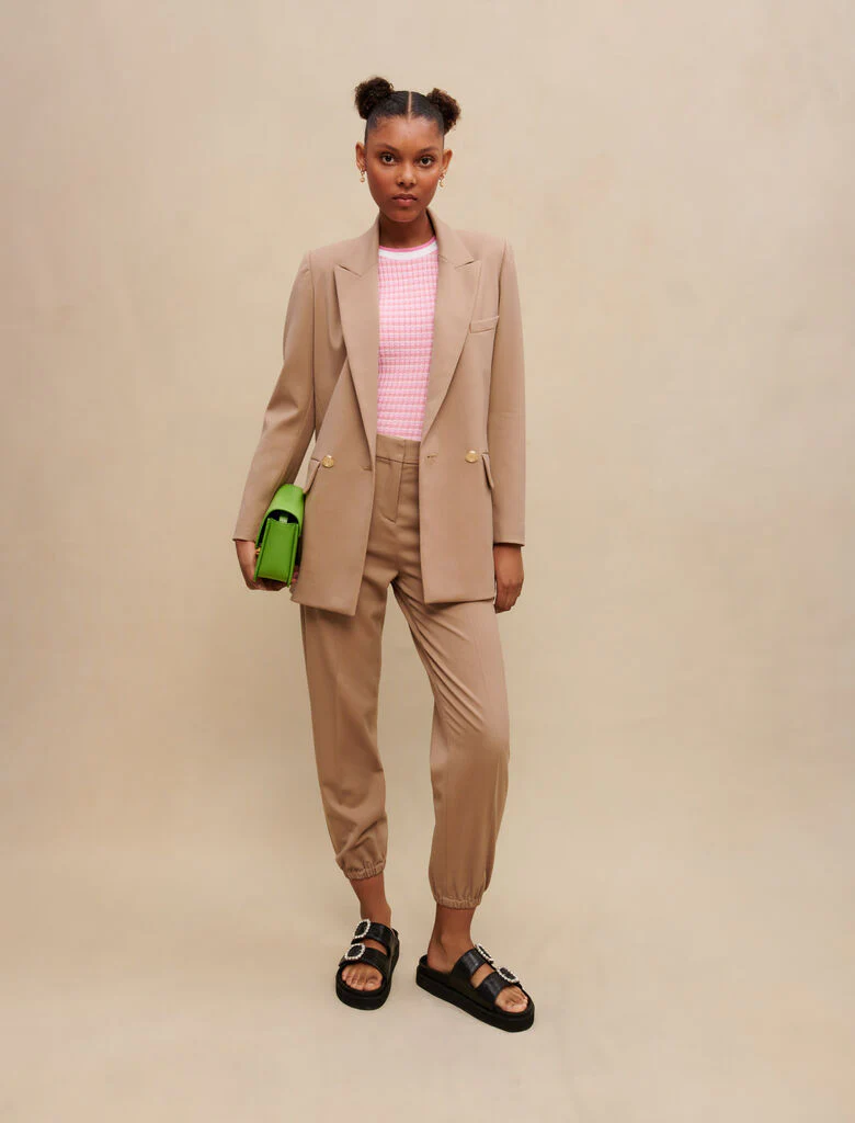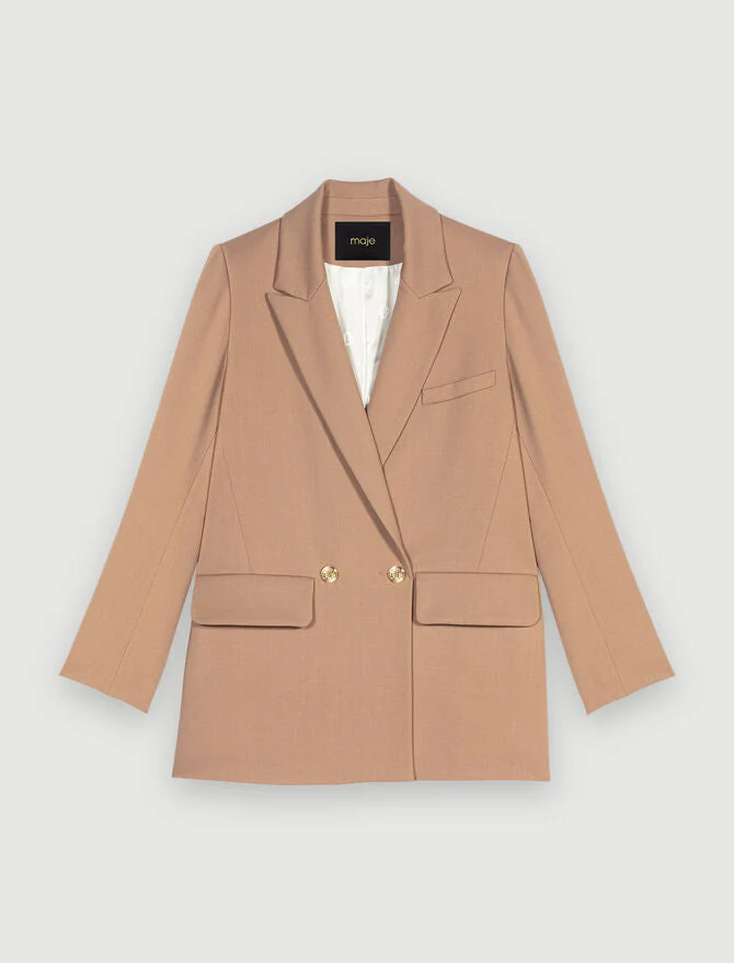 Elegante y estructurada, esta chaqueta de traje es ideal para cualquier temporada. Con botonadura cruzada, cuello ancho y manga larga, combina con todos los estilos y queda muy elegante.Ref.: MFPVE00458El tejido principal de esta prenda está fabricado con al menos un 50% de poliéster reciclado. Un nuevo hilo fabricado a partir de residuos plásticos o textiles, para una mayor circularidad.En Maje, imaginamos el futuro. Compartimos el objetivo de reducir, un poquito más cada temporada, el impacto en el medio ambiente de las prendas que diseñamos.