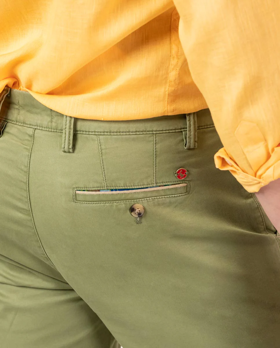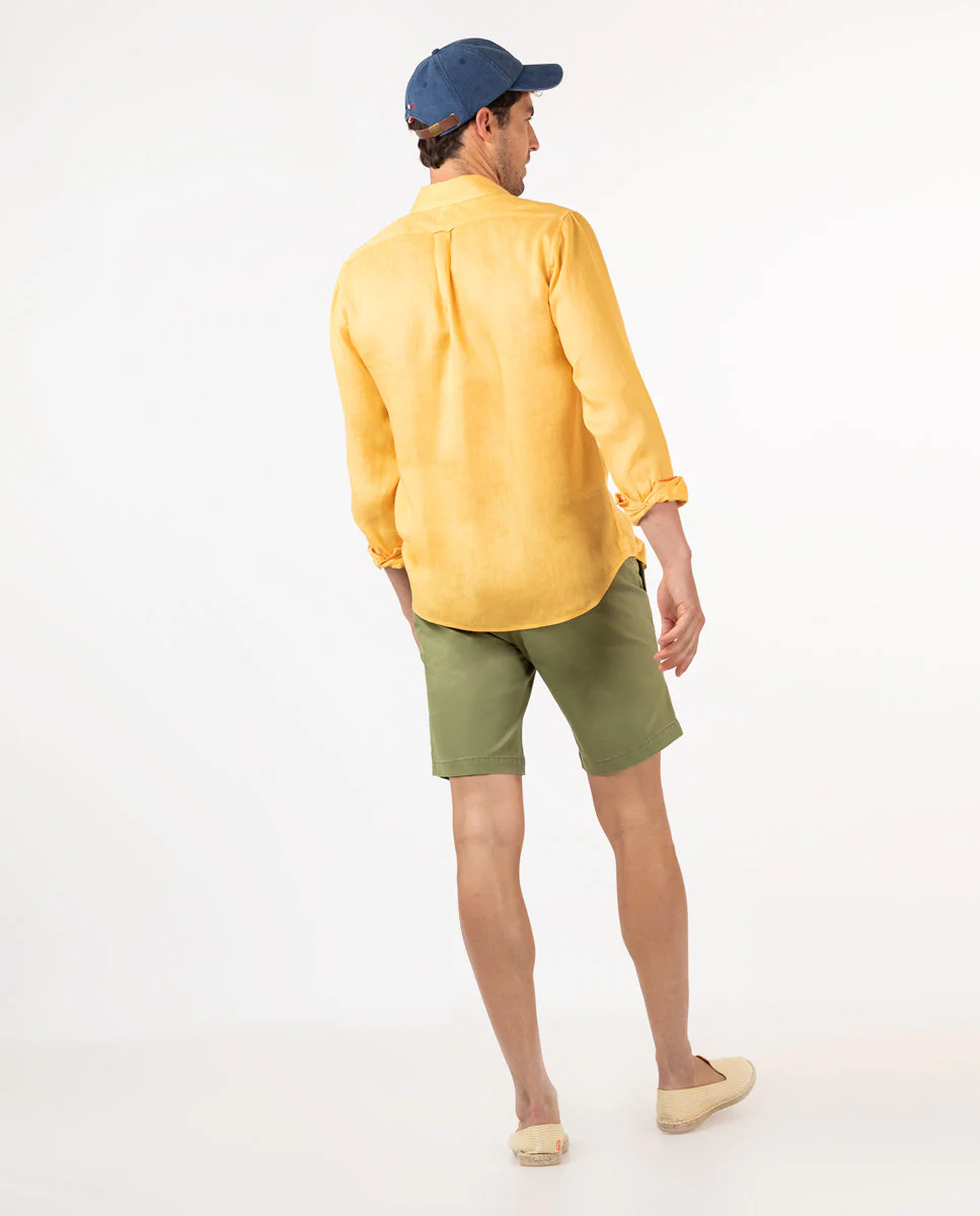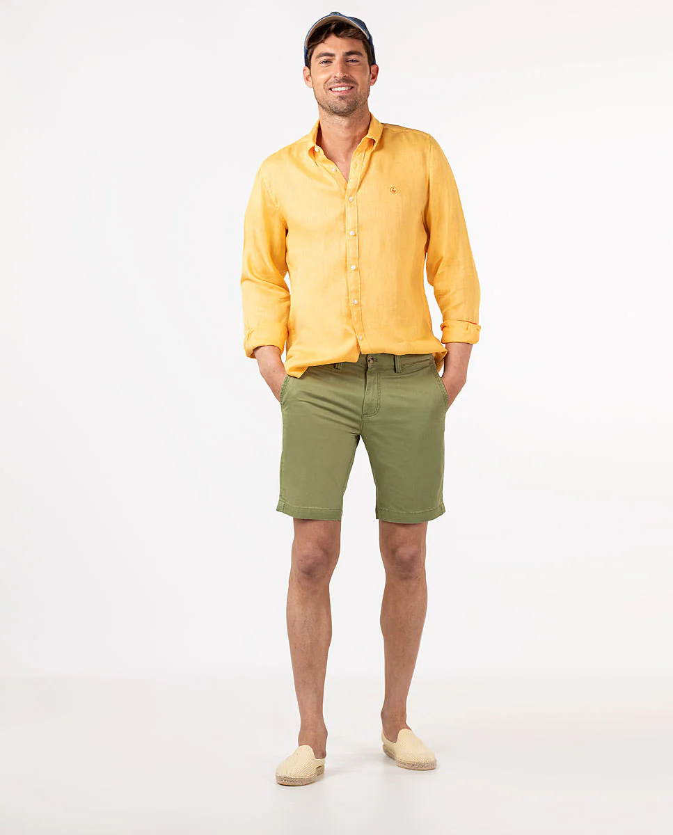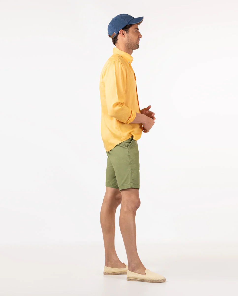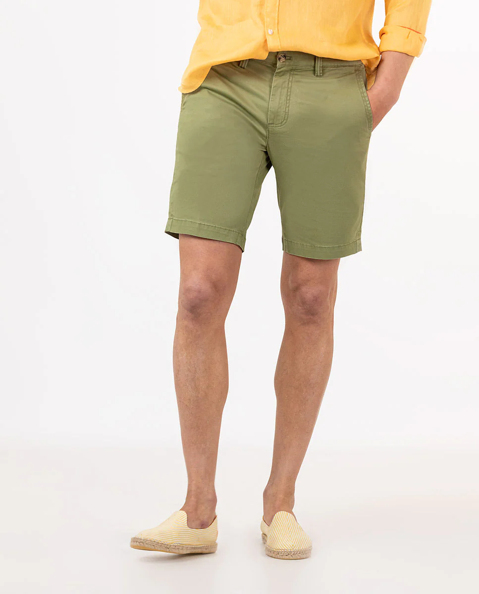 Bermuda de hombre lisa de tejido algodón reciclado, algodón BCI y elastán. Corte Regular Fit, cierre mediante cremallera oculta por tapeta y botón. Tiene dos bolsillos laterales y bolsillos traseros con cintas insertadas. Trabillas para el cinturón y tiene el chapón del logo cosido encima del bolsillo trasero. Incluye cinturón de canvas. Esta prenda irá tratada con un lavado enzimático que hará que todas las costuras den ese aspecto «vintage» que tan onos caracteriza. Composición: 97% Algodón, 3% Elastano