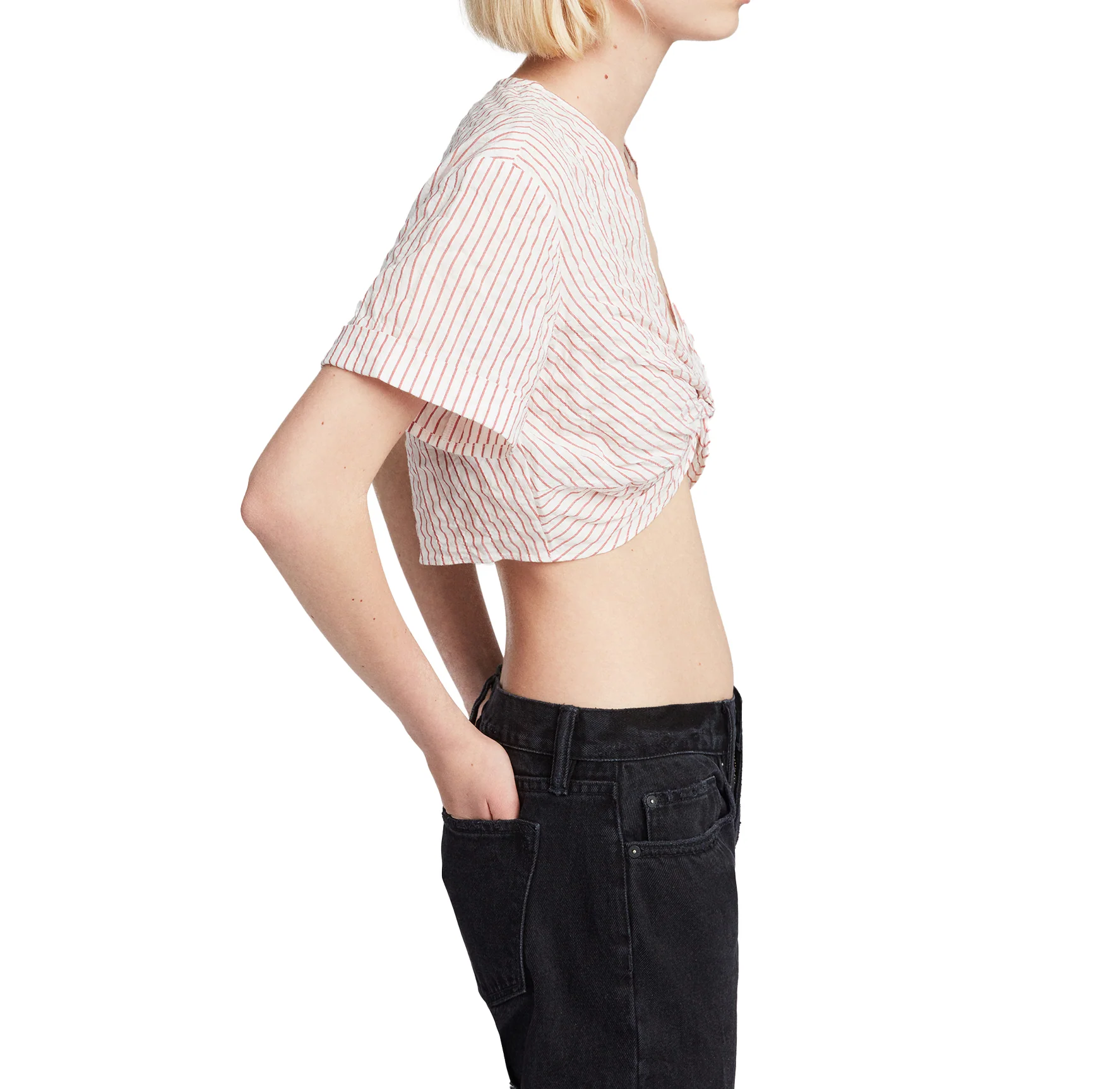 BLUSA ALANA, MARCA ALLSAINTS. TOP MANGA CORTA ESCOTE EN V, PLIEGUE FRONTAL, RAYADO. 99% ALGODÓN, 1% SPANDEX. LAVAR A MÁQUINA AL REVÉS.
