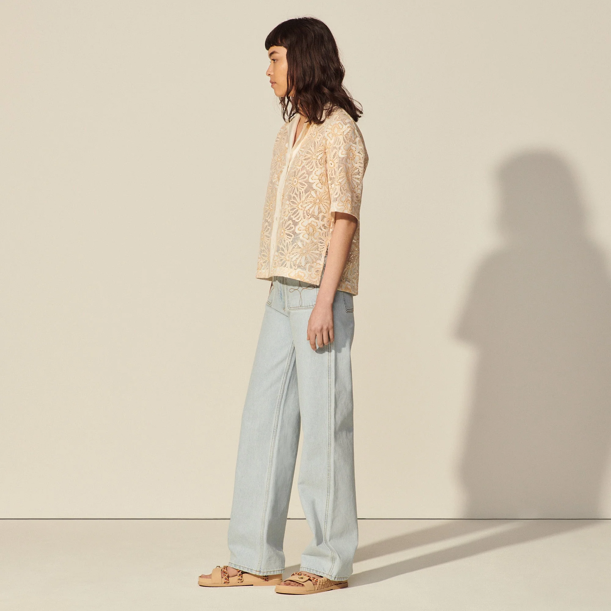 Camisa Amarine Ecru Con Amarillo. Camisa de mujer Sandro • Camisa de encaje de rejilla margarita • Cuello con muescas • Detalles en contraste • Manga corta • Corte recto y amplio • Cierre de botones en la parte delantera • La modelo lleva la talla 1 Référence : SFPCM00436COMPOSICIÓN Tejido principal: 100% poliéster Tissu Secondaire: 93% viscosa, 7% seda Botones: 100% nácar