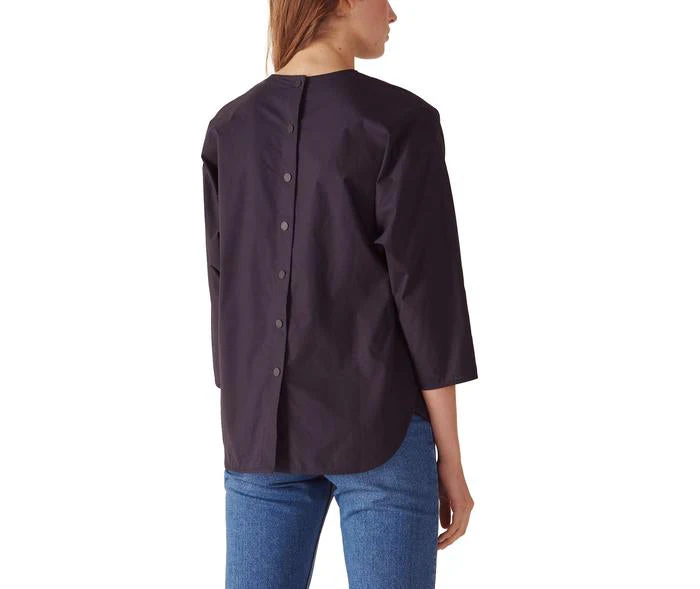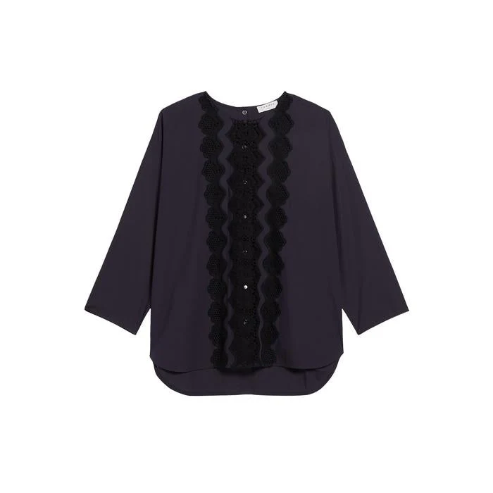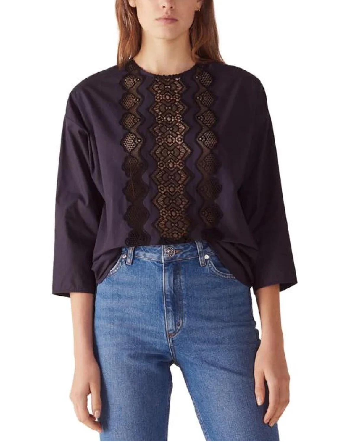 BLUSA CUELLO REDONDO, MANGA 3/4, ENCAJE AL FRENTE Y BOTONES TRASEROS, MARCA SANDRO. CONSULTAR COMPOSICIÓN E INSTRUCCIONES DE LAVADO EN ETIQUETA INTERNA.