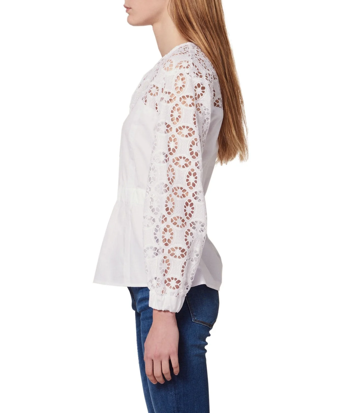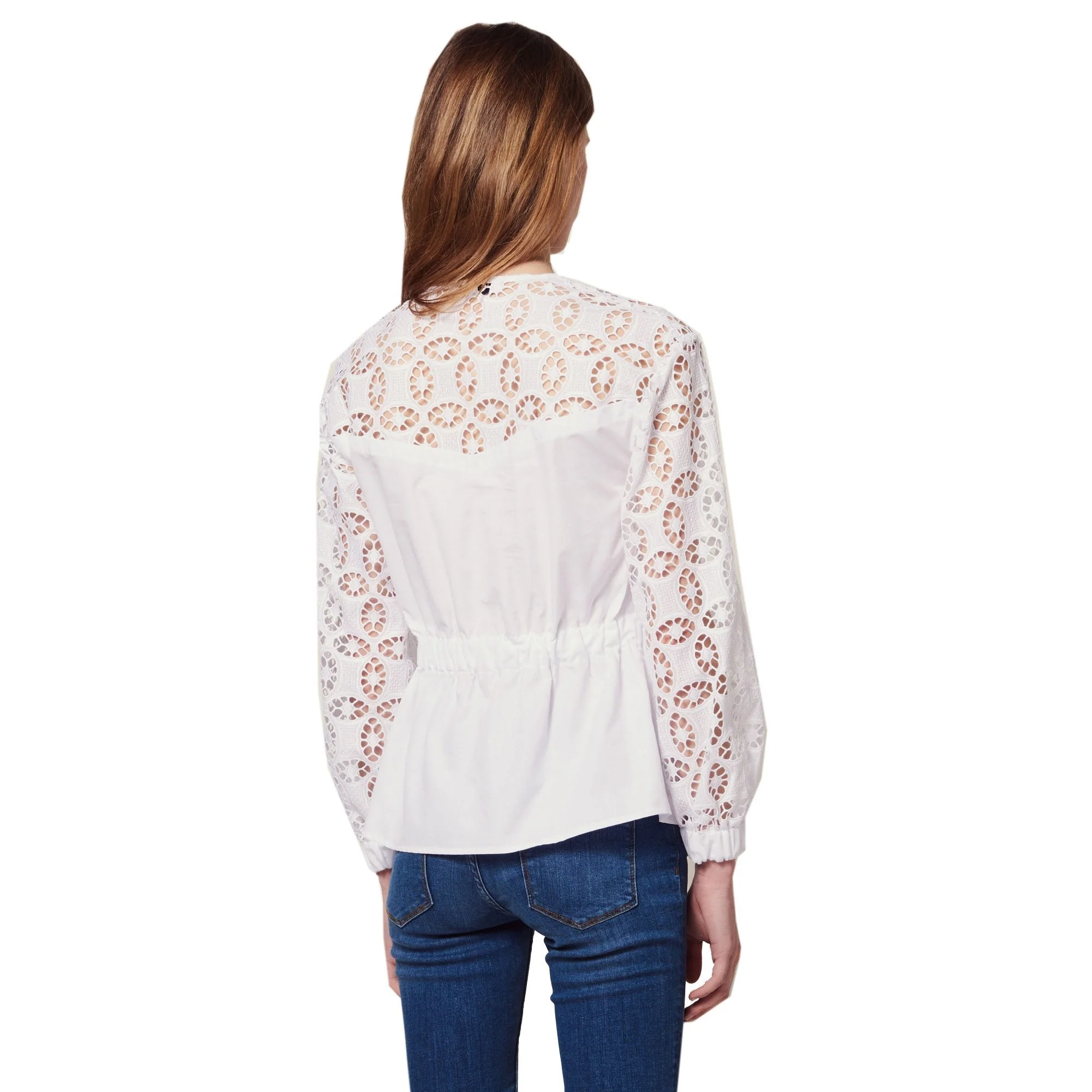 BLUSA MANGA LARGA EN TELA GIPIUR CON AJUSTE EN CINTURA, MARCA SANDRO. 100% ALGODÓN. LAVADO A MANDO DELICADO, SIN BLANQUEADOR, NO SECADORA. REVISAR ETIQUETA INTERNA DE LAVADO PARA MÁS INFORMACIÓN..