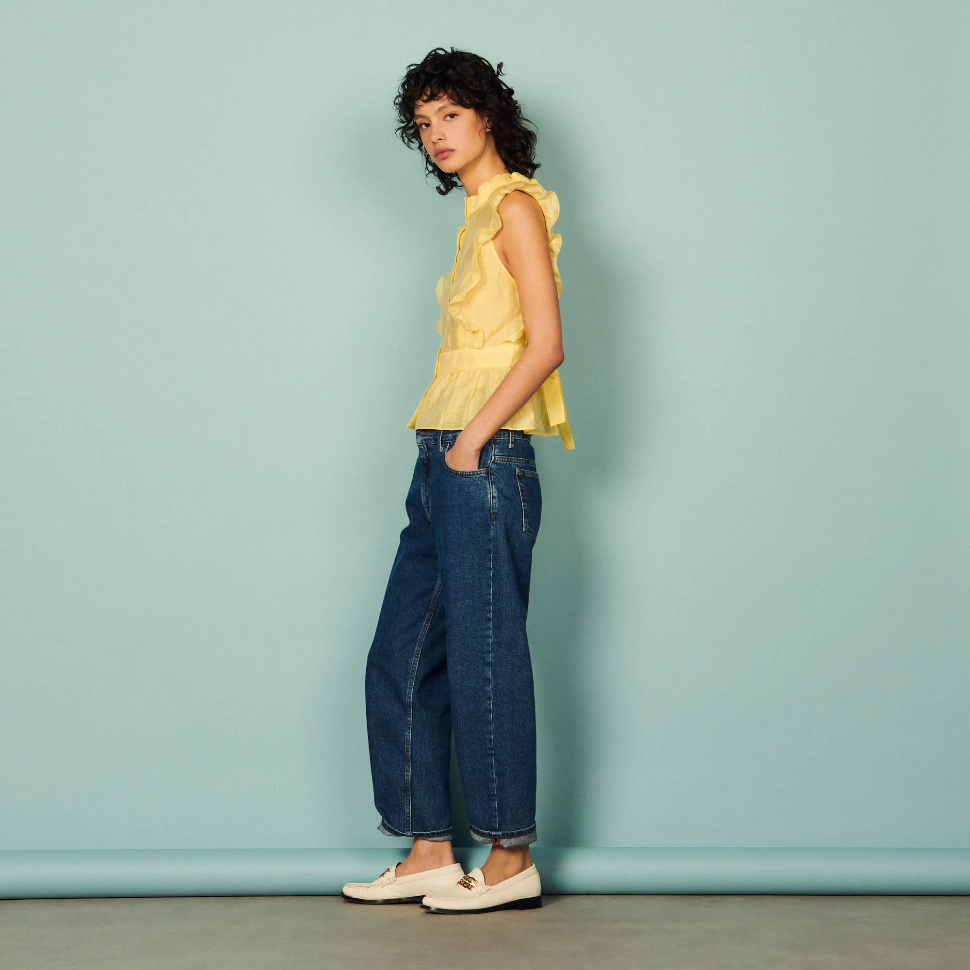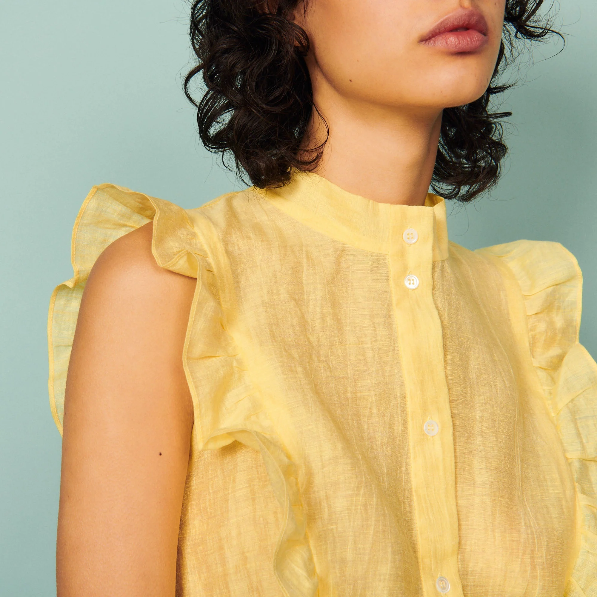 Blusa sin mangas sublimada con volantes y un faldón en la cintura, con una tapeta de botones, lazos anudables y una abertura en la espalda.• Blusa avolantada Sandro de mujer