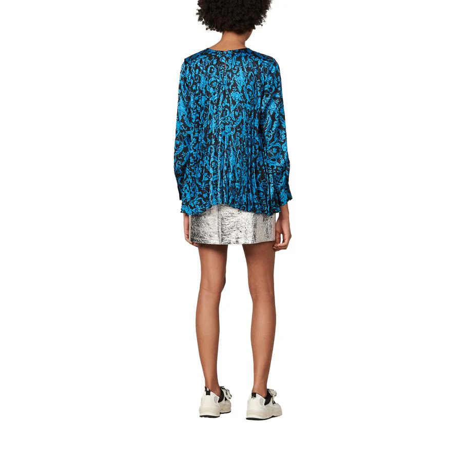 BLUSA MANGA LARGA ESTAMPADA DRAPEADA CON CUELLO REDONDO. 100% POLIÉSTER. LAVADO A MANDO DELICADO, SIN BLANQUEADOR, NO SECADORA. REVISAR ETIQUETA INTERNA DE LAVADO PARA MÁS INFORMACIÓN.
