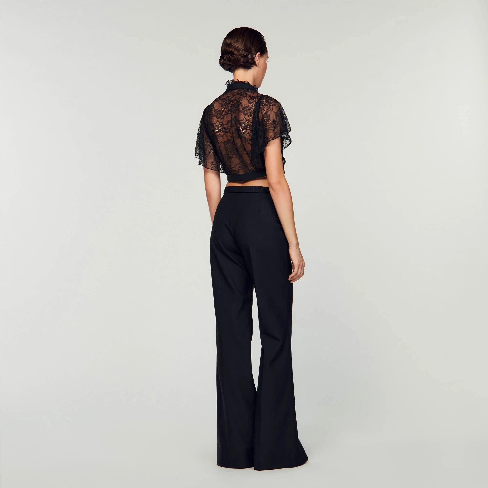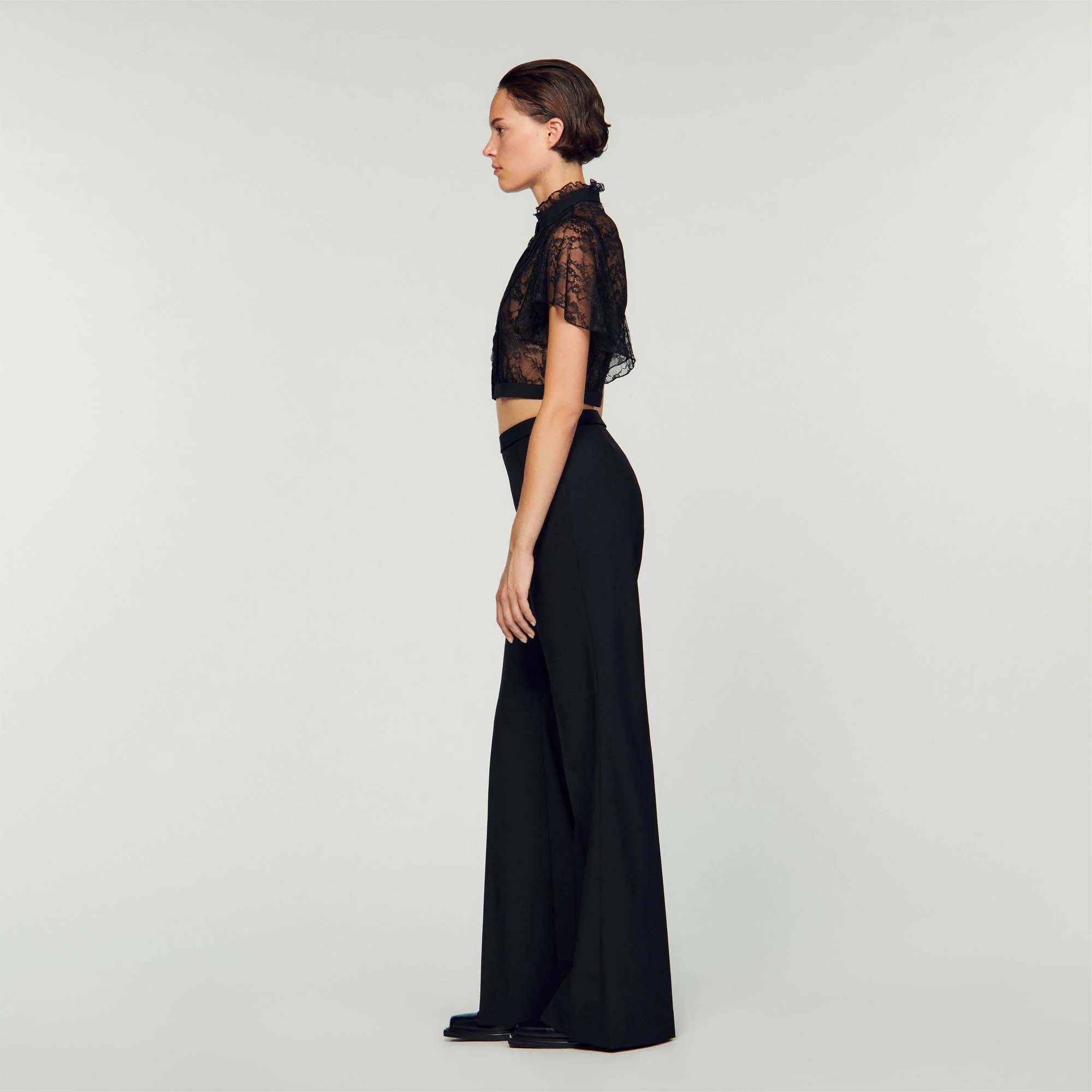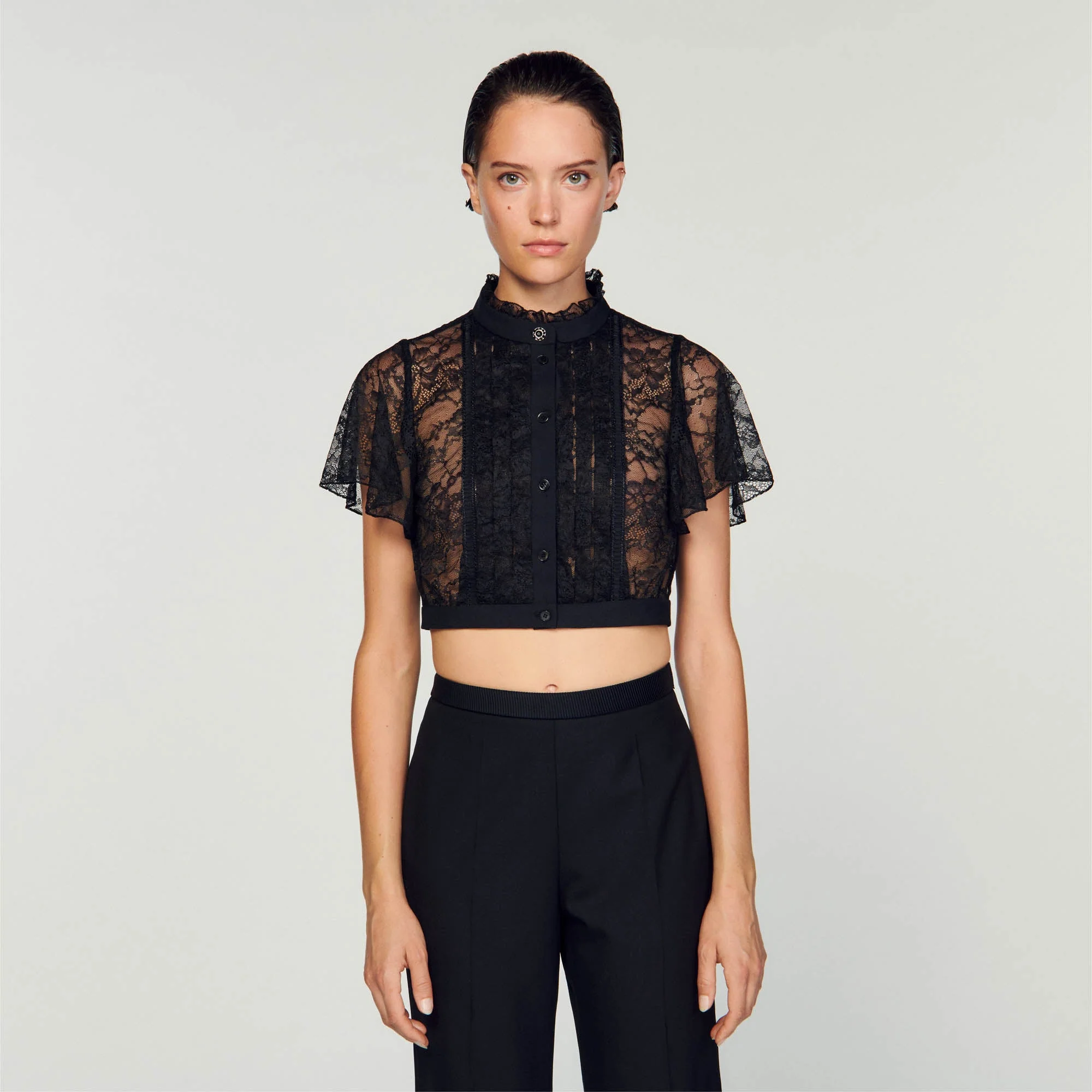 Blusa corta de encaje transparente decorada con franjas satinadas por delante, con manga corta con volante y cuello alto con volantes y botón joya.• Blusa corta de encaje Sandro Mujer