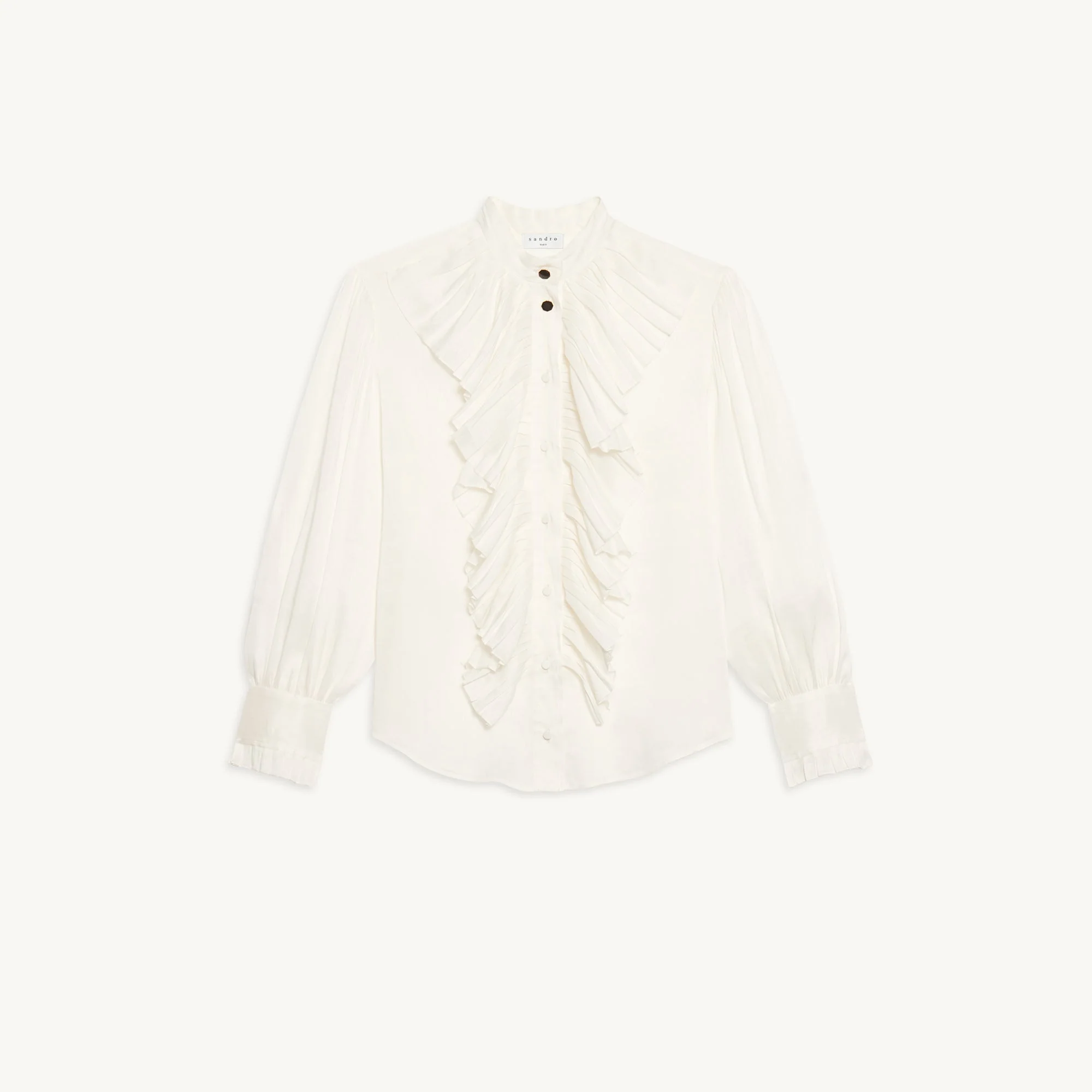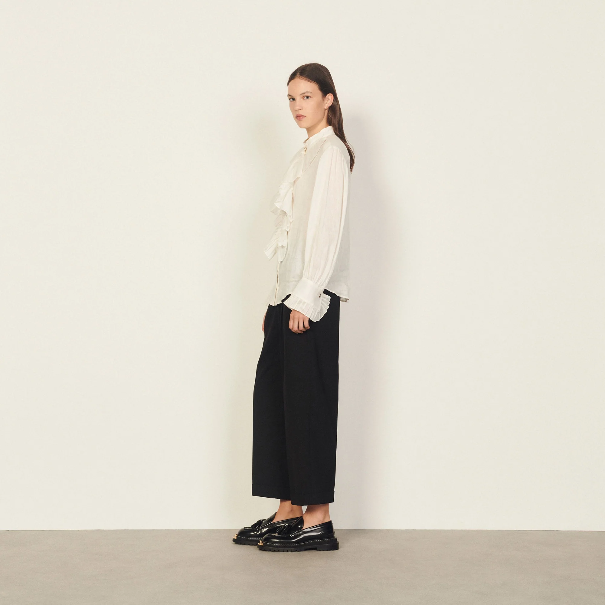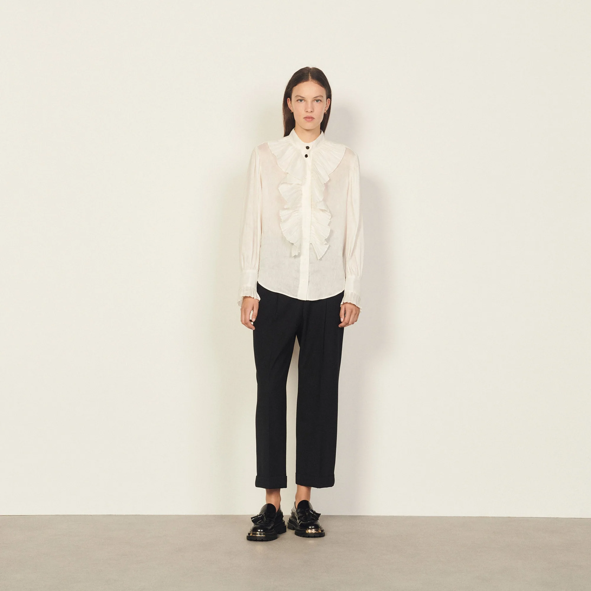 Camisa De Mujer Sandro Camisa Fluida De Lino Y Seda Pronunciado Escote Con Cuello Abotonado Botonadura Bordada Por Frunces Y Volantes Manga Larga Corte Recto La Modelo Lleva La Talla 1 Sfpcm00477 Tejido Principal: 85% Lino, 15% Seda Botones: 100% Nácar