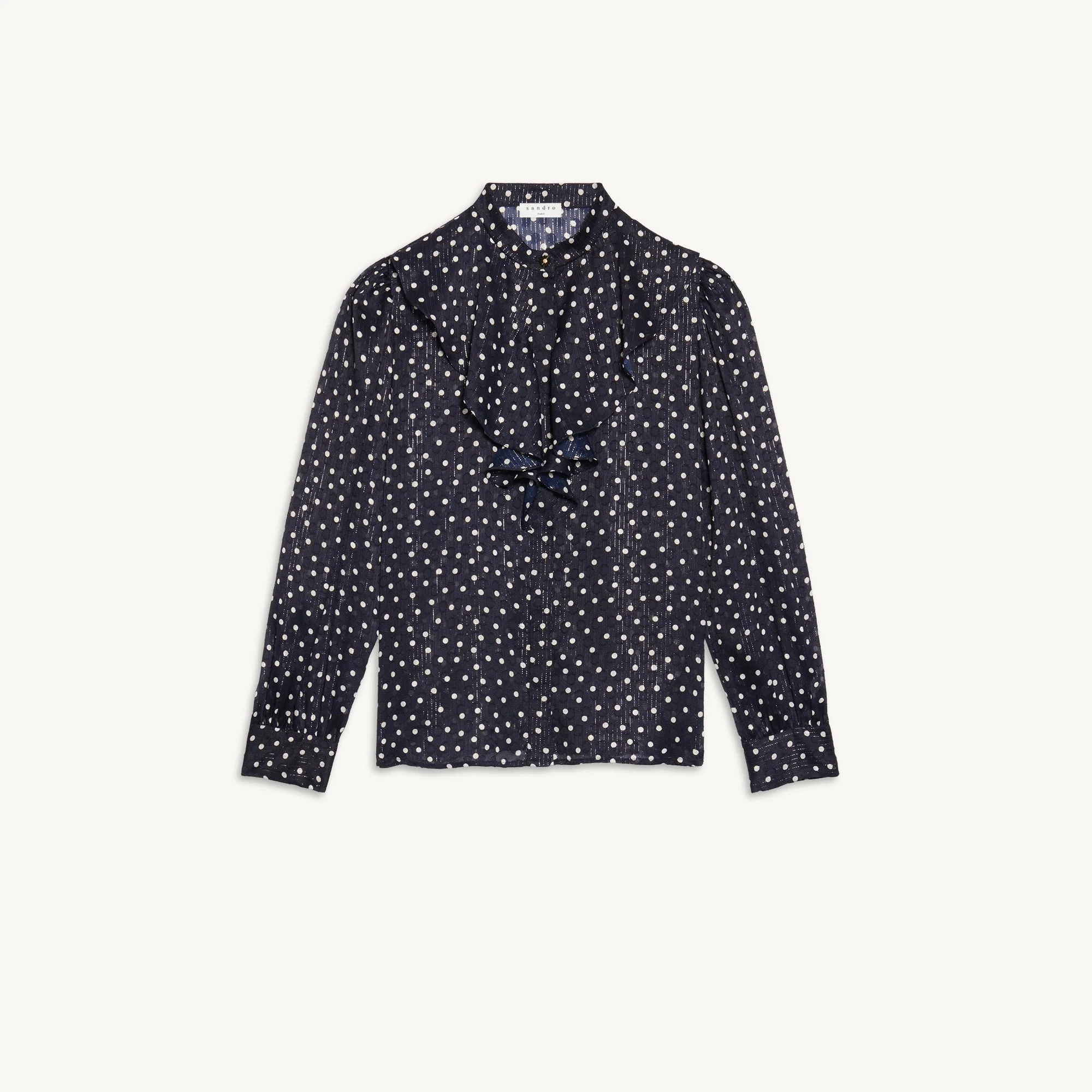 Camisa De Mujer Sandro Camisa De Seda Estampada Cuello Camisero Manga Larga Con Puño Corte Recto Botonadura En La Parte Delantera La Modelo Lleva La Talla 1Referencia : Sfpcm00536 Tejido Principal: 100% Seda Botones: 100% Nácar