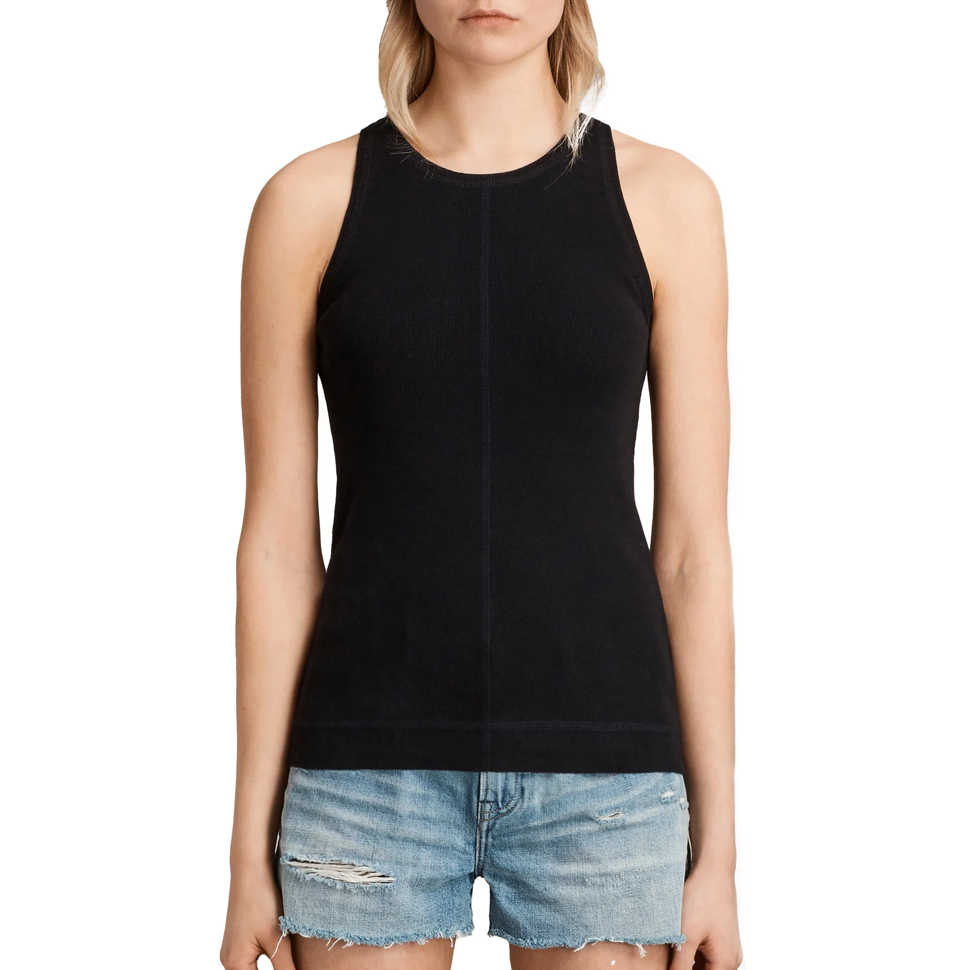 BLUSA JONI, MARCA ALLSAINTS. TOP CUELLO REDONDO SIN MANGAS, COSTURA LÍNEA VERTICAL.
