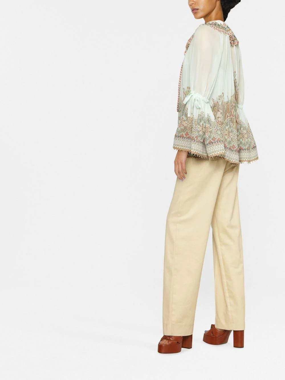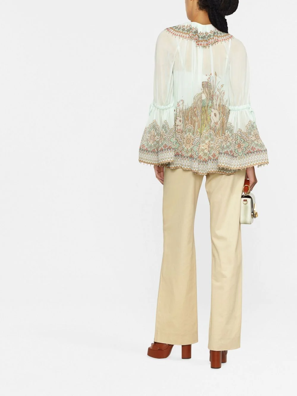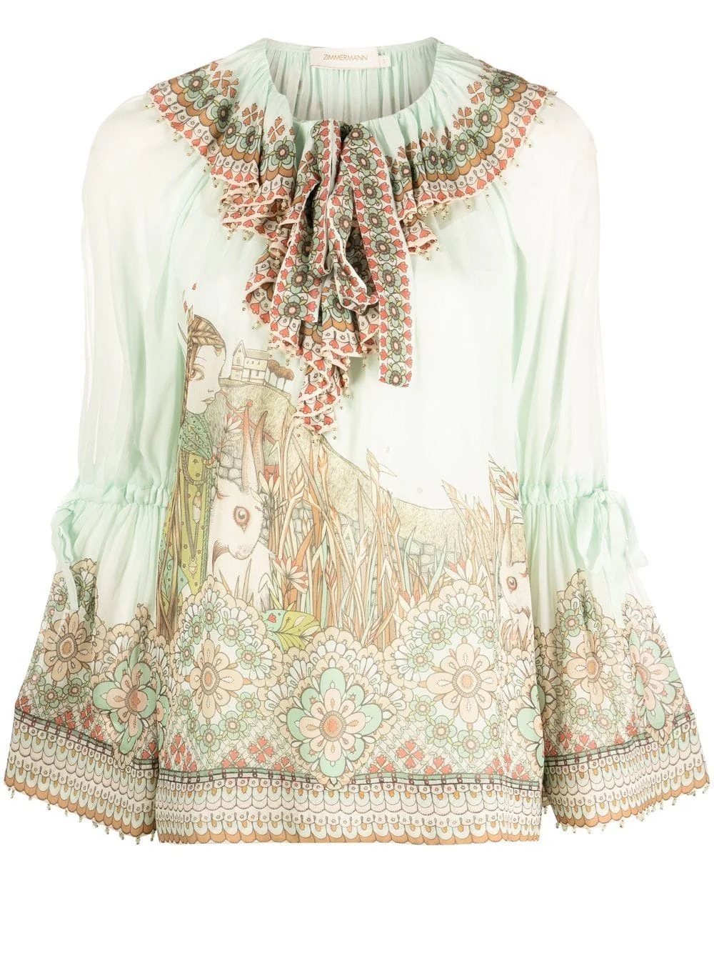Blusa Kaleidoscope Ruffle Azul Claro, marca Zimmermann. Consultar composición y cuidados de lavado en etiqueta interna.