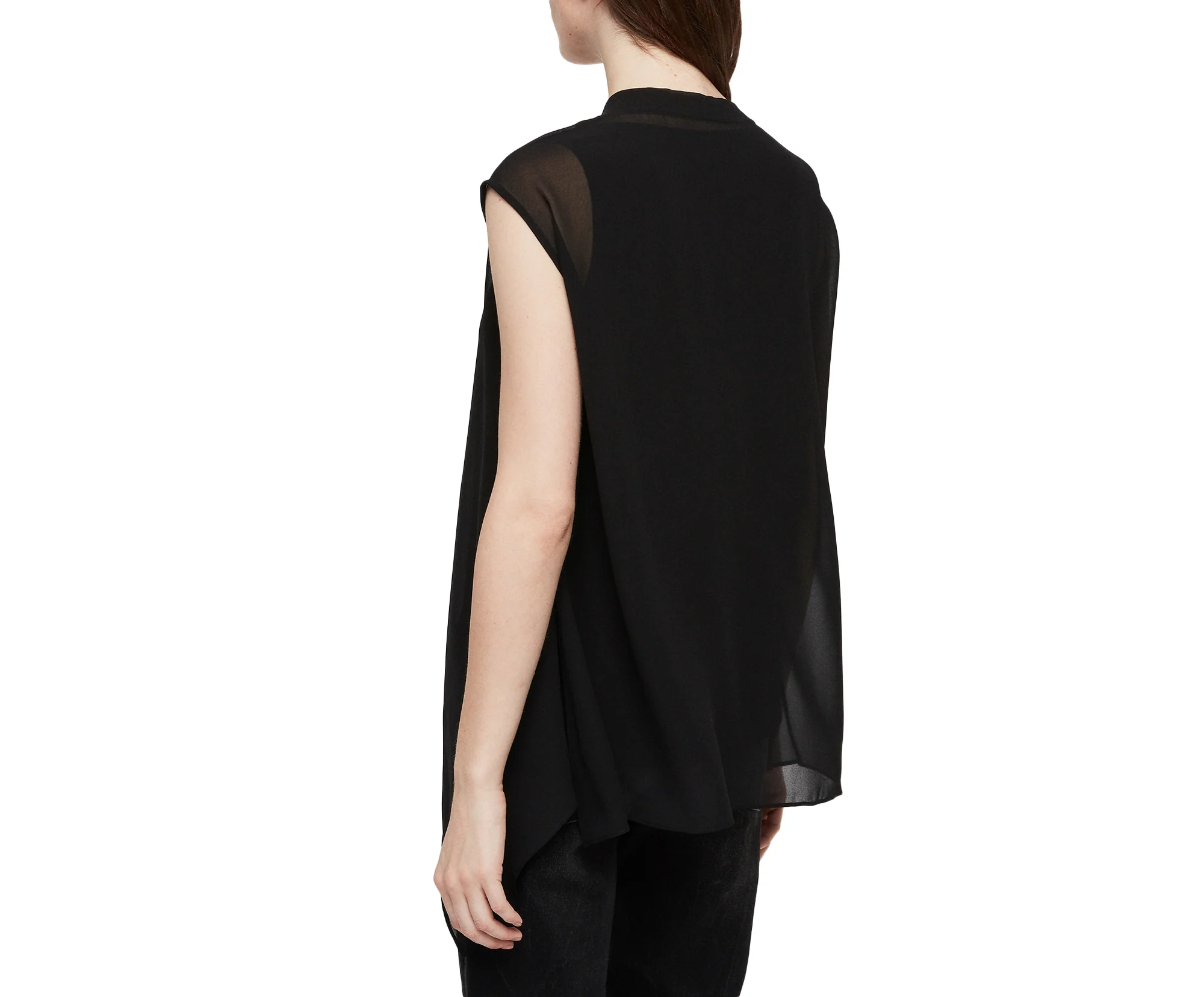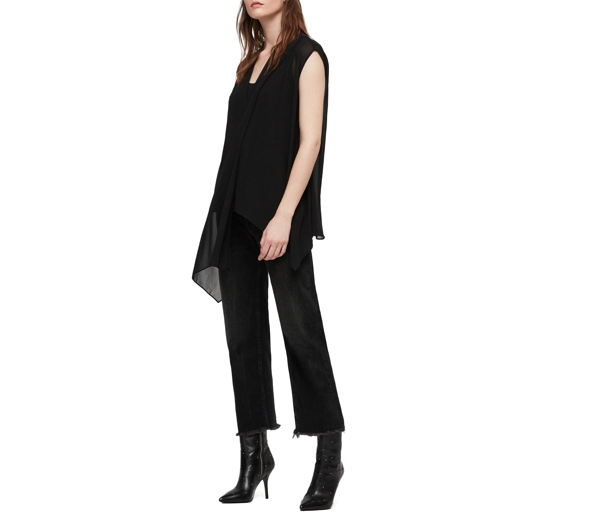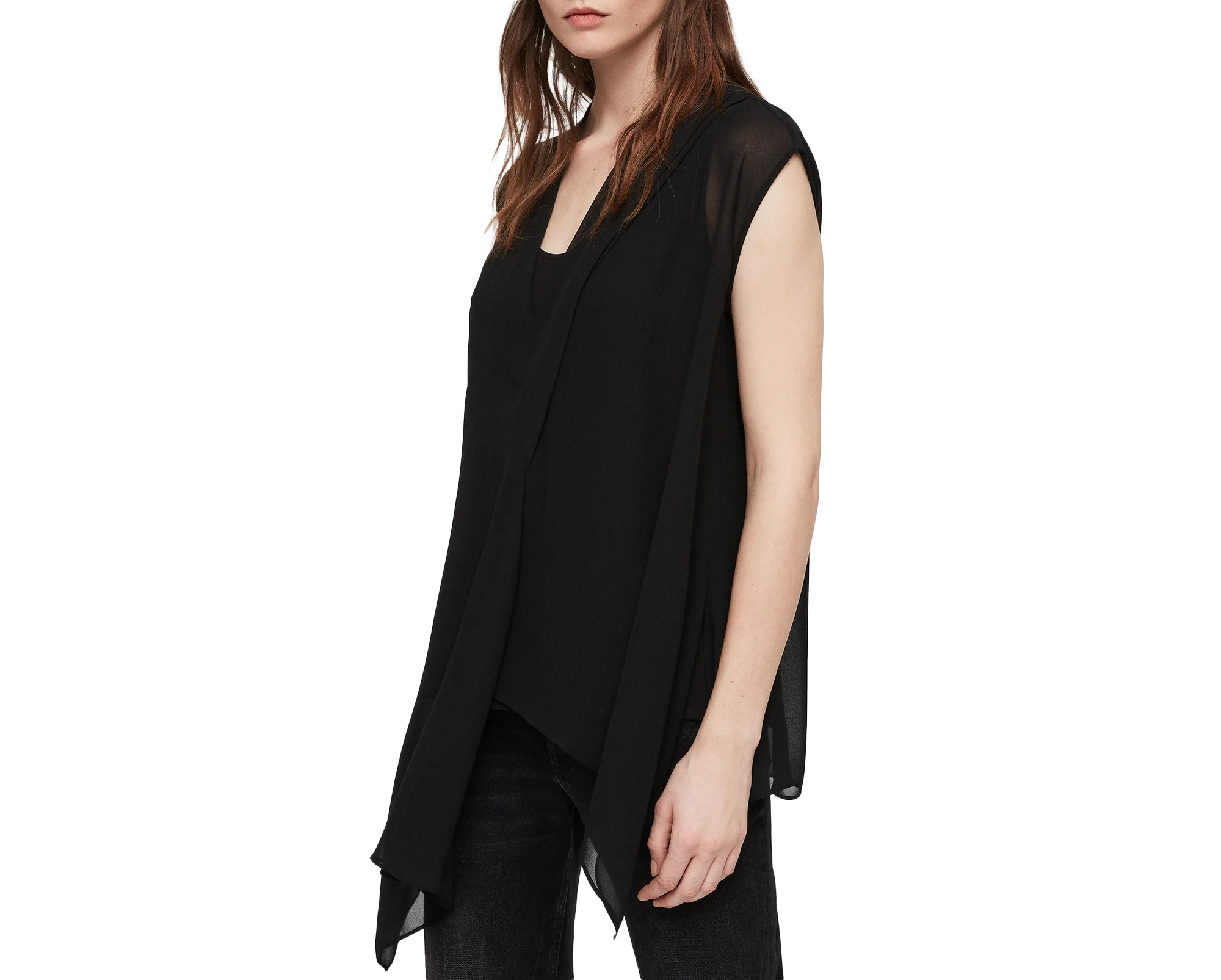 BLUSA KERY, MARCA ALLSAINTS. TOP CUELLO V CORTE FLUÍDO Y ASIMÉTRICO FRONTAL, SIN MANGAS. EXTERIOR: 98% VISCOSA, 2% METÁLICO. PANEL INTERIOR: 97% POLIÉSTER, 3% ELASTANO.. LAVADO EN SECO.