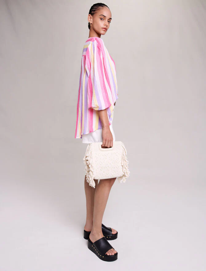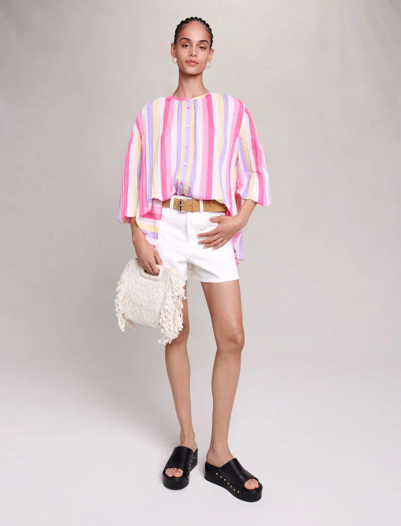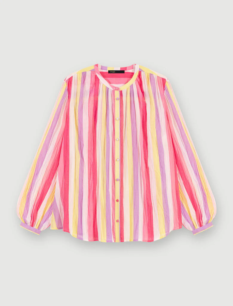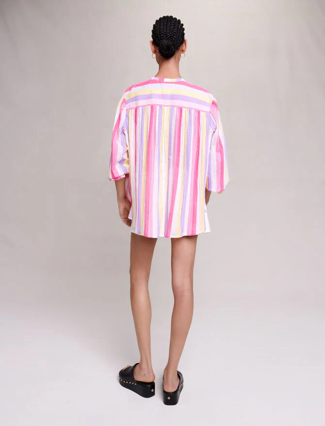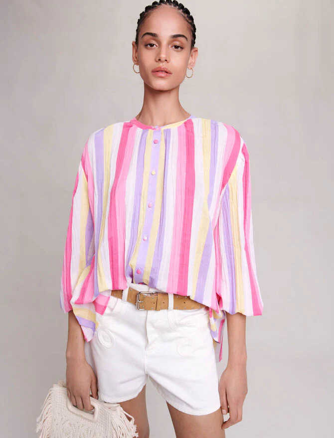 Blusa de gasa de algodón ligera y oversize con mangas largas voluminosas, un estampado de rayas de colores y botones forrados en el cuello. Para combinar con pantalones cortos de mezclilla o sobre un traje de baño, será nuestra gran aliada de los looks de verano.Ref.: MFPCM00427