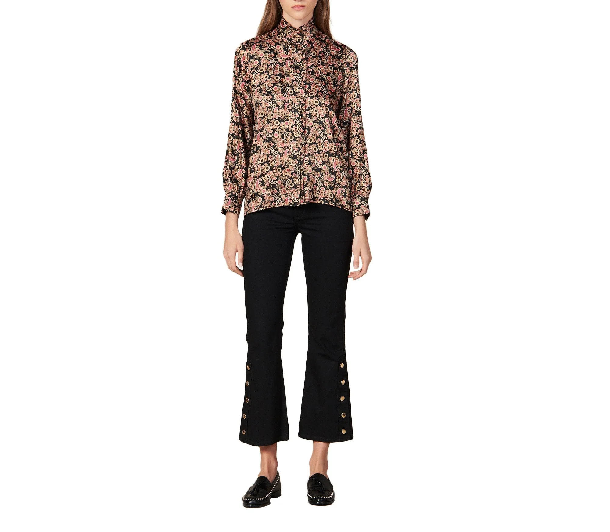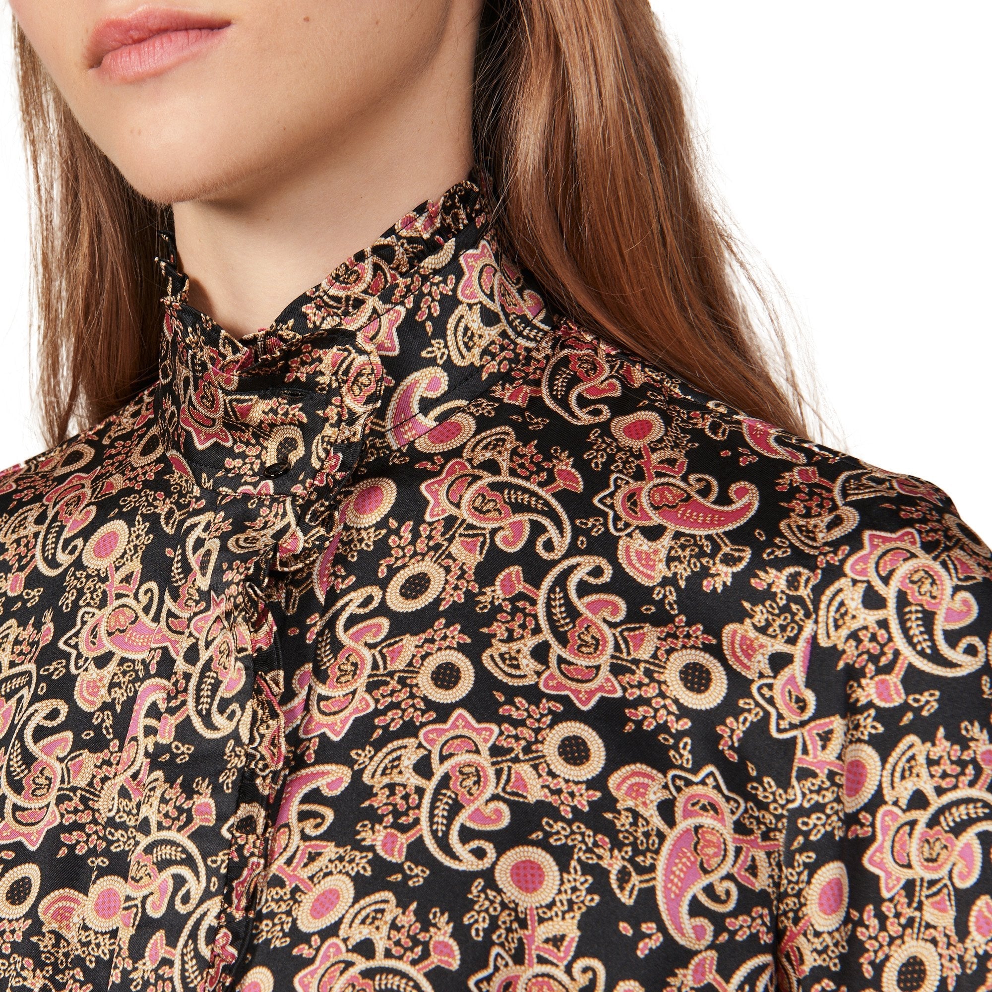 CAMISA CUELLO ALTO ESTAMPADA MANGA LARGA, MARCA SANDRO. 100% POLIÉSTER. LAVADO A MANDO DELICADO, SIN BLANQUEADOR, NO SECADORA. REVISAR ETIQUETA INTERNA DE LAVADO PARA MÁS INFORMACIÓN.