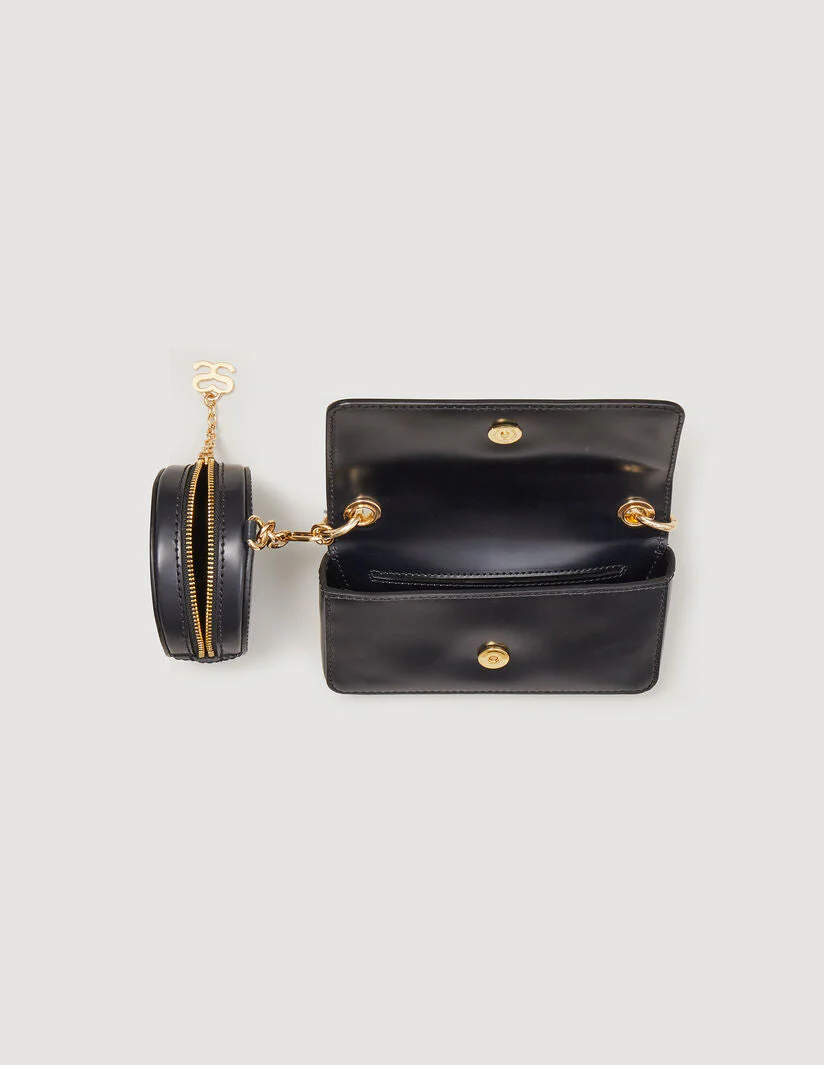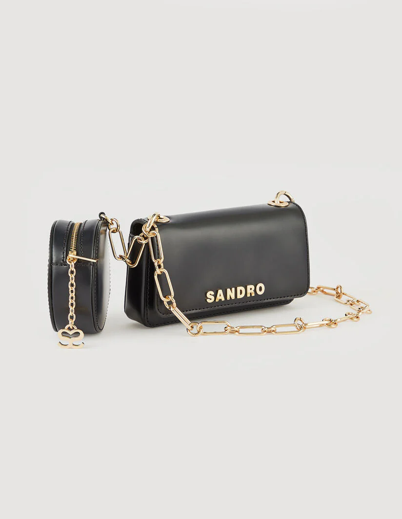 Bolso pequeño con solapa y bandolera de cadena, con pochette redonda con cierre de cremallera.