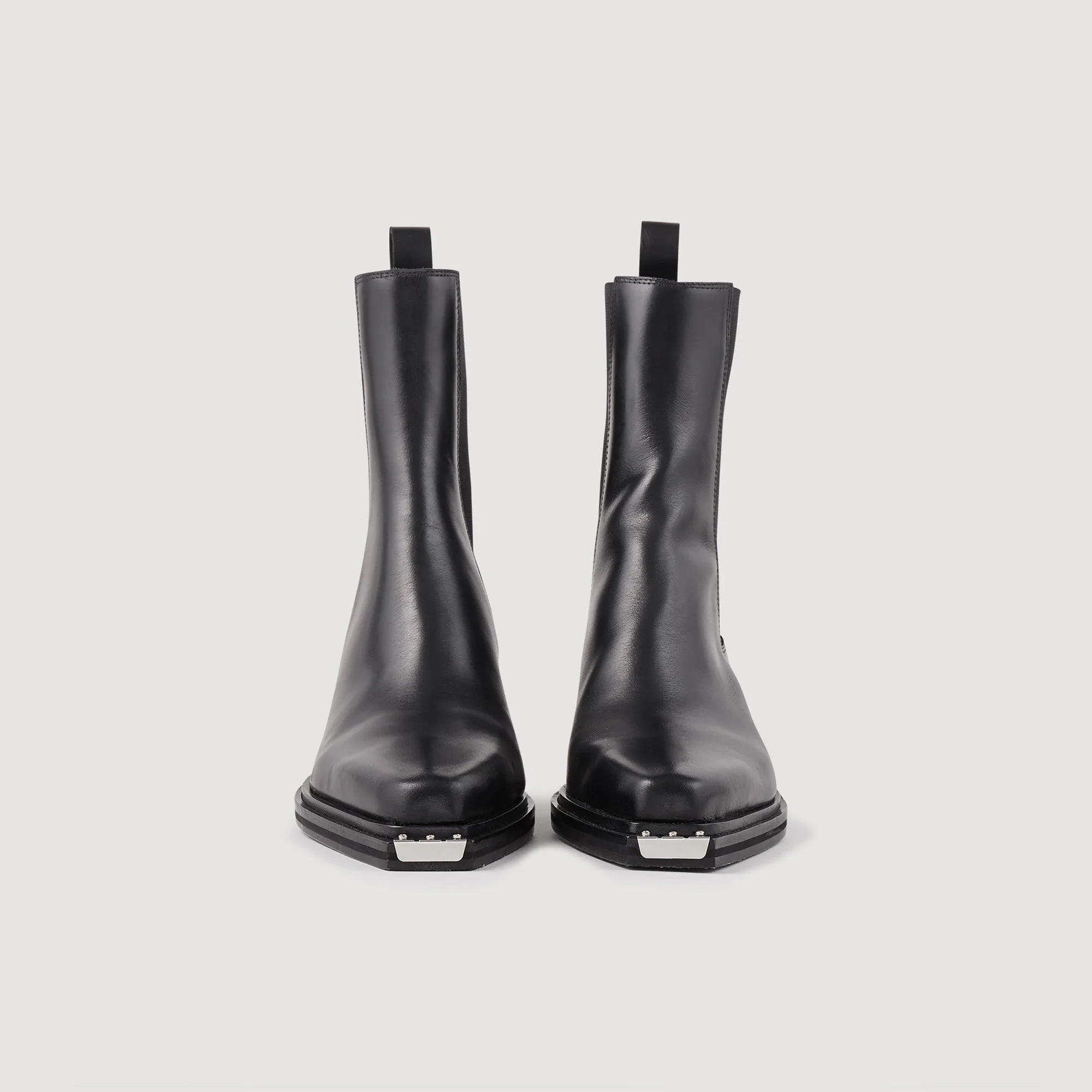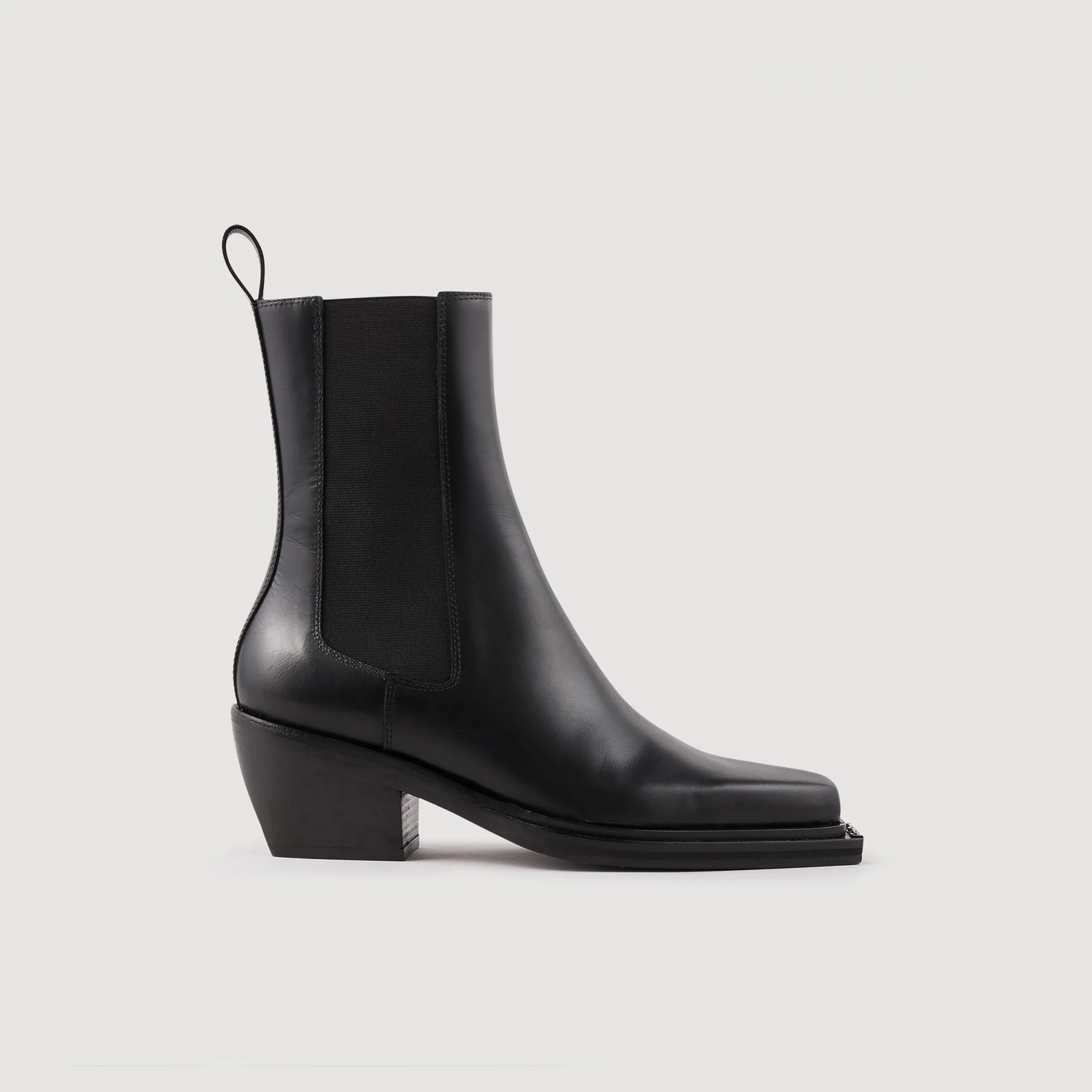 Botines de piel lisa estilo cowboy con puntera en punta, tacón, elásticos en los laterales y lengüeta trasera.• Botines de cuero liso Sandro Mujer
