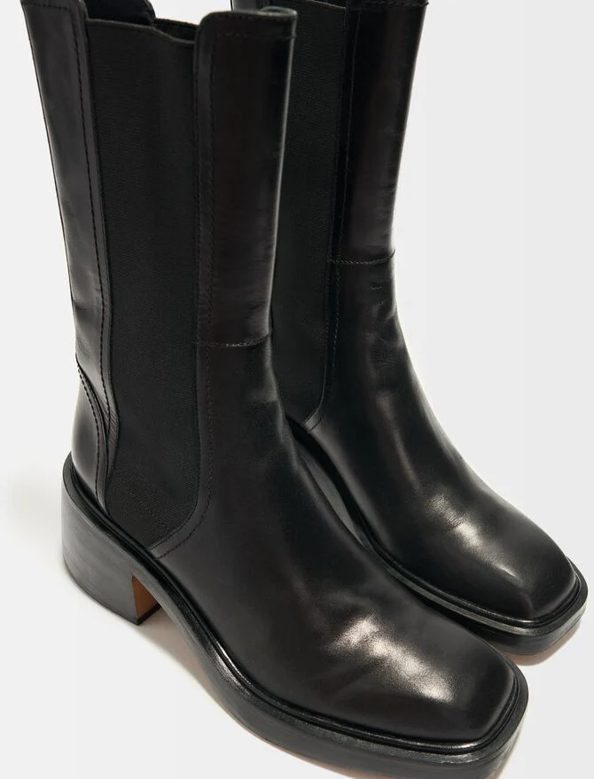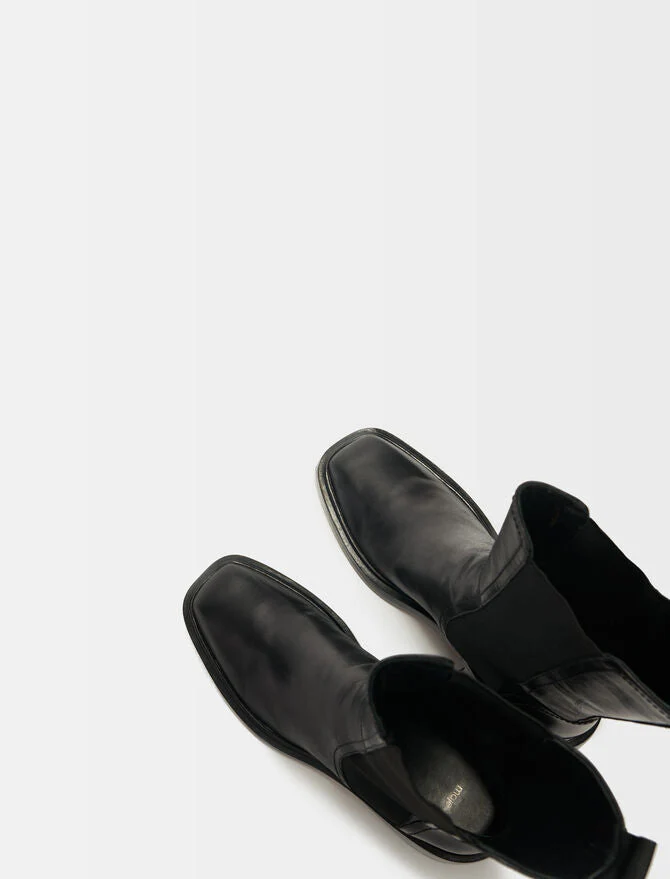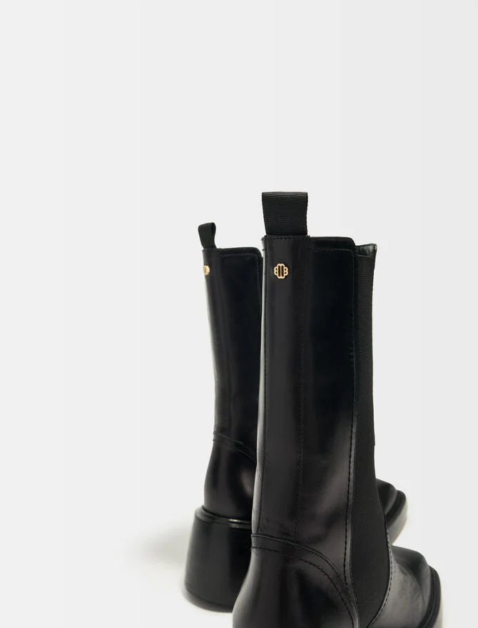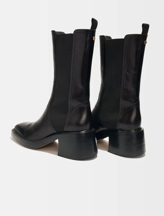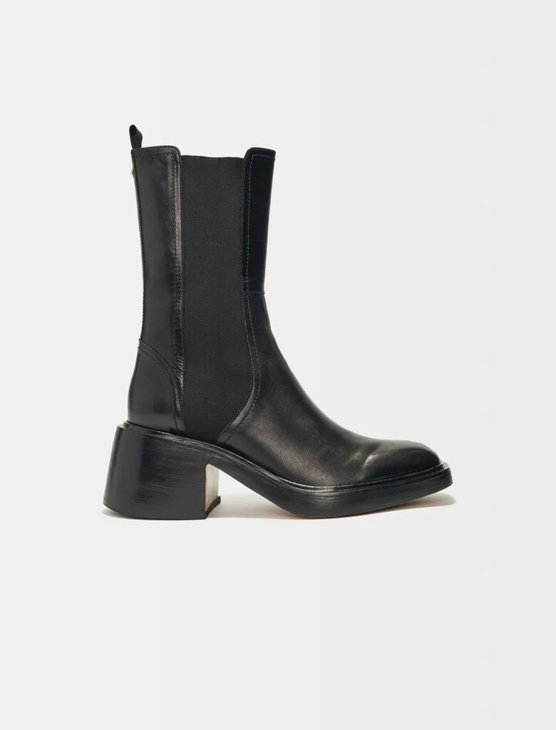 Botines de piel lista negra y puntera cuadrada. Elásticos negros en los laterales para hacerlos más fáciles de poner. Clover de Maje de latón dorado en la parte trasera del zapato. Tacones de 7,8 cm.Ref.: MFACH00555La piel utilizada en esta prenda procede de una curtiduría certificada que garantiza una mejor gestión de los residuos y la energía y el reciclaje de los productos químicos.En Maje, imaginamos el futuro. Compartimos el objetivo de reducir, un poquito más cada temporada, el impacto en el medio ambiente de las prendas que diseñamos.• Botines de piel lisa