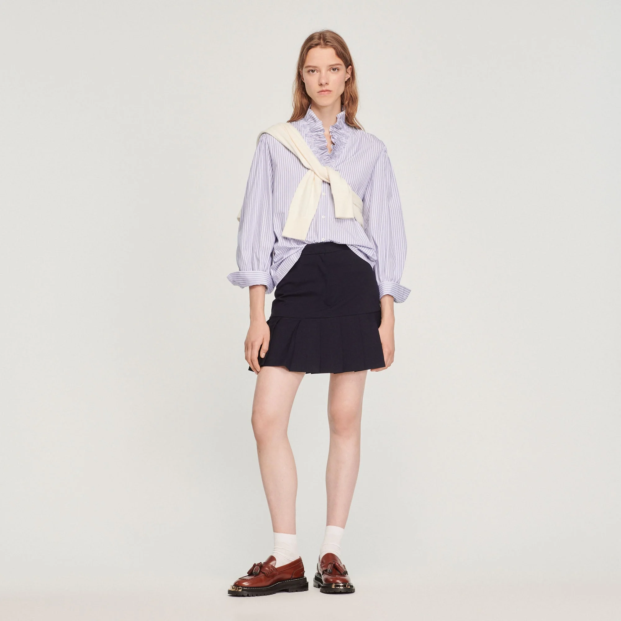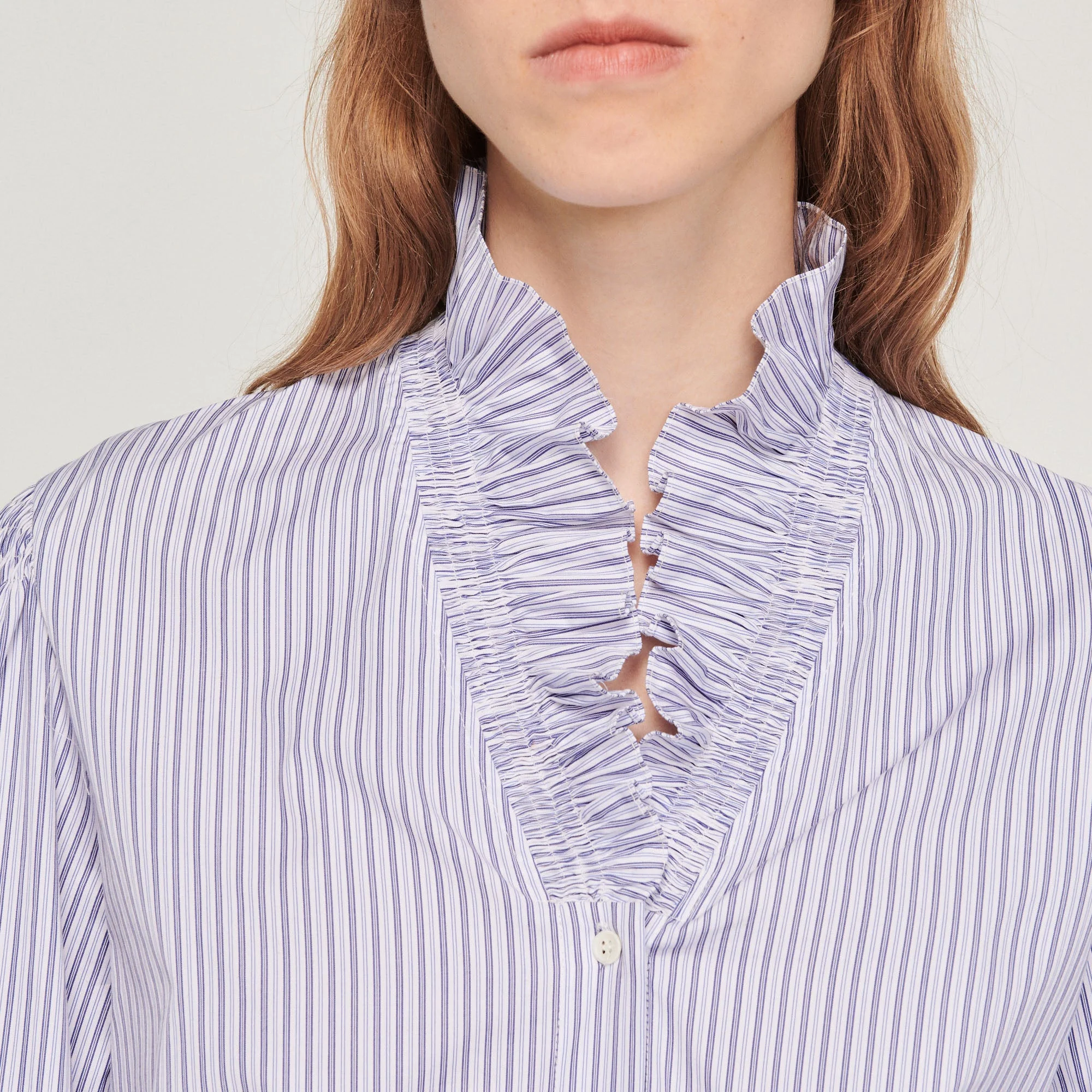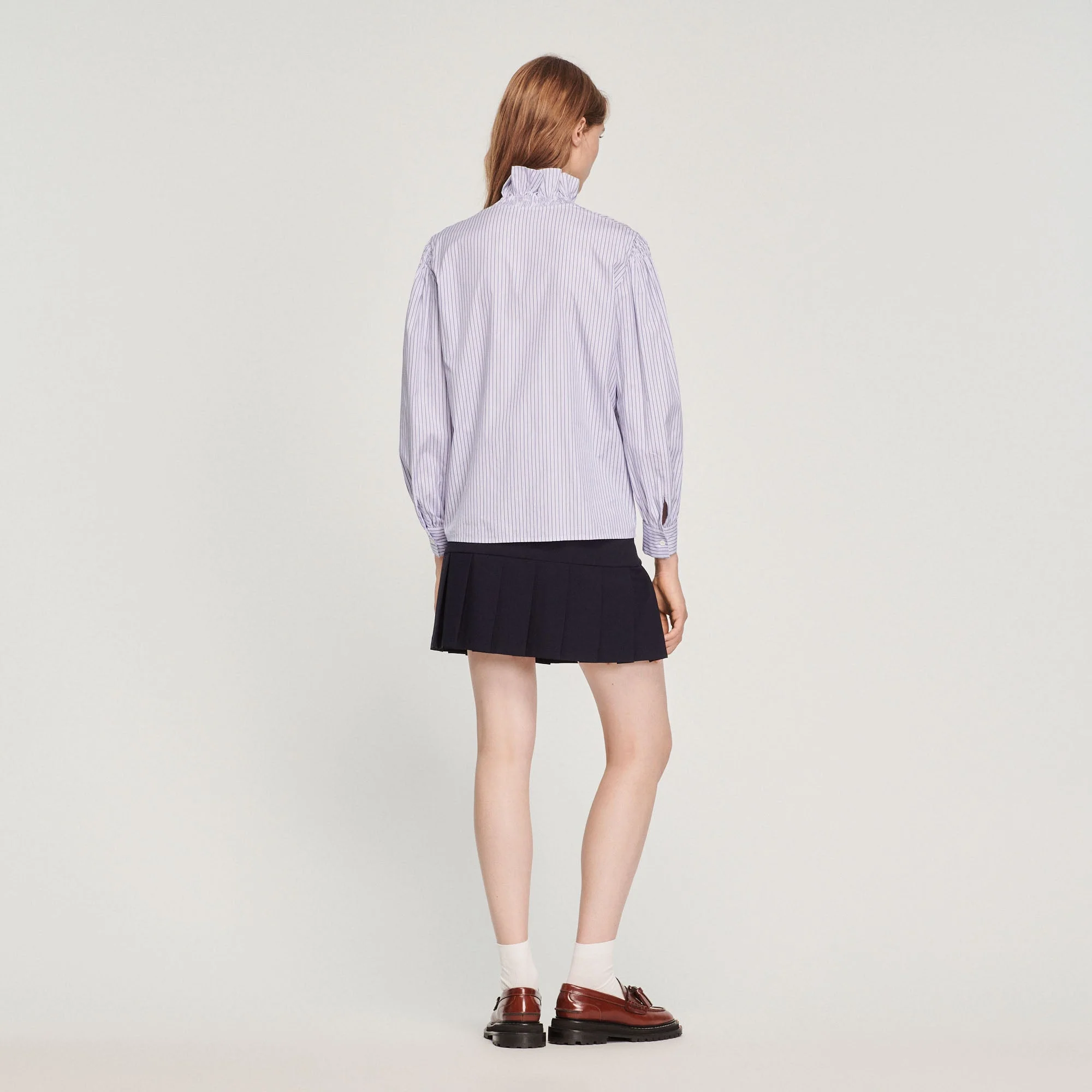 Camisa de manga larga y cuello fantasía con cierre de botones, sublimada con un estampado de rayas.