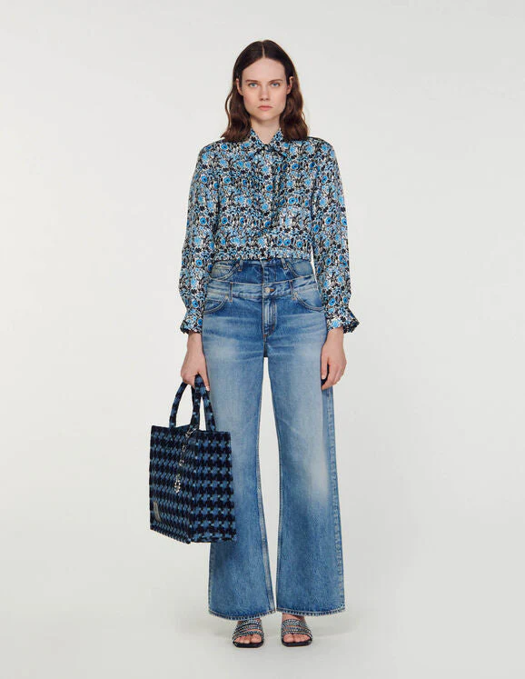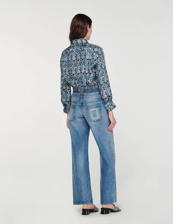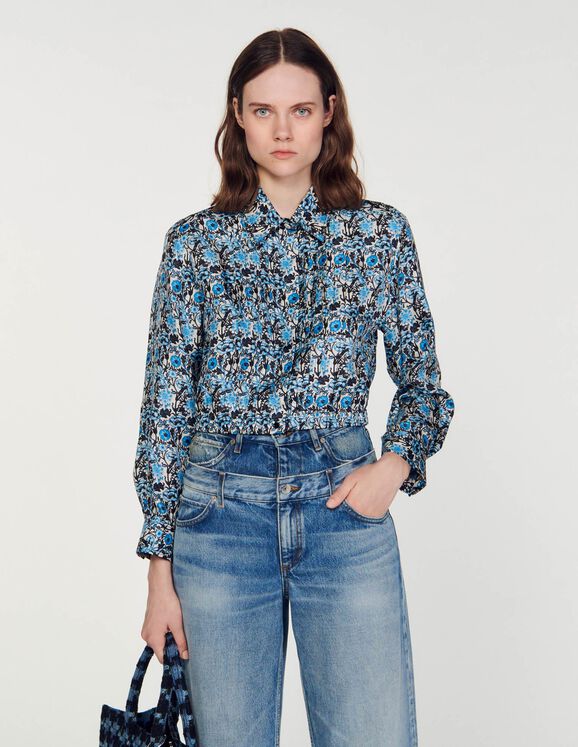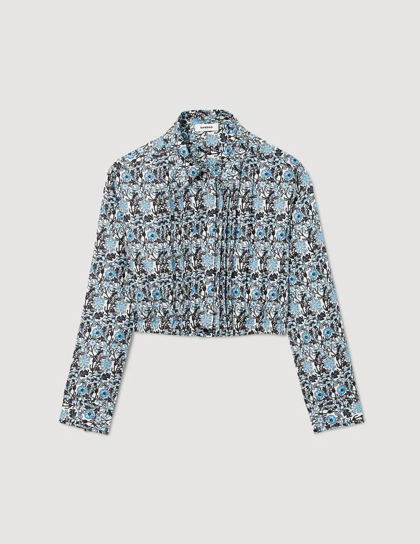 Camisa corta de manga larga con puños abotonados y con cuello de seda con estampado floral, con cierre de botones y un elástico fruncido en la cintura.• Camisa de seda estampada Sandro de mujer