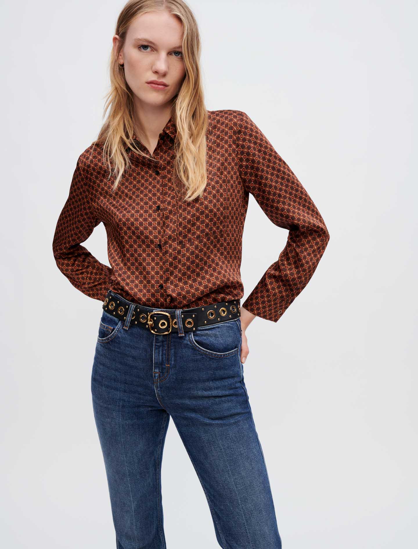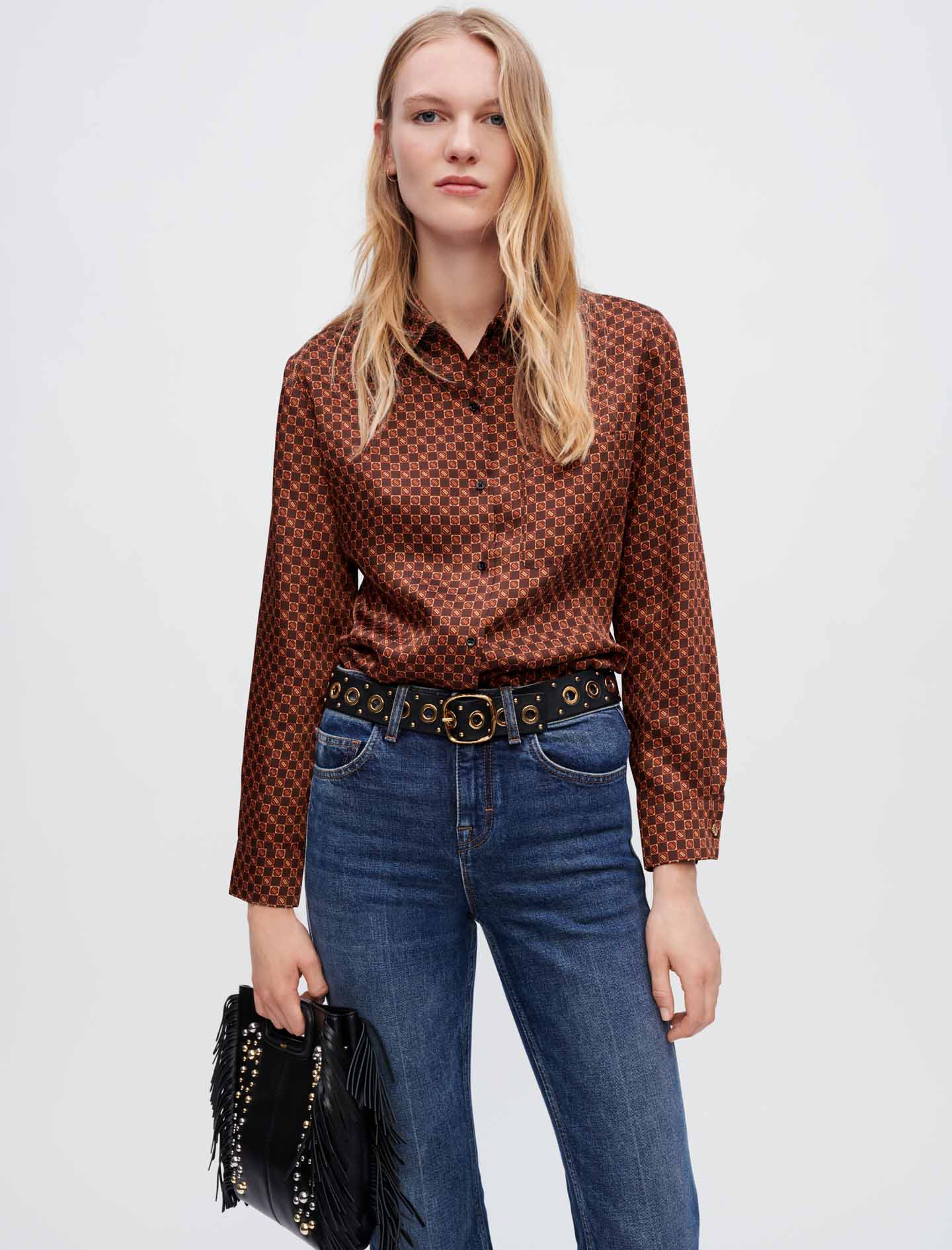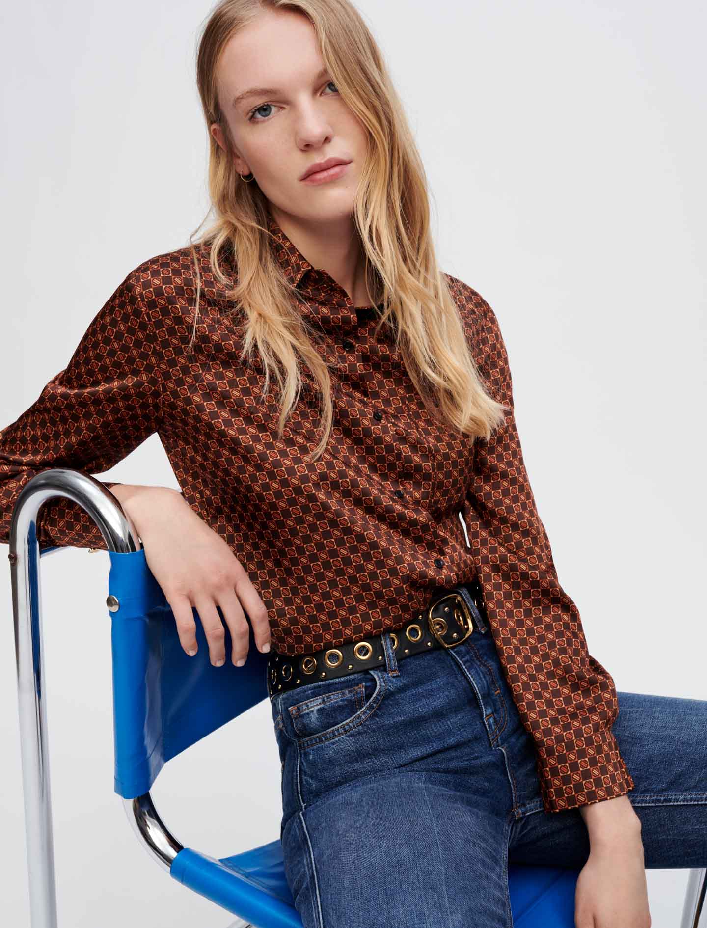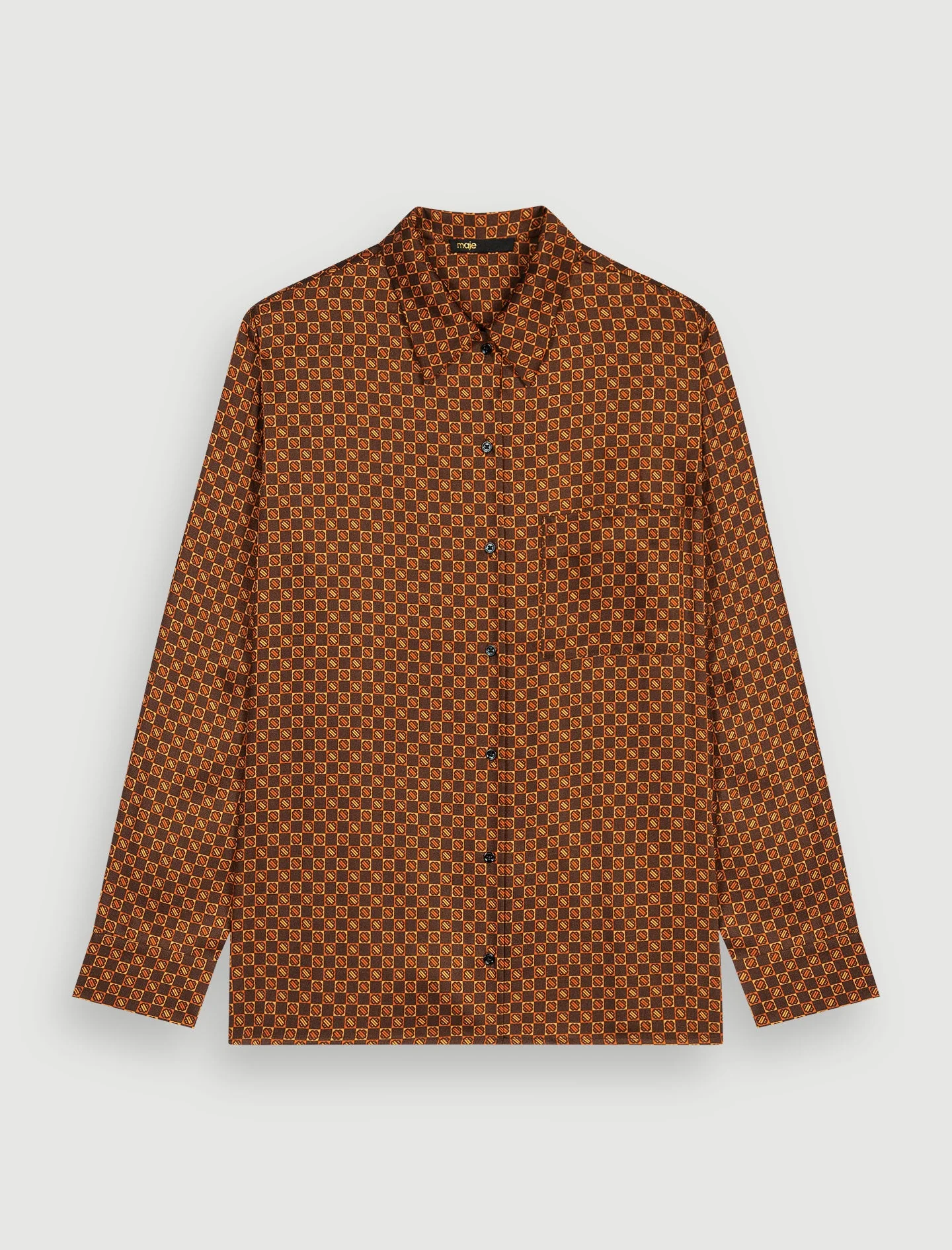 Camisa fluida de raso ligeramente entallada con estampado Mini Clover marrón. Mangas largas y rectas con puños. Cuello camisero y bolsillo de parche en el pecho. Botones con las siglas de Maje. Clover de Maje de metal en los puños. Ideal para el día o para ir a la oficina.