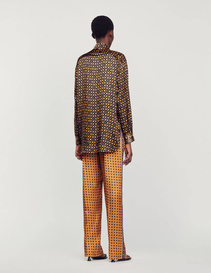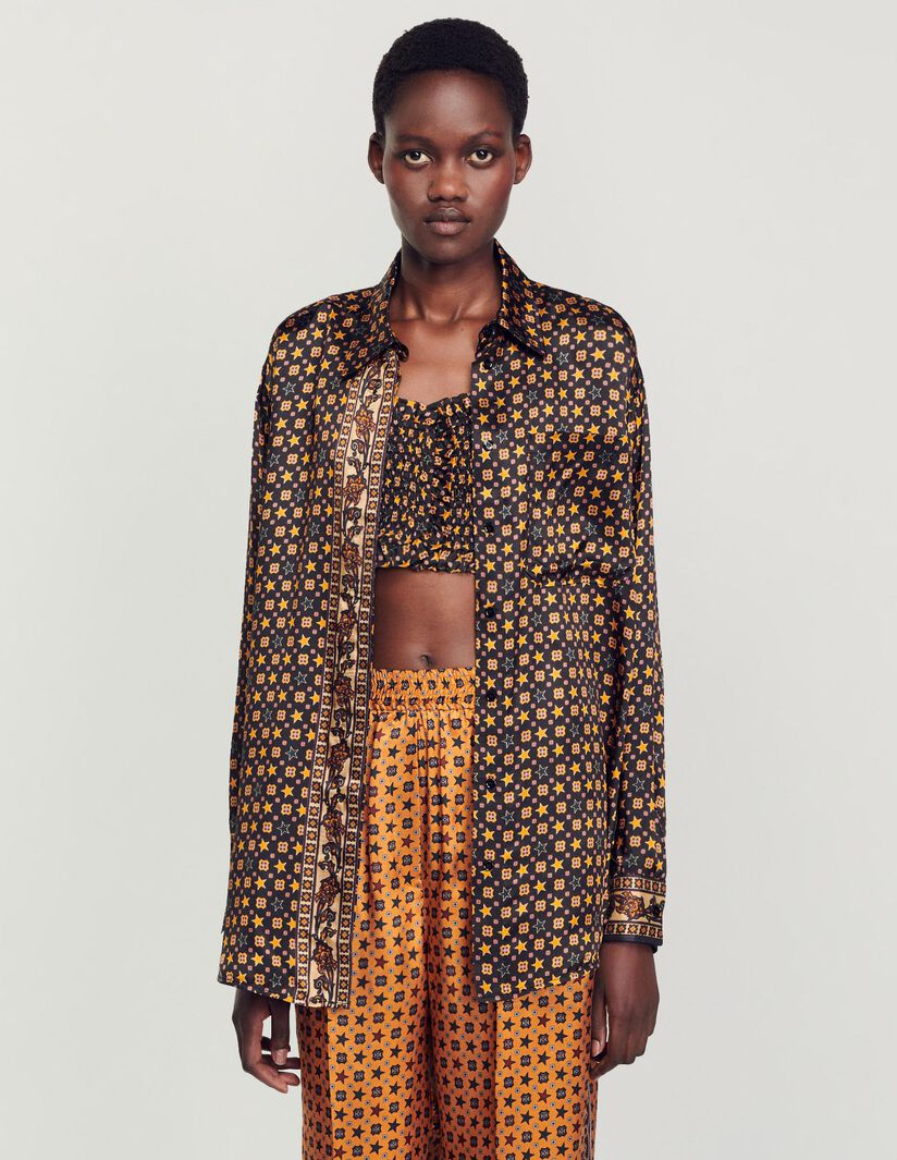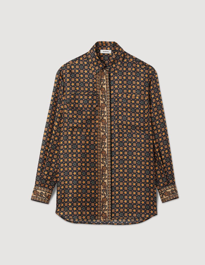 Camisa fluida de manga larga y cuello clásico, más larga en la parte trasera y con cierre de tapeta de botones recubierta, sublimada con una mezcla de estampados de fular.• Camisa fluida satinada Sandro de mujer