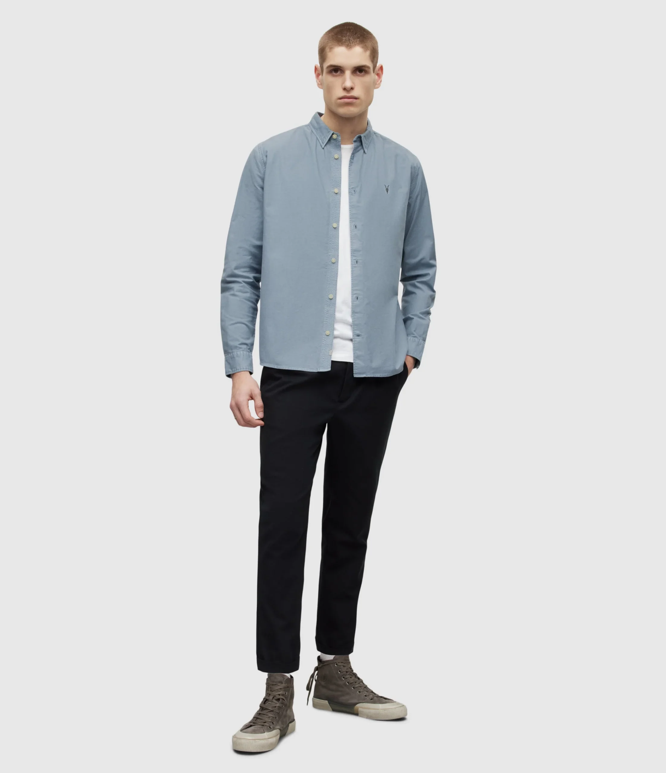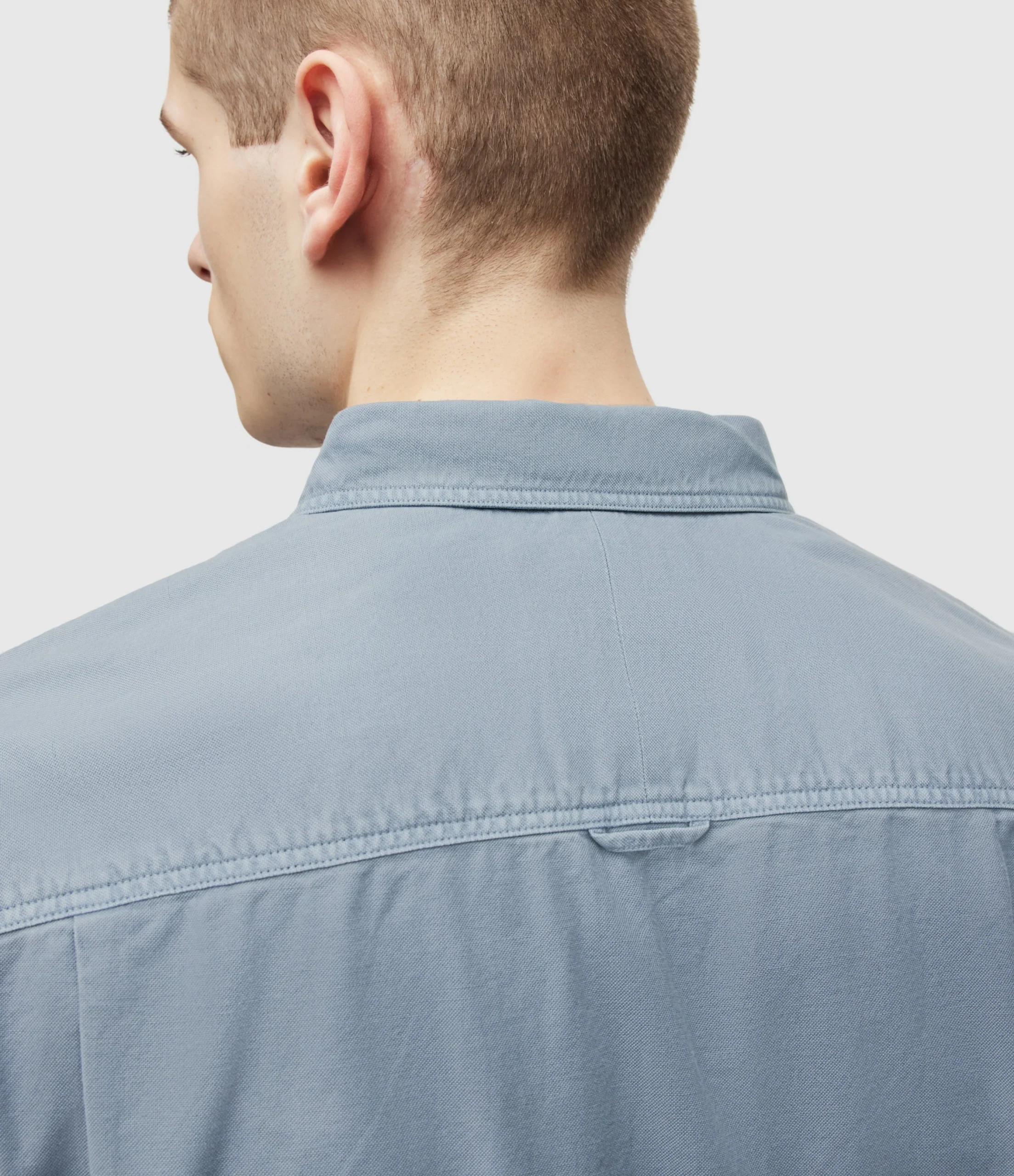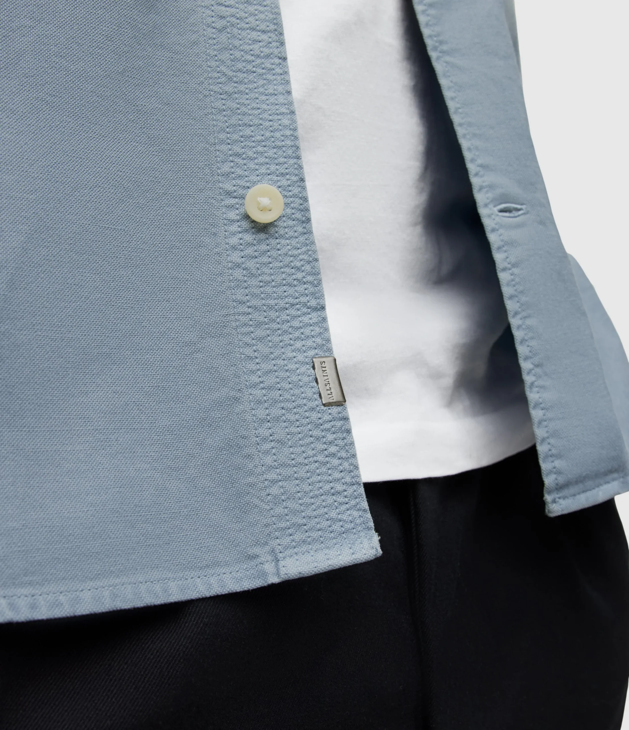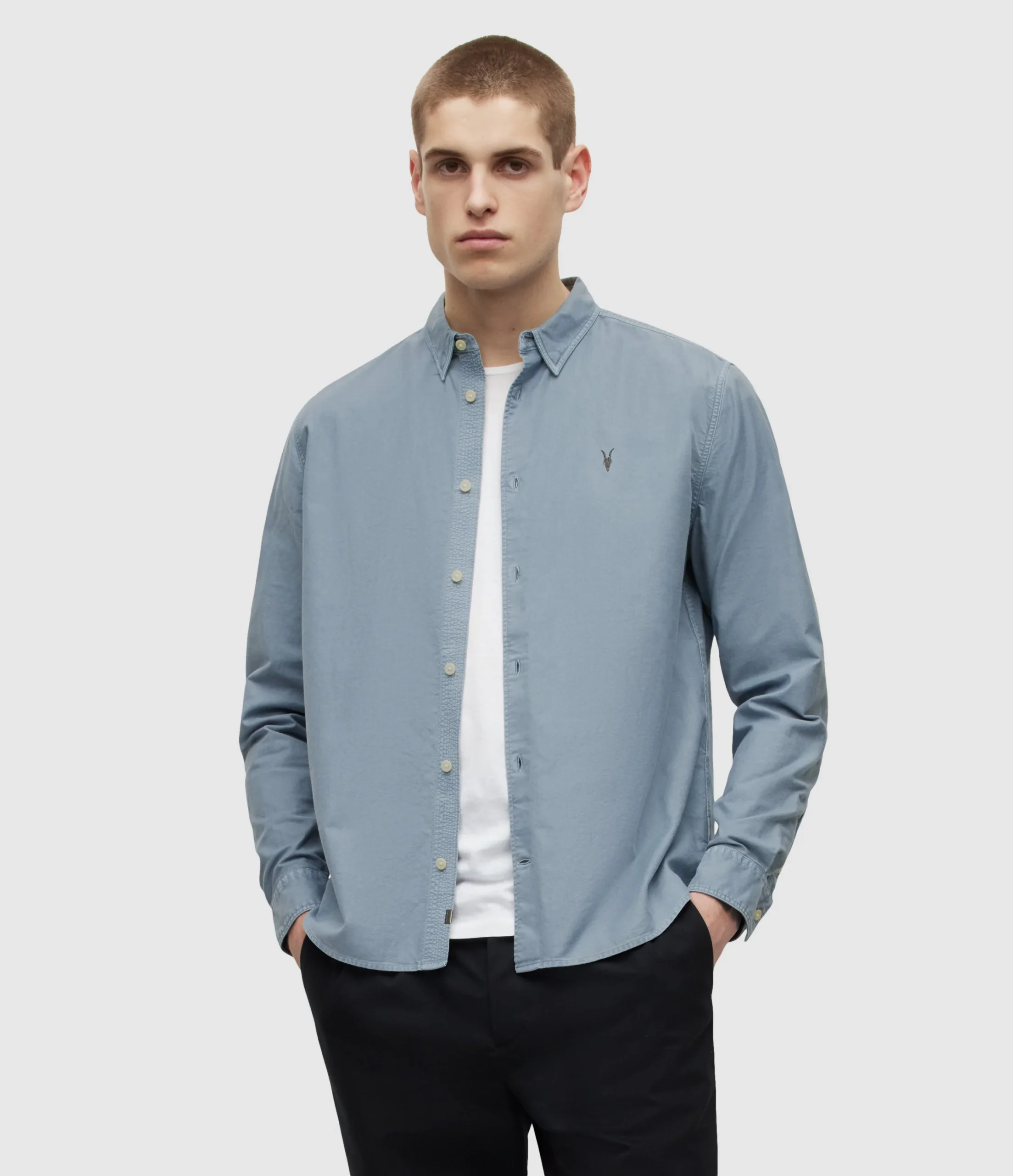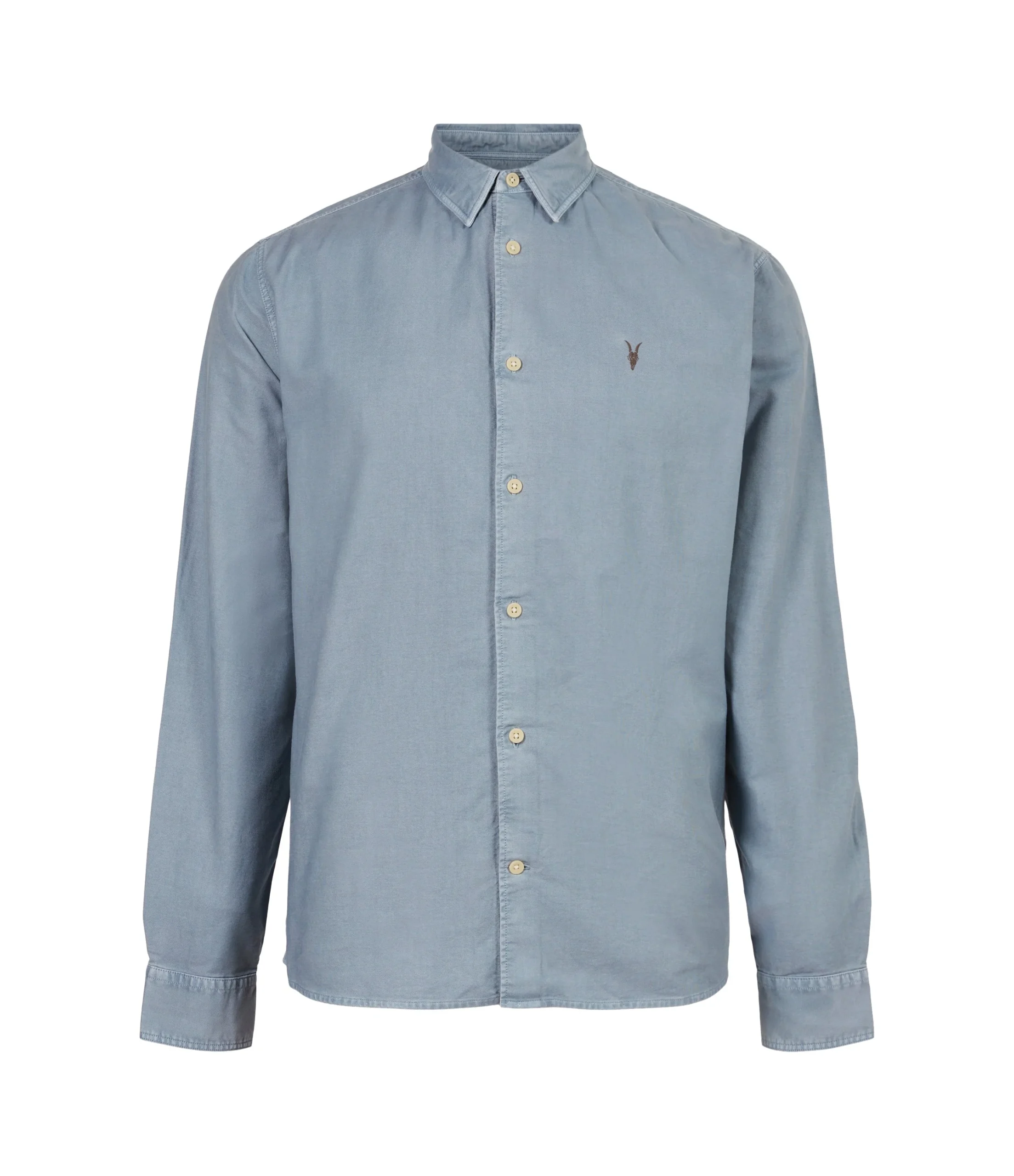 Camisa Hermosa Azul Medio para hombre, marca AllSaints, de manga larga. COMPOSICIÓN Y LAVADO: Consultar etiqueta interna.