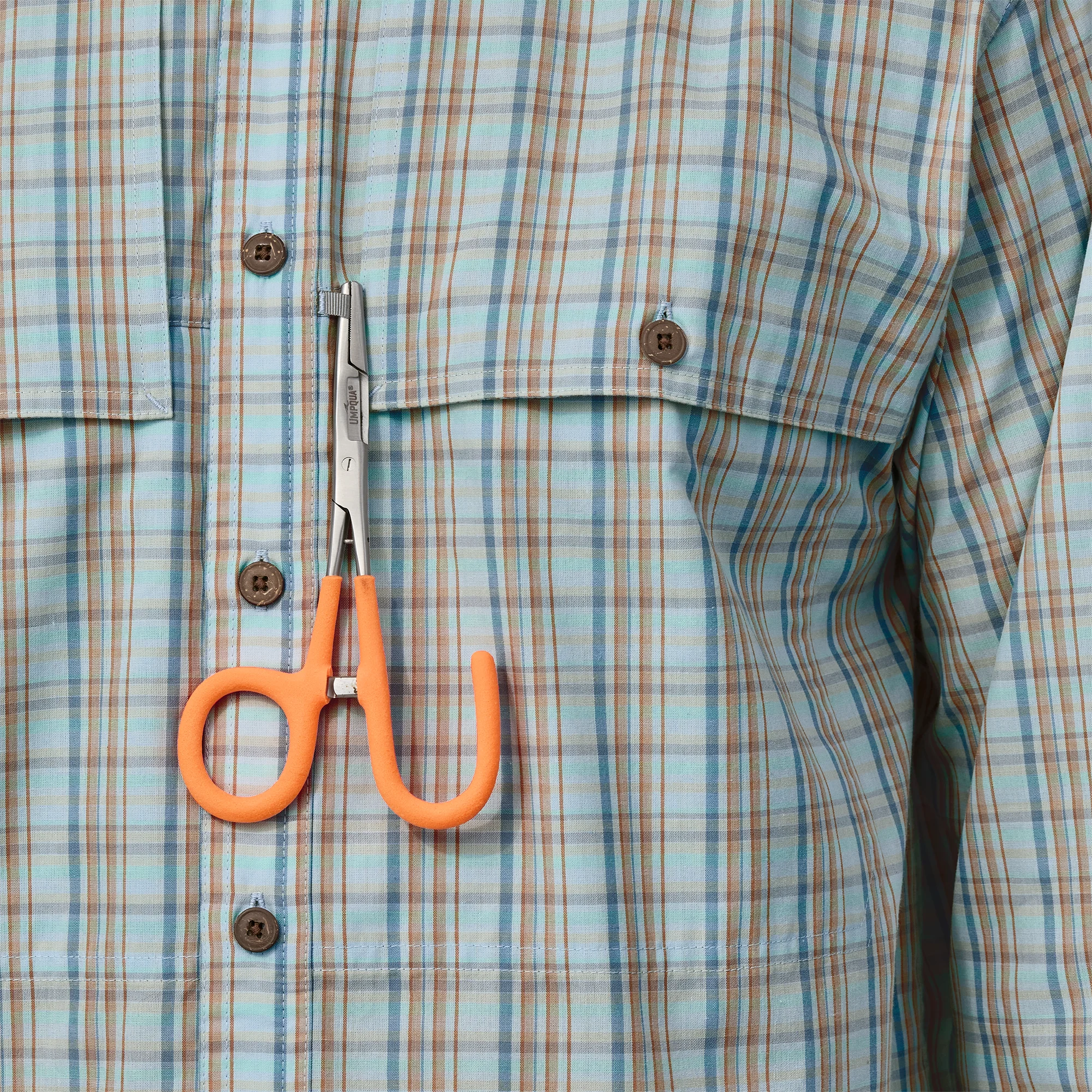 Dispone de bolsillos con solapas en el área del pecho, al alcance de tu mano, por lo que puedes almacenar fácilmente tu pasaporte o tu caja de moscas, además cuenta con un soporte para hemostato cerca del bolsillo derecho