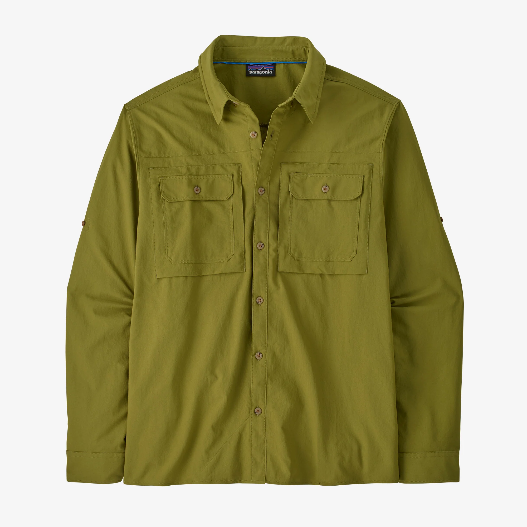 Los dos bolsillos verticales en el pecho, con cierres resistentes a la corrosión, son ideales para almacenar cajas de moscas; los otros dos bolsillos con botón, también en el pecho, mantienen tus objetos esenciales al alcance de la mano (el de la derecha cuenta con un soporte para herramientas oculto bajo la solapa).