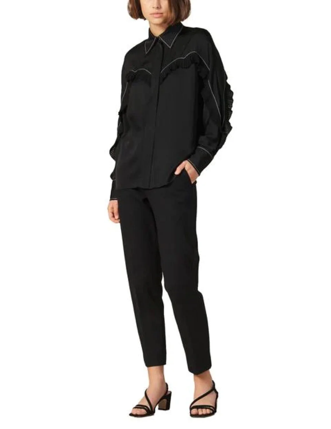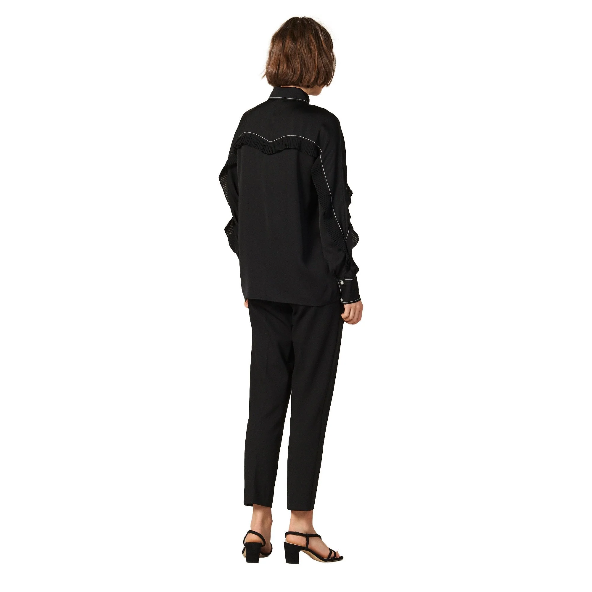 CAMISA LISA MANGA LARGA CORTE VAQUERO, MARCA SANDRO. 100% VISCOSA. LIMPIEZA EN SECO PROFESIONAL. REVISAR ETIQUETA INTERNA DE LAVADO PARA MÁS INFORMACIÓN.