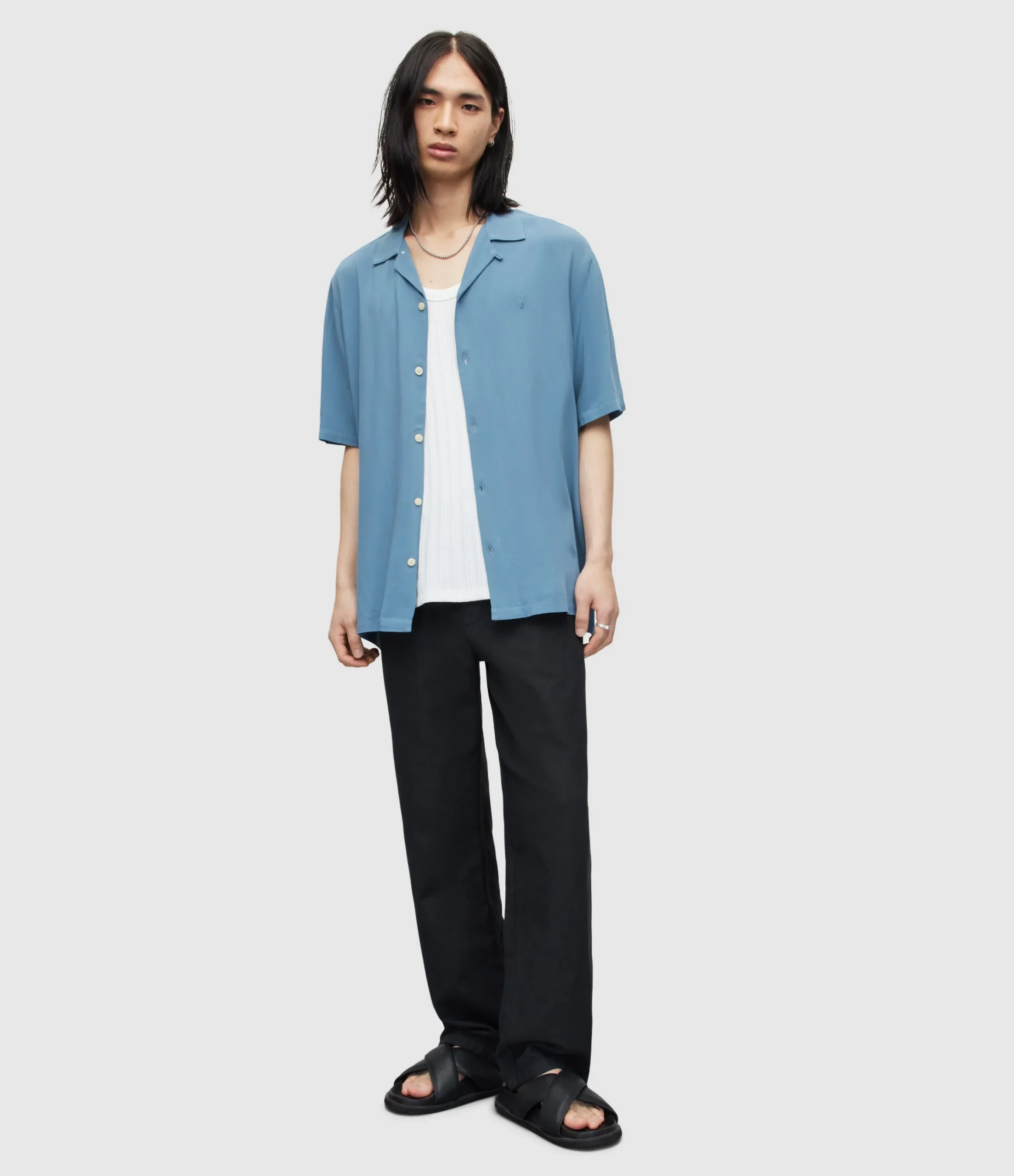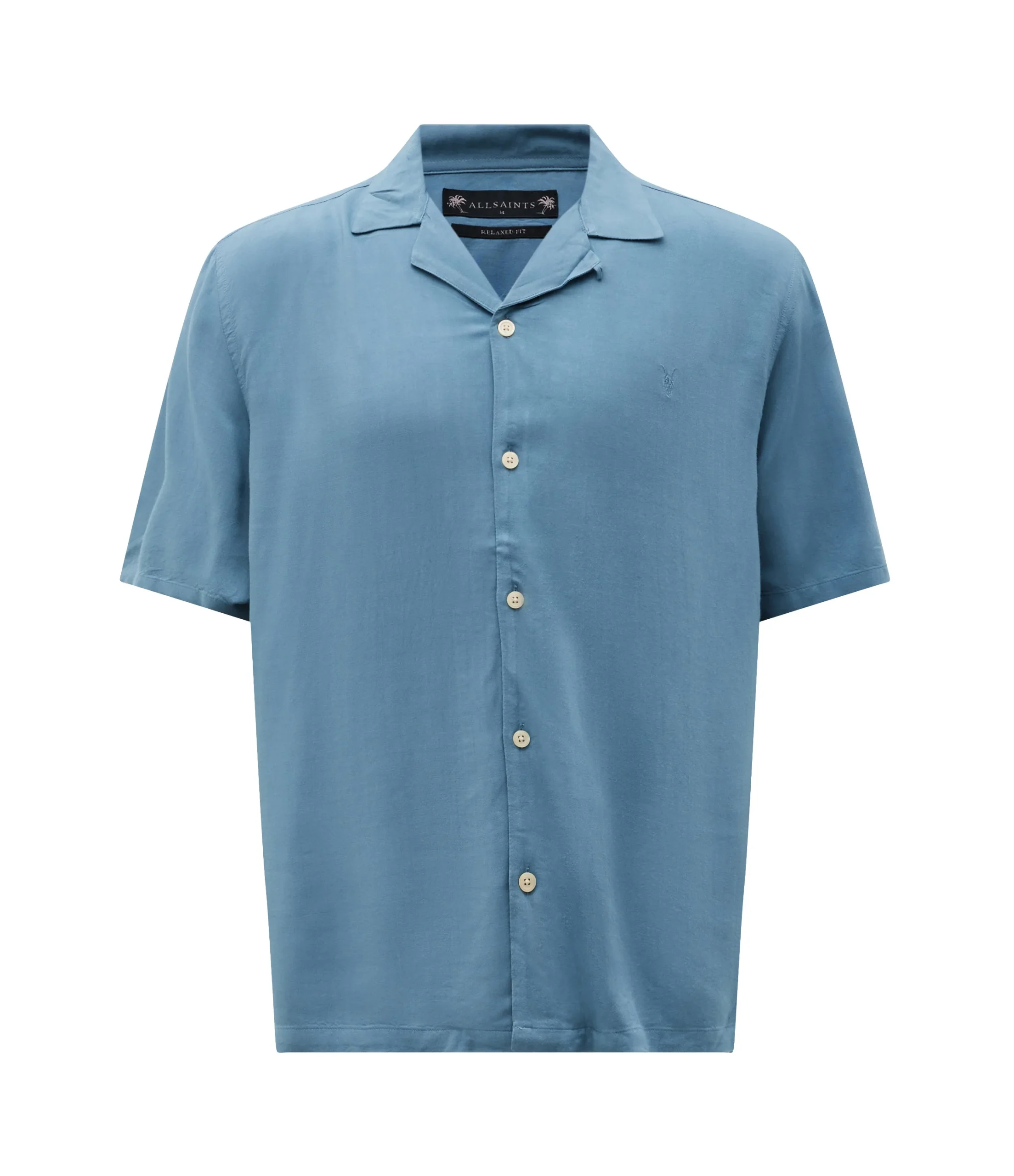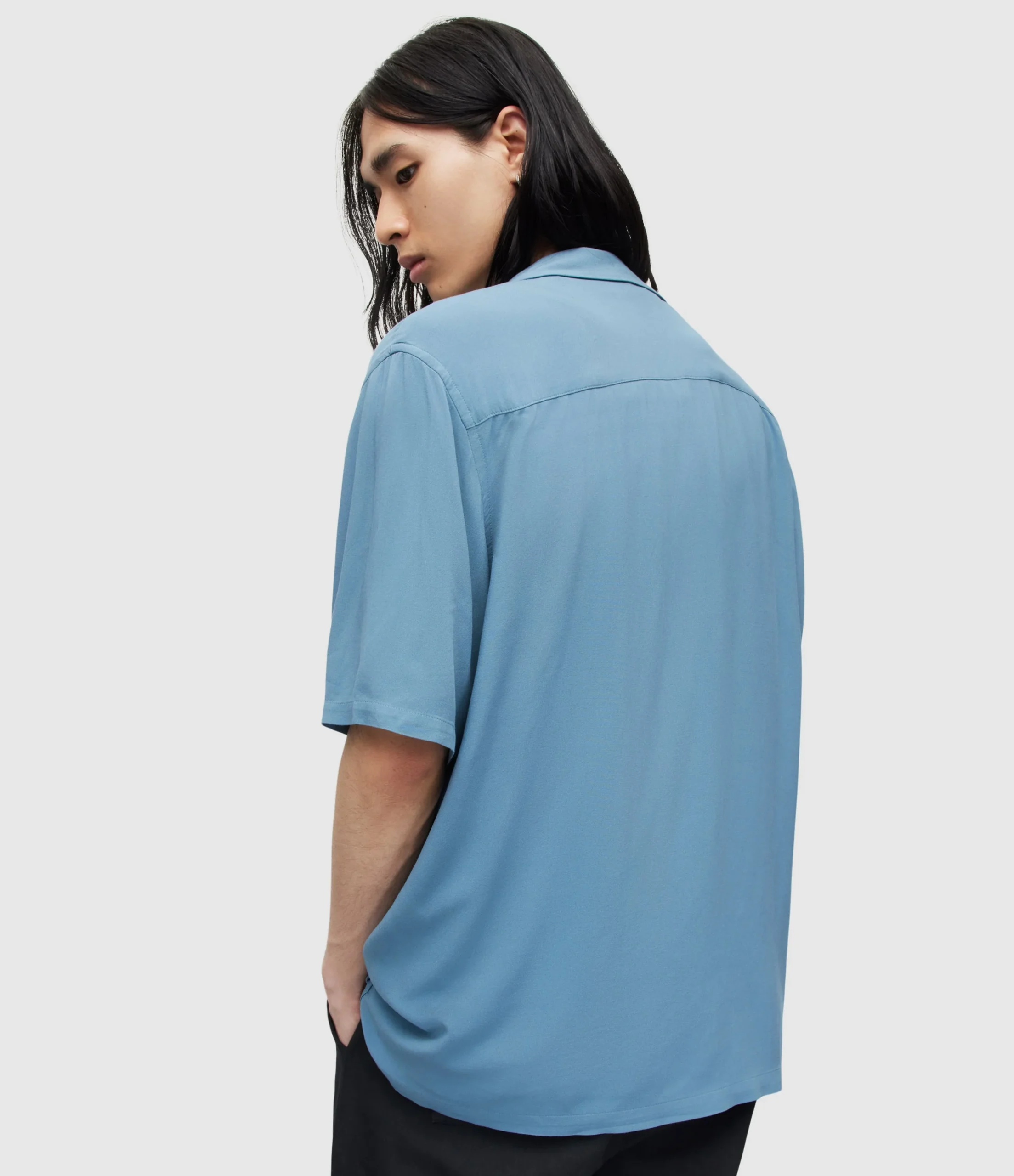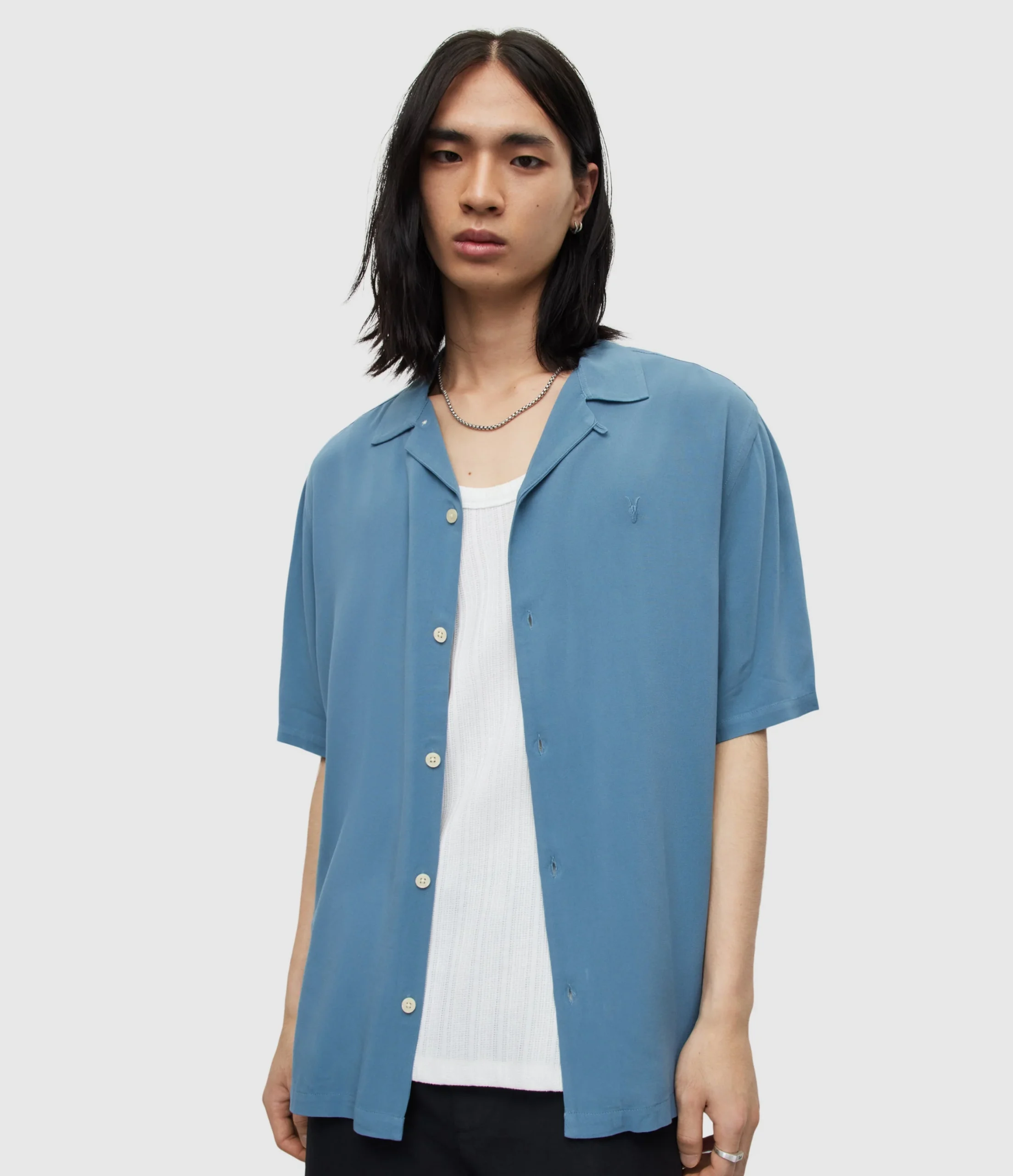 Camisa Venice Azul Medio para hombre, marca AllSaints, de manga corta. COMPOSICIÓN Y LAVADO: Consultar etiqueta interna.