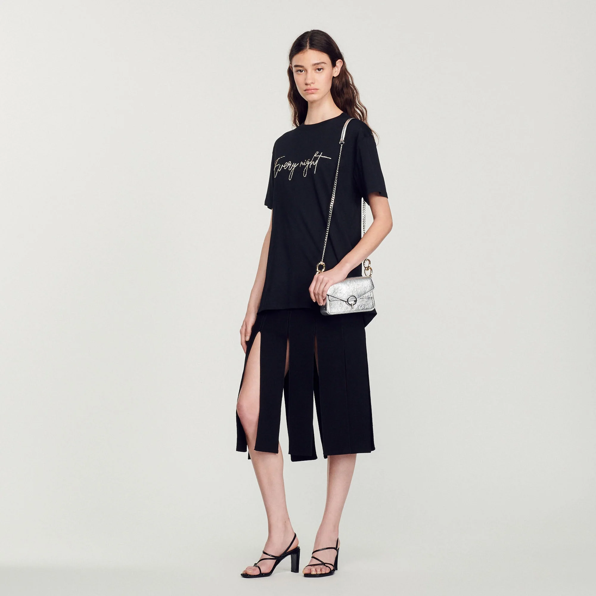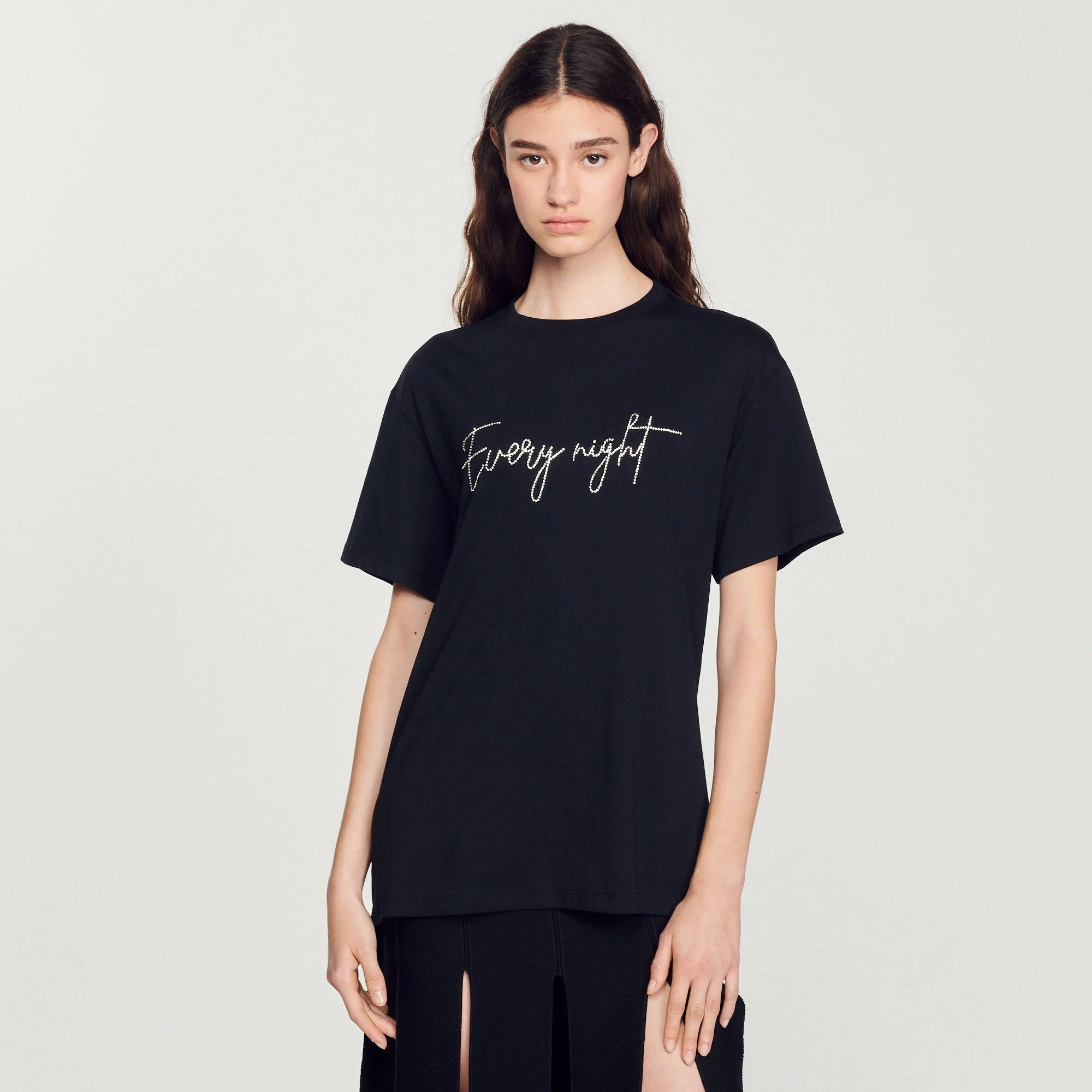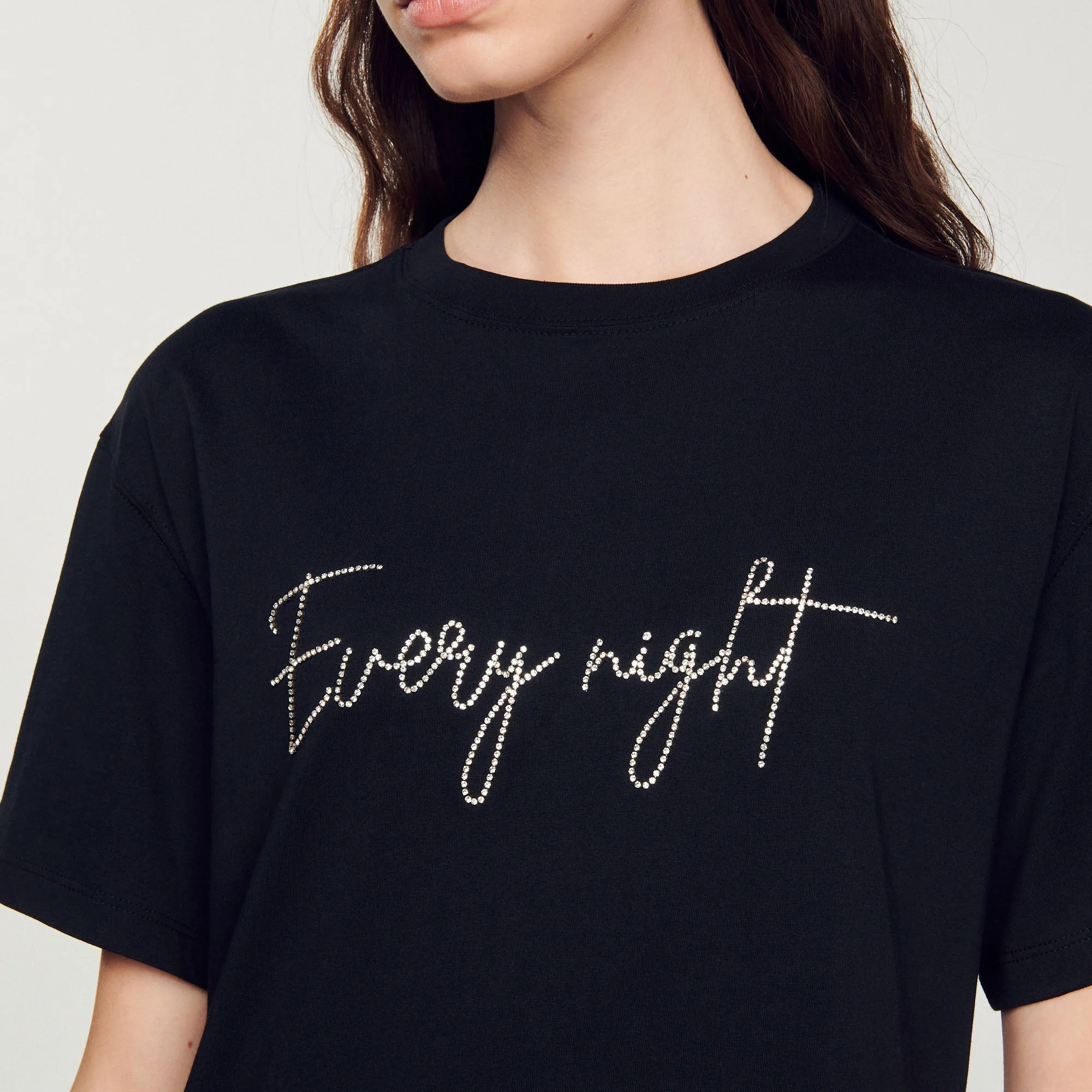 Camiseta de manga corta y cuello redondo, sublimada con un bordado Every Night de strass.