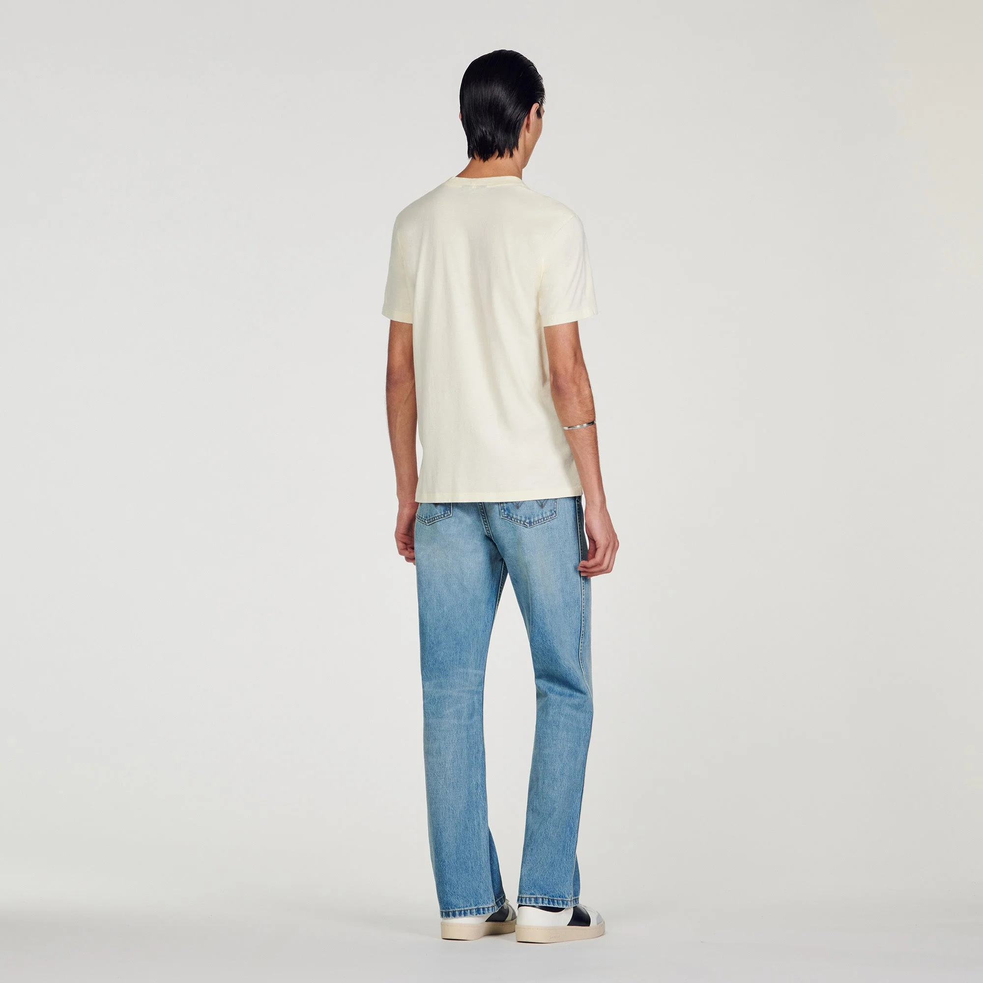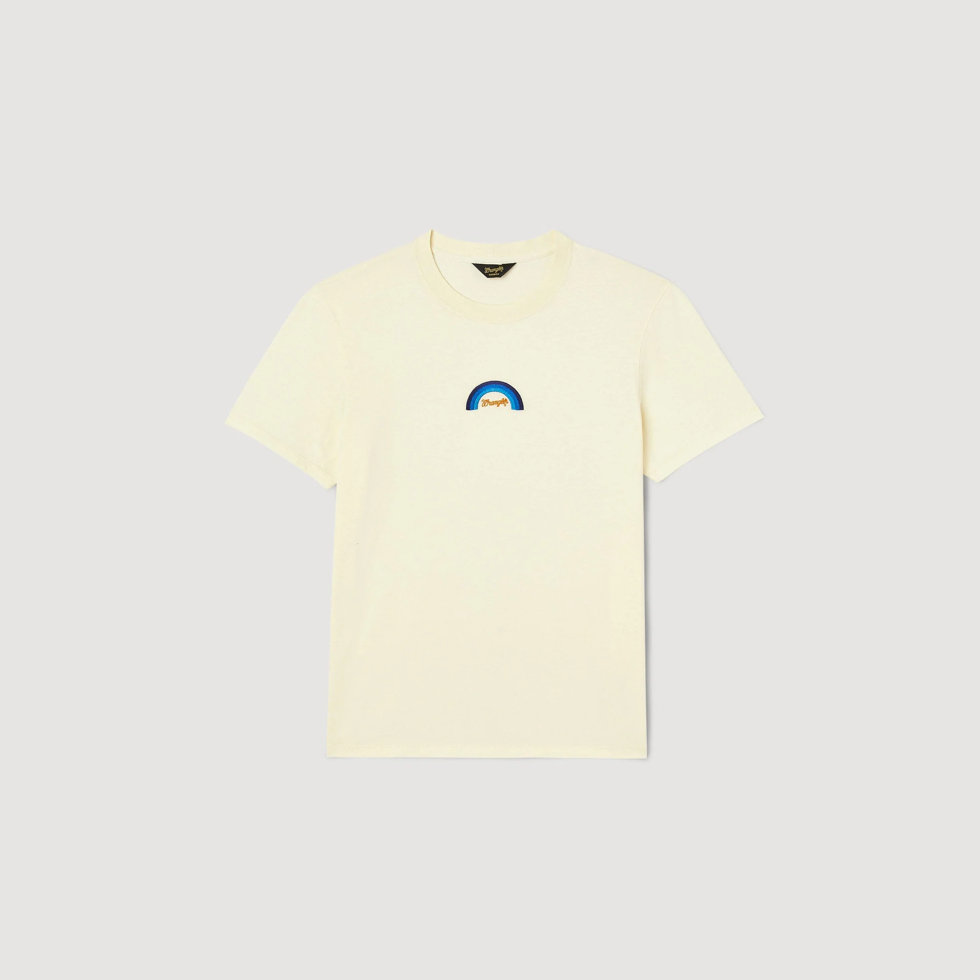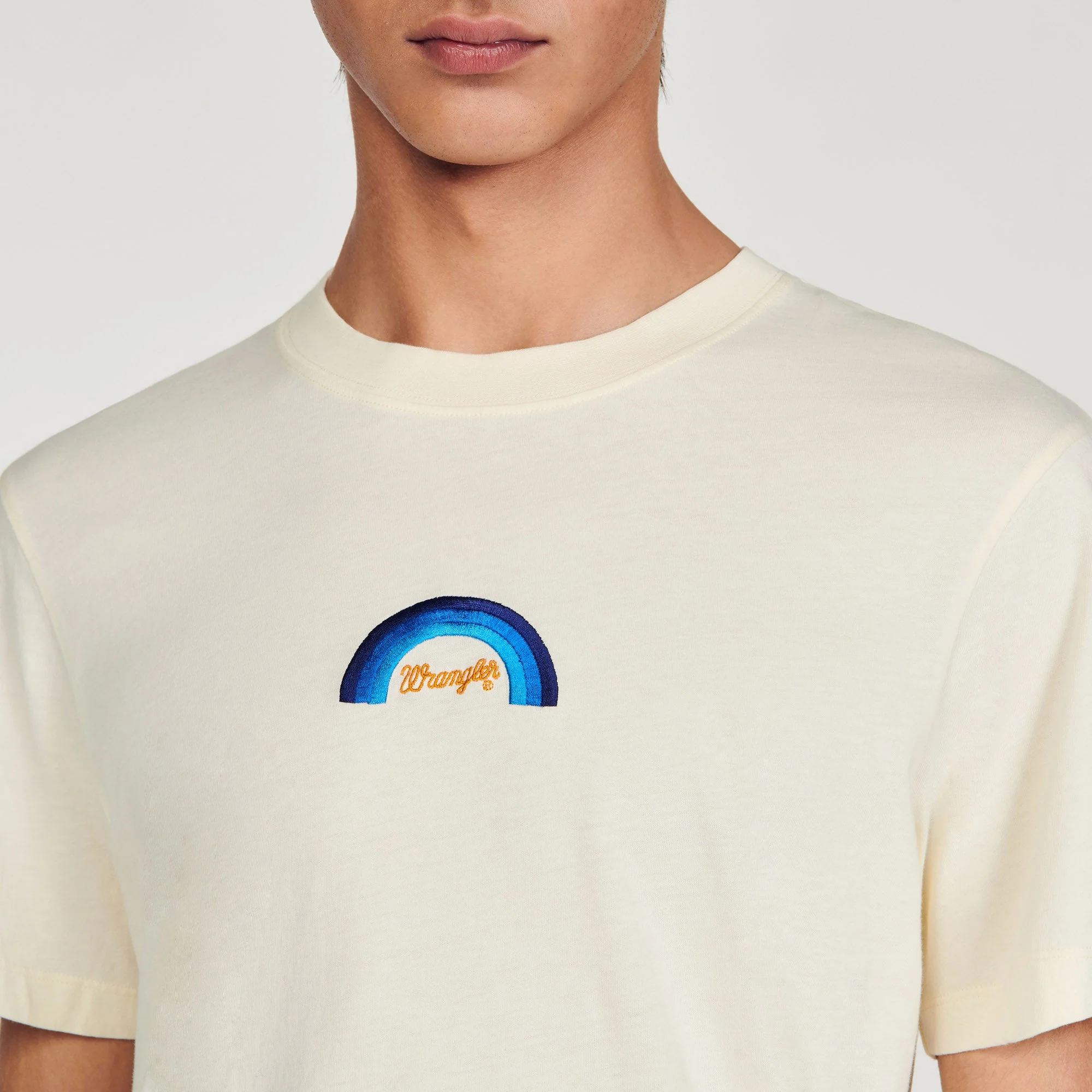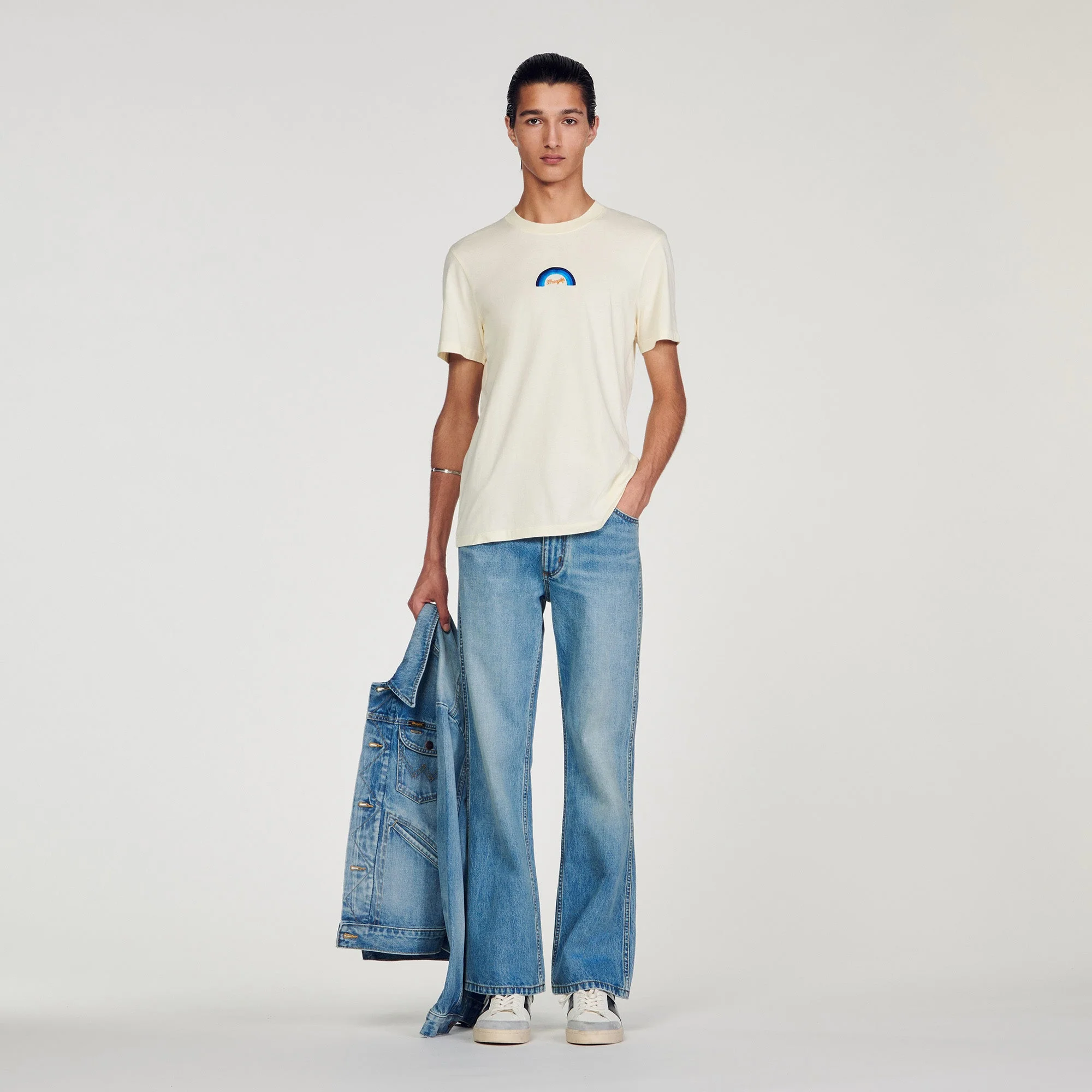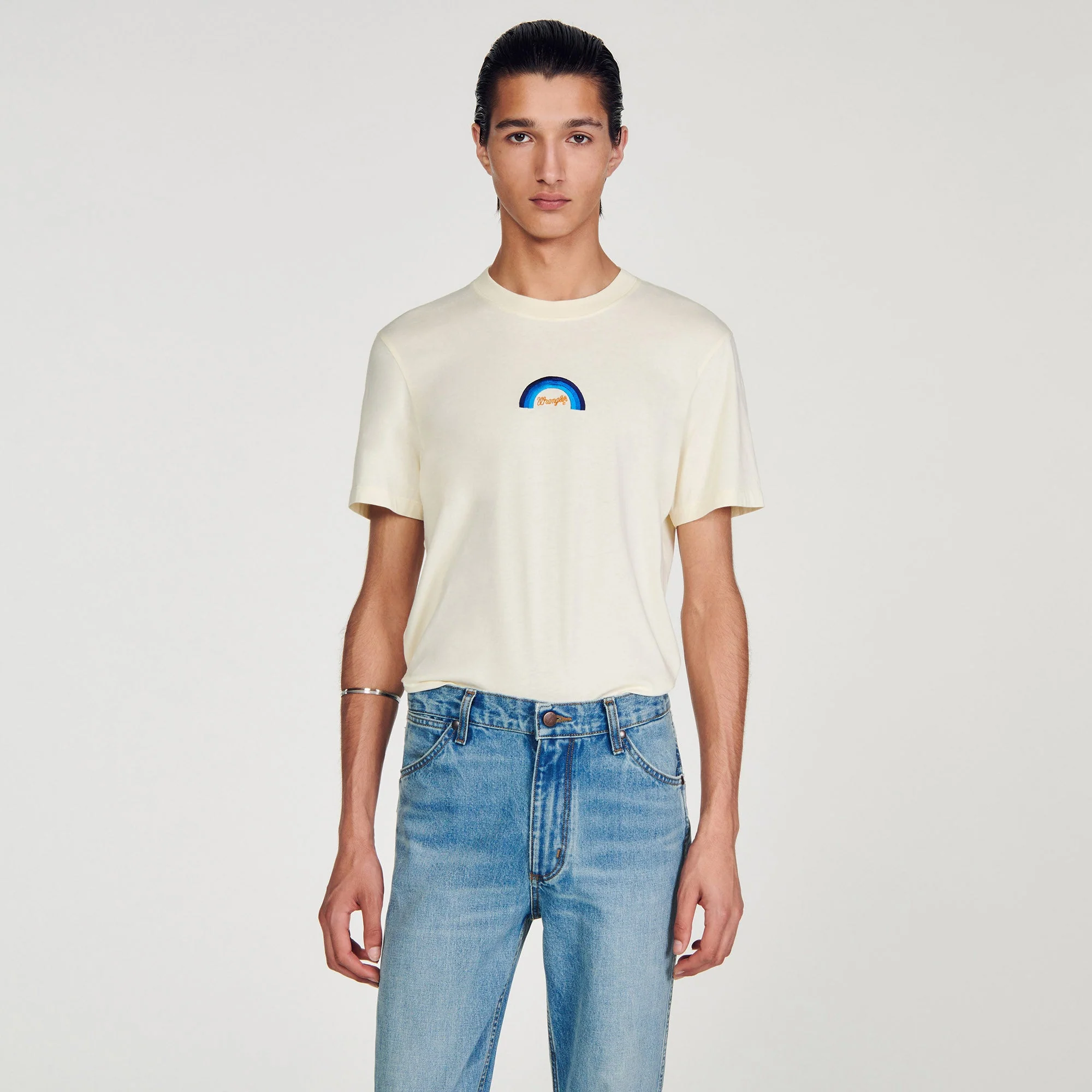 Diseñada por el estudio de diseño SANDRO Homme, la colección cápsula firmada con WRANGLER es versátil y se puede llevar tanto por hombres como por mujeres. Inspirados en los icónicos wésterns de finales de los 60, los equipos creativos de SANDRO quisieron celebrar la herencia y la estética única de WRANGLER reinterpretando piezas de archivo de los años 70.Camiseta de algodón con cuello redondo, manga corta y decorada con un estampado de arcoíris de WRANGLER.• Camiseta de algodón SANDROxWRANGLER Homme