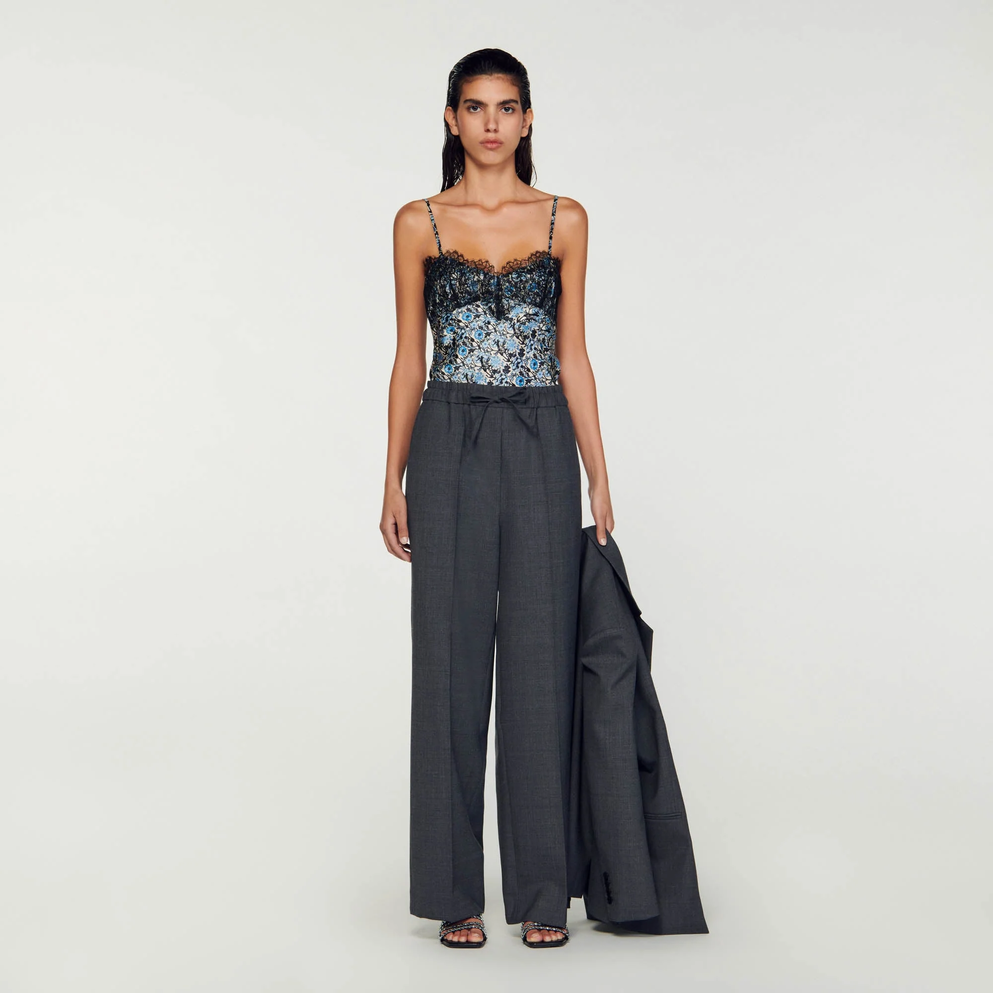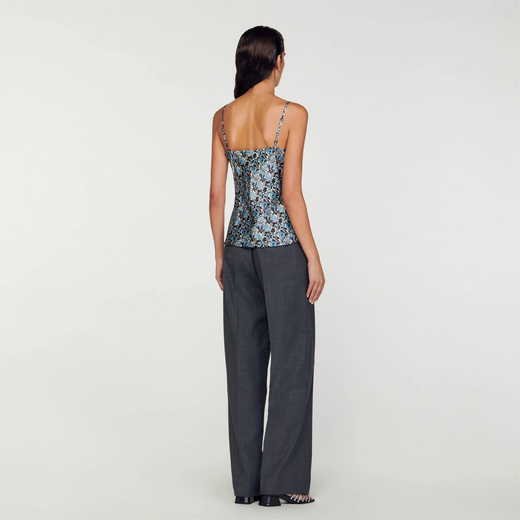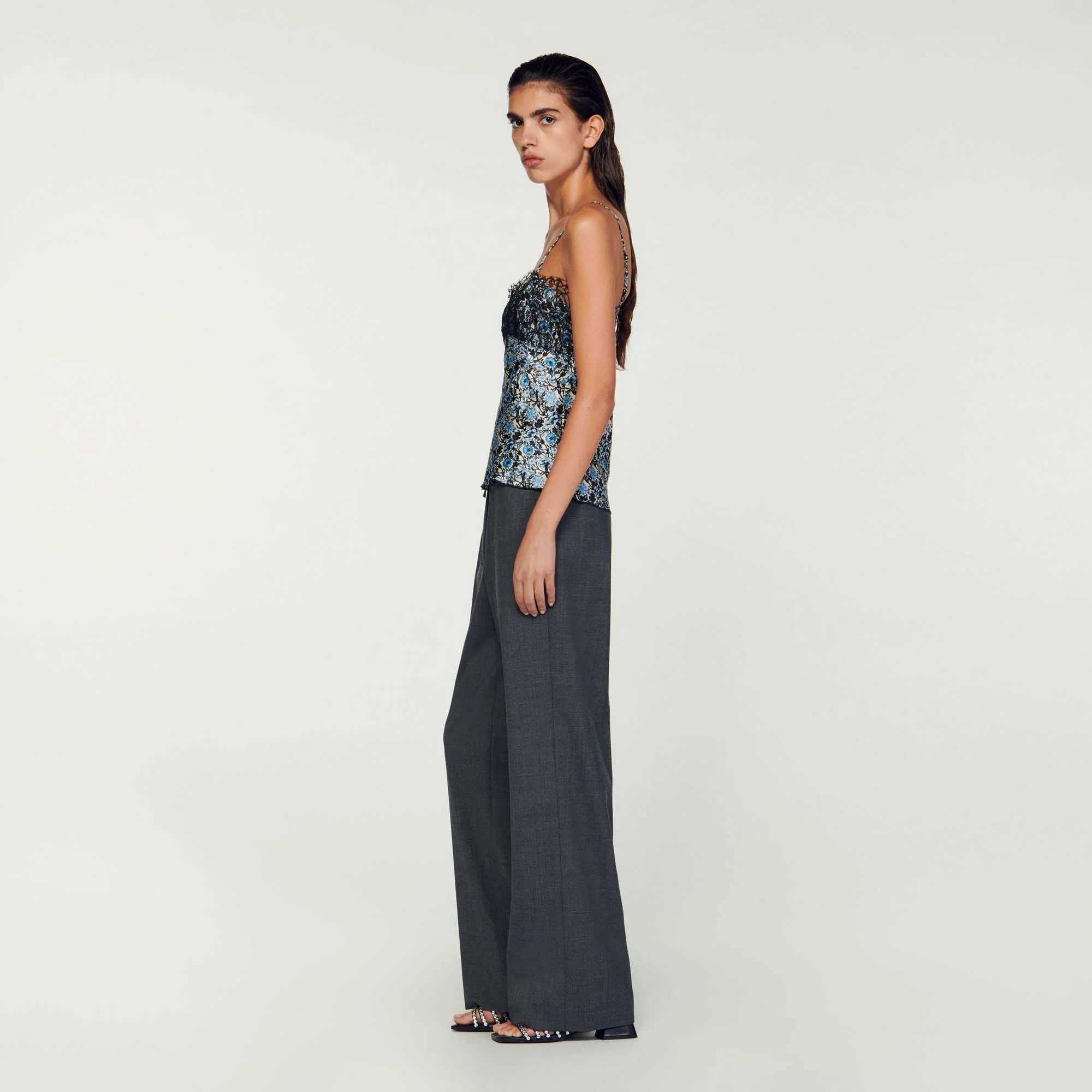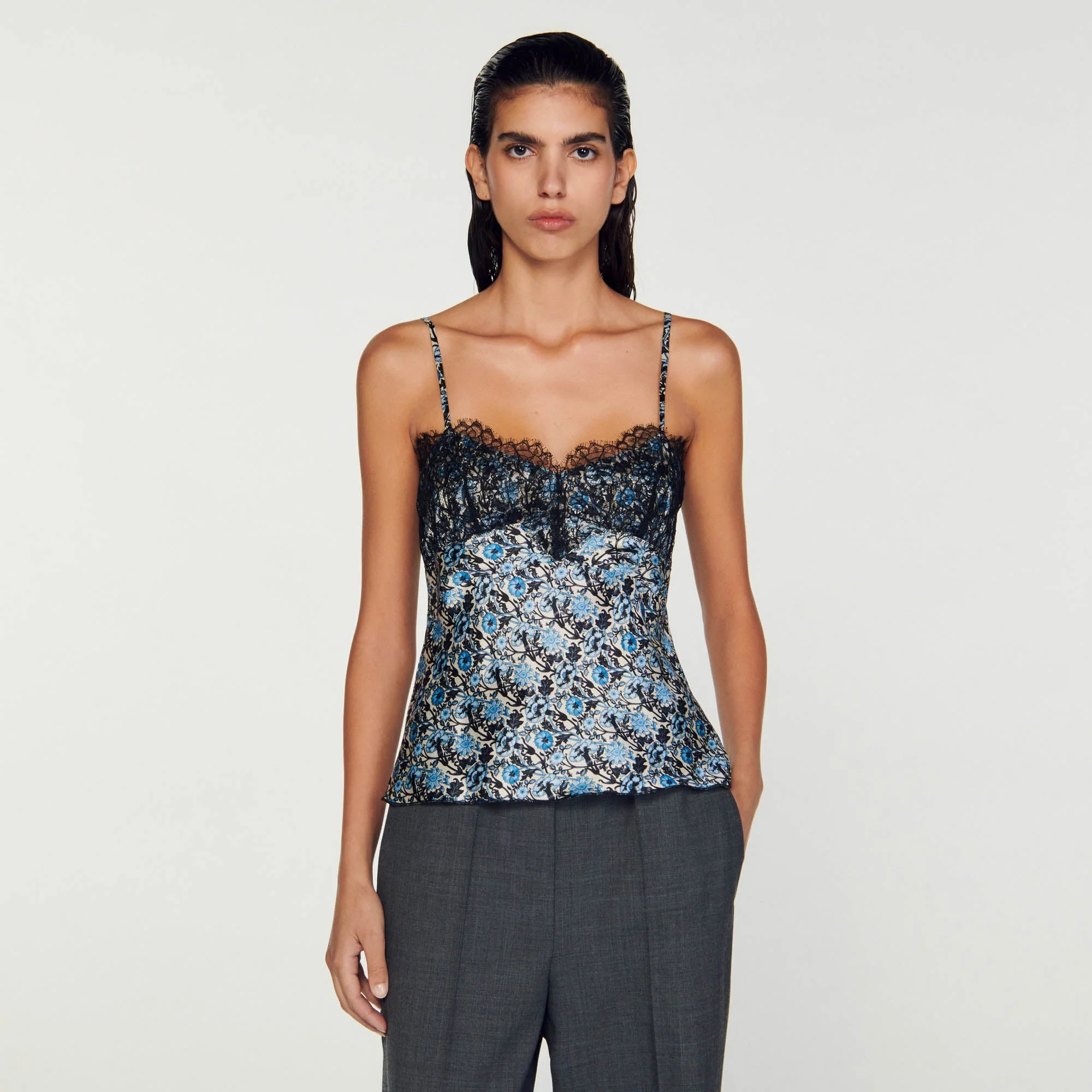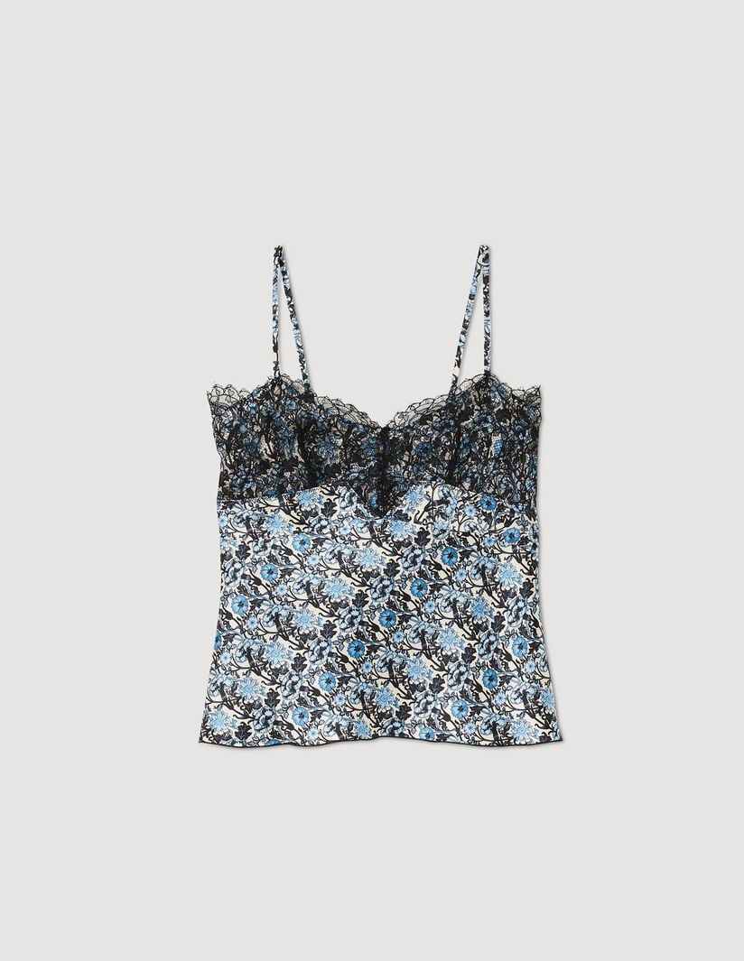 Camisola fluida estampada de tirantes finos y escote sublimado con un encaje en contraste.• Camisola fluida Sandro de mujer
