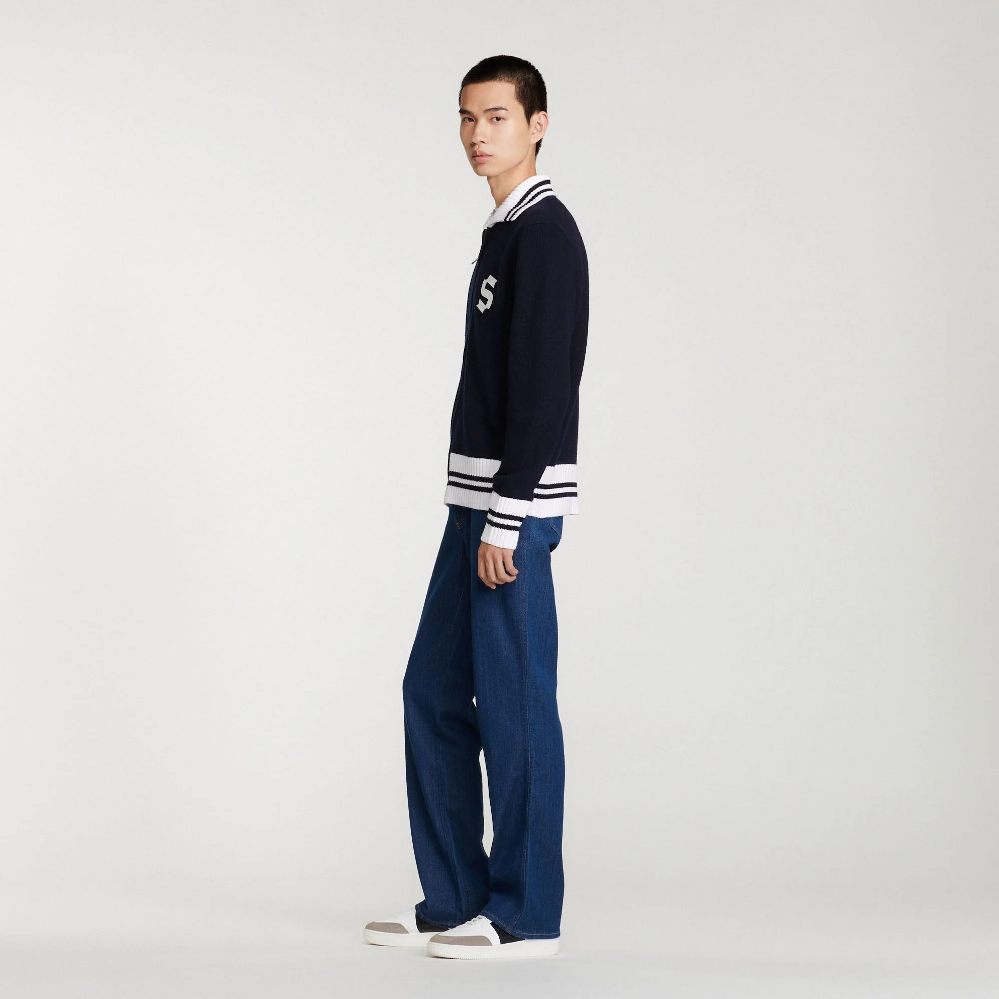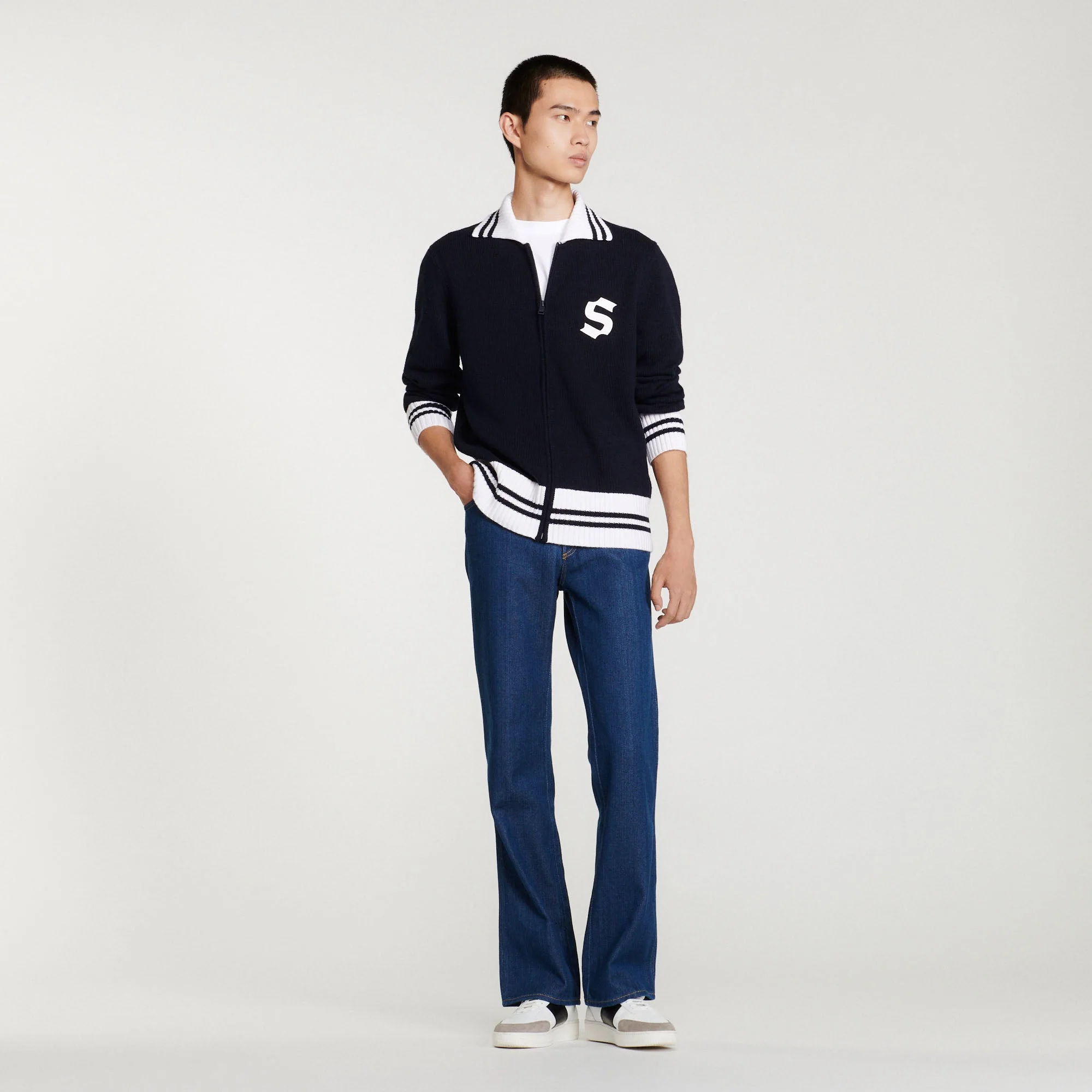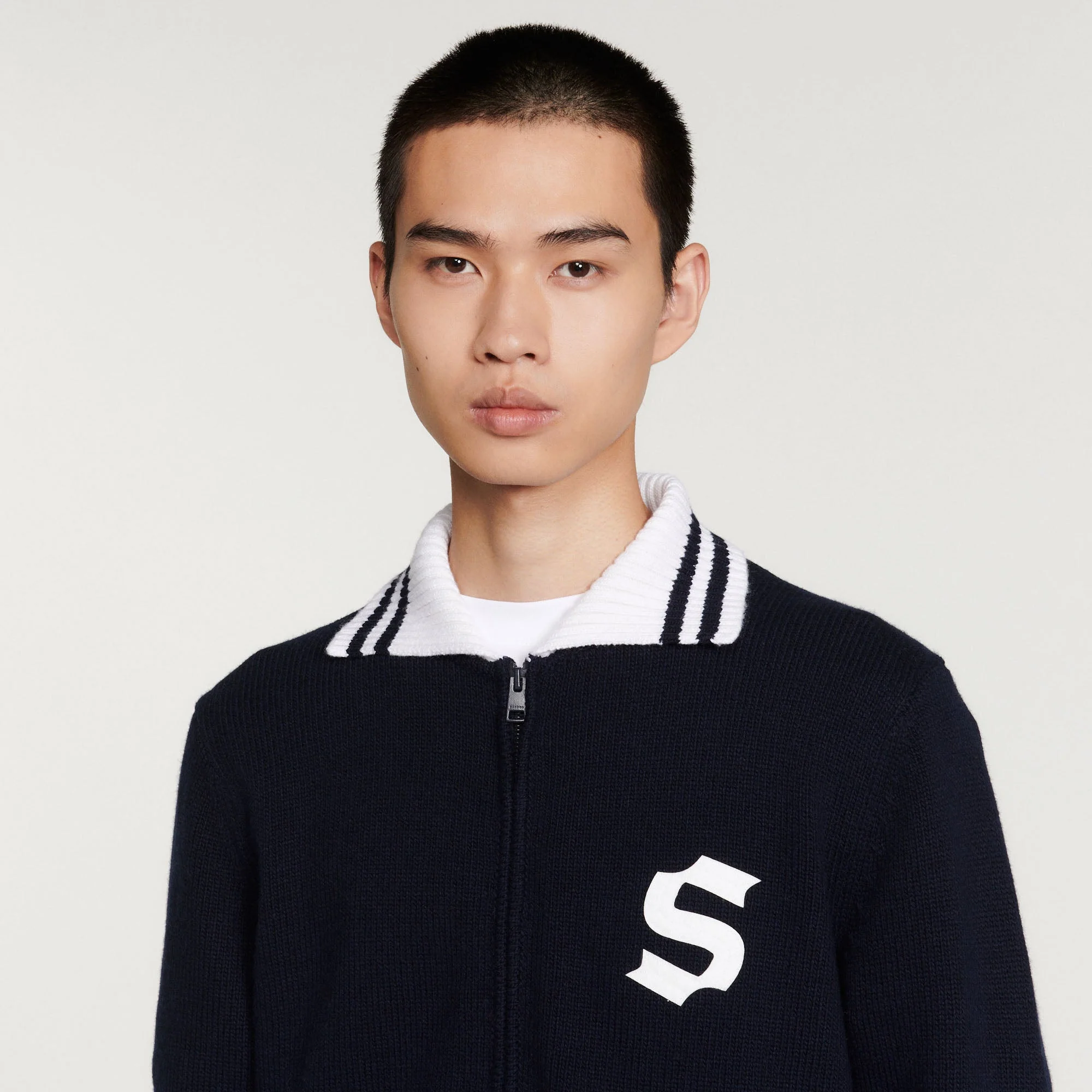 Cárdigan de manga larga y cuello de rayas de punto de jersey con cierre de cremallera, sublimado con un parche S de fieltro.