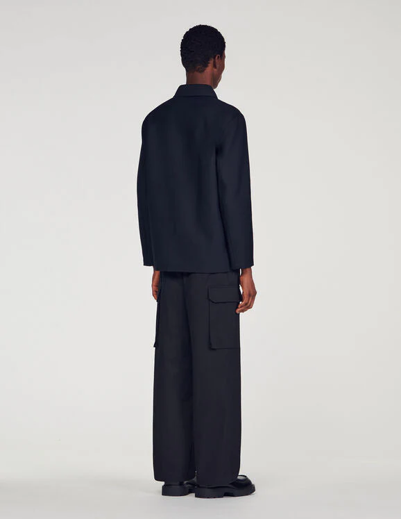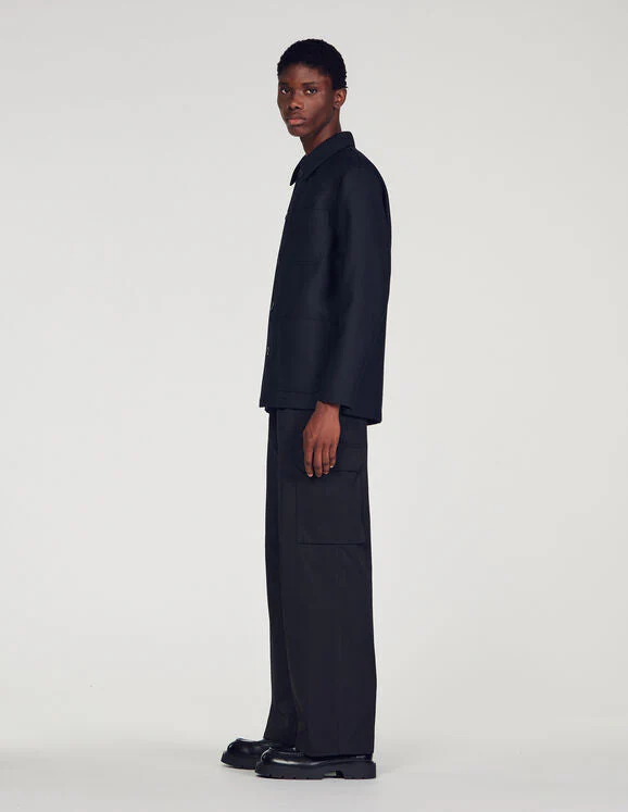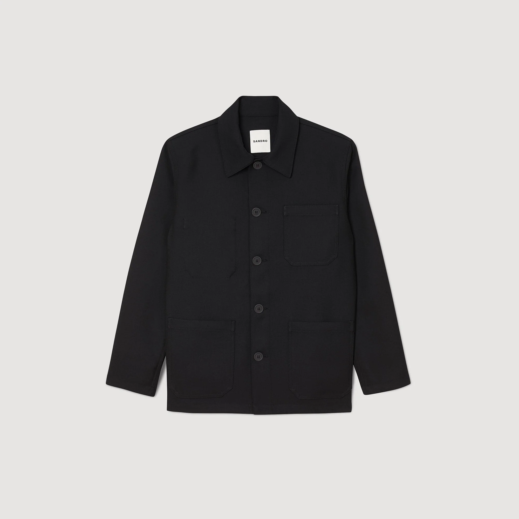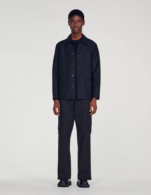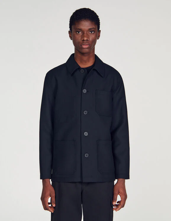 Cazadora de estilo trabajador con cuello de camisa, mangas largas, cierre de botones, bolsillo de parche en el pecho y dos bolsillos delanteros.• Cazadora de trabajador Sandro Homme