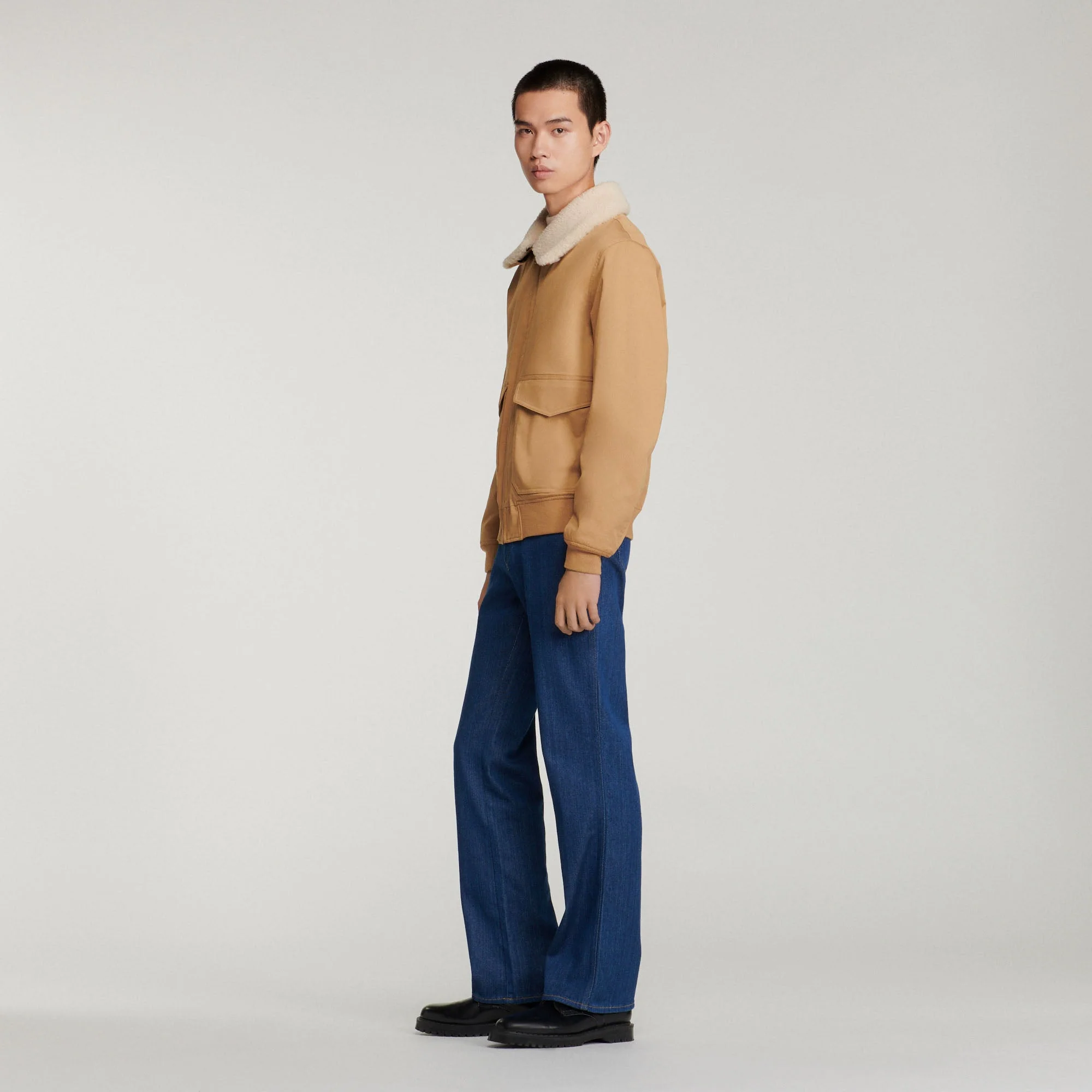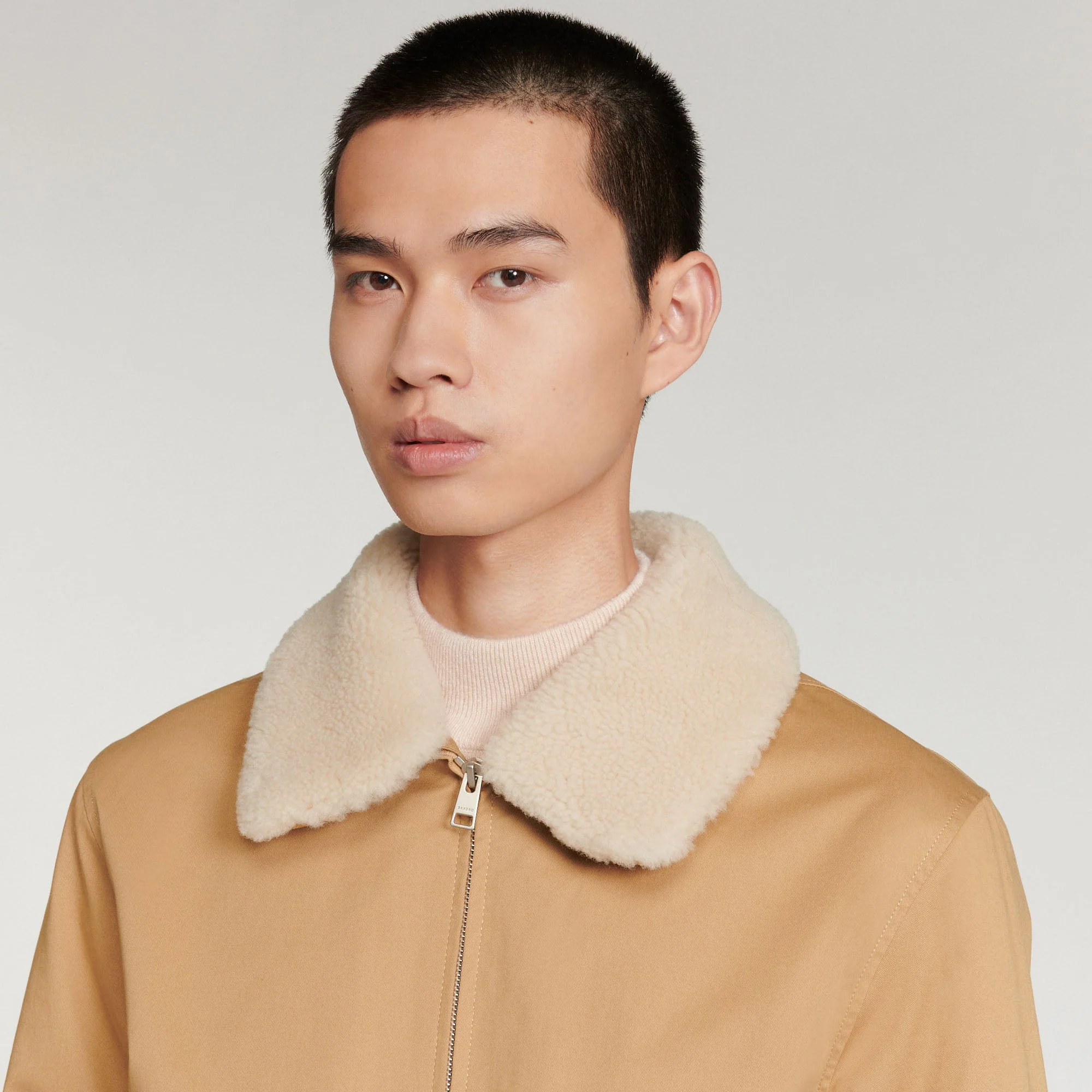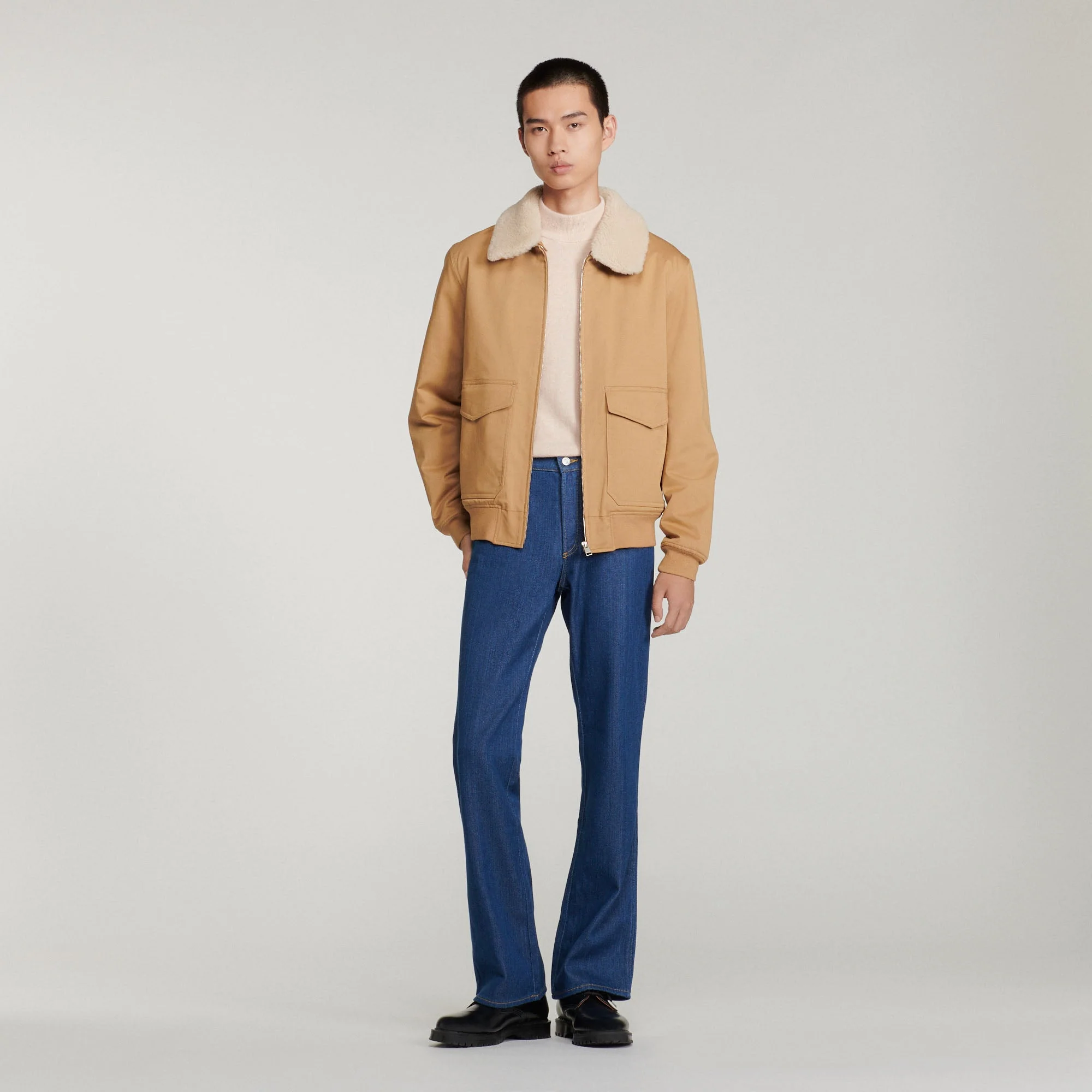 Cazadora estilo aviador de algodón de cuello de piel de cordero vuelta extraíble, con cierre de cremallera y bolsillos de parche.