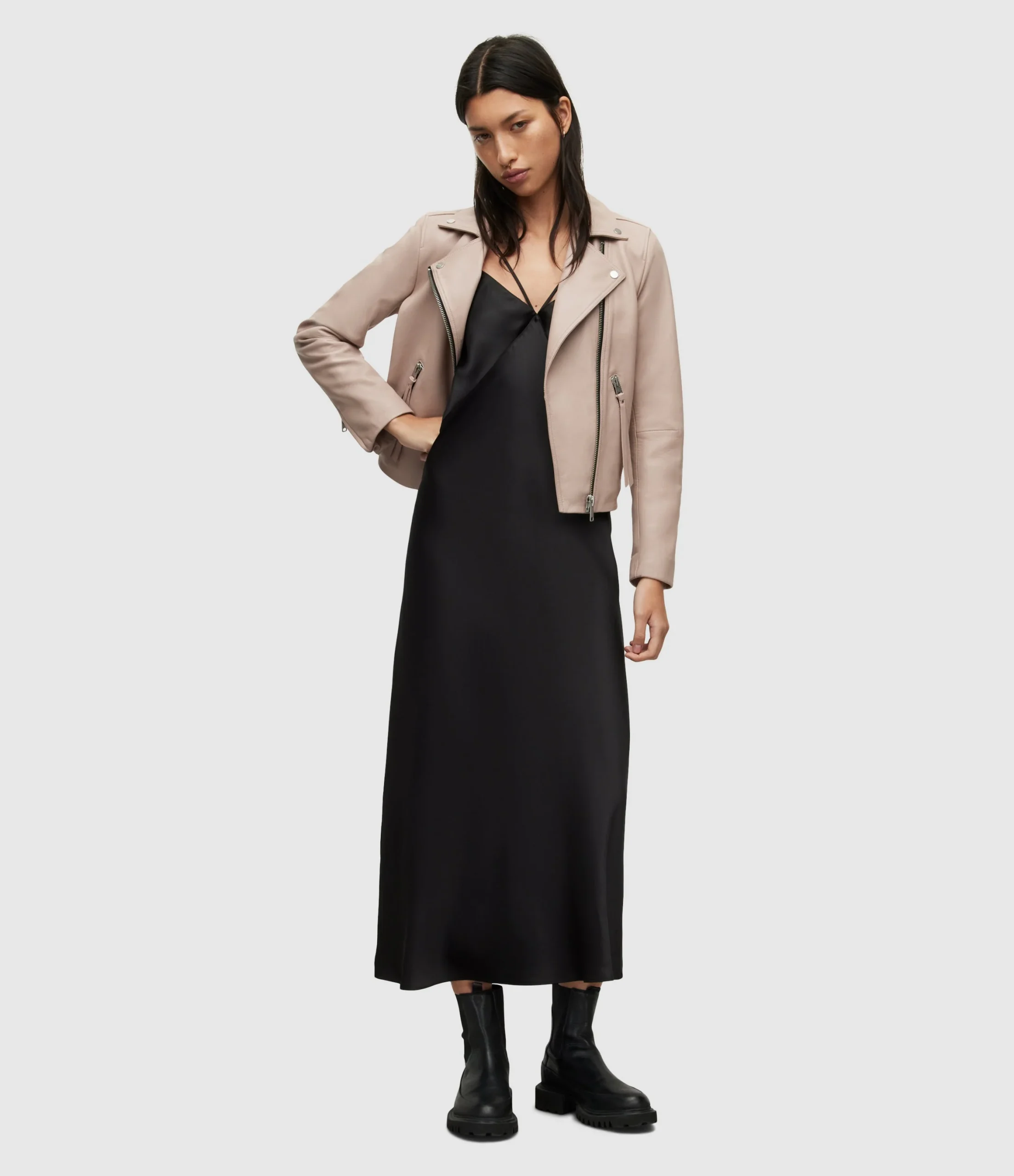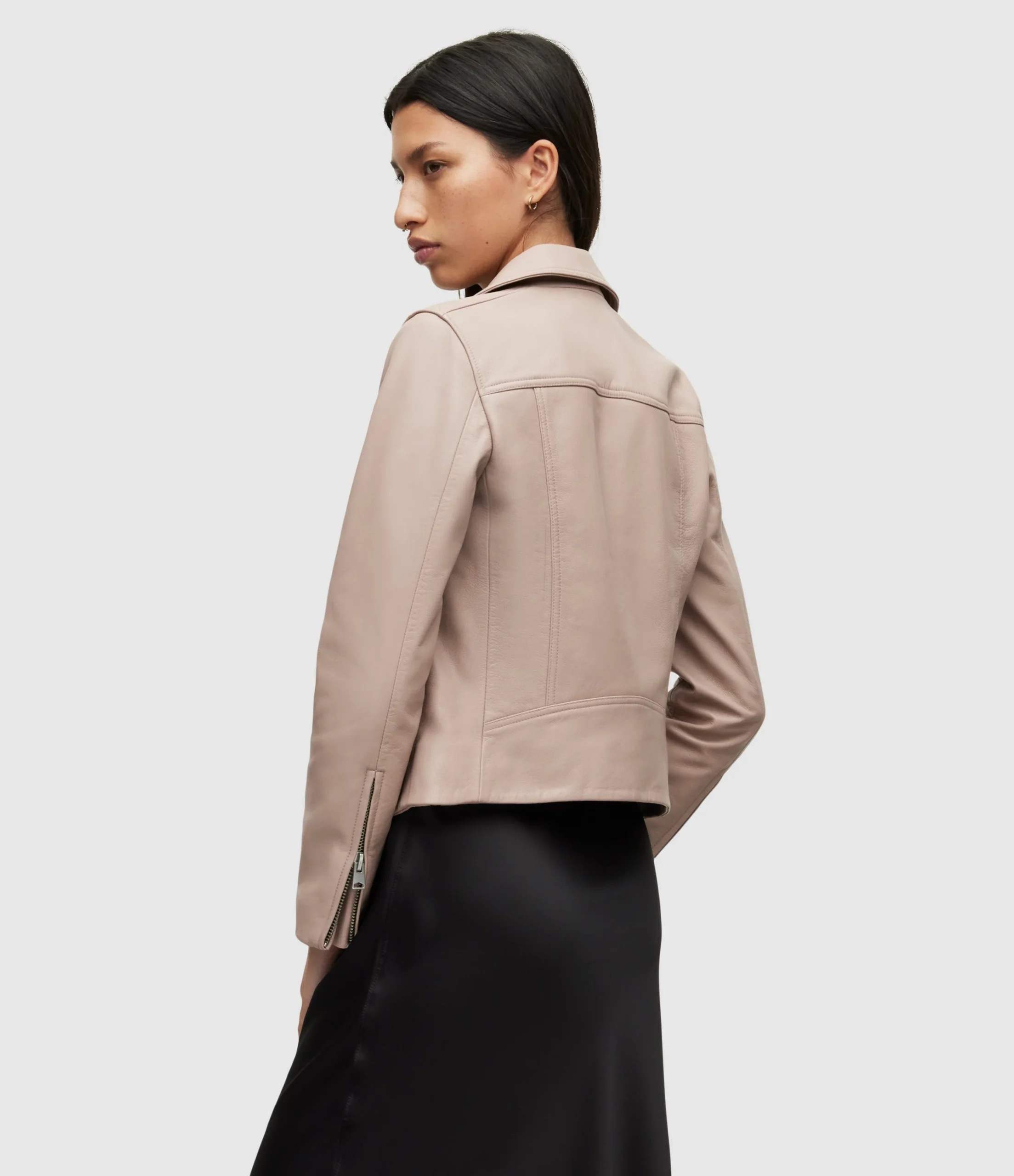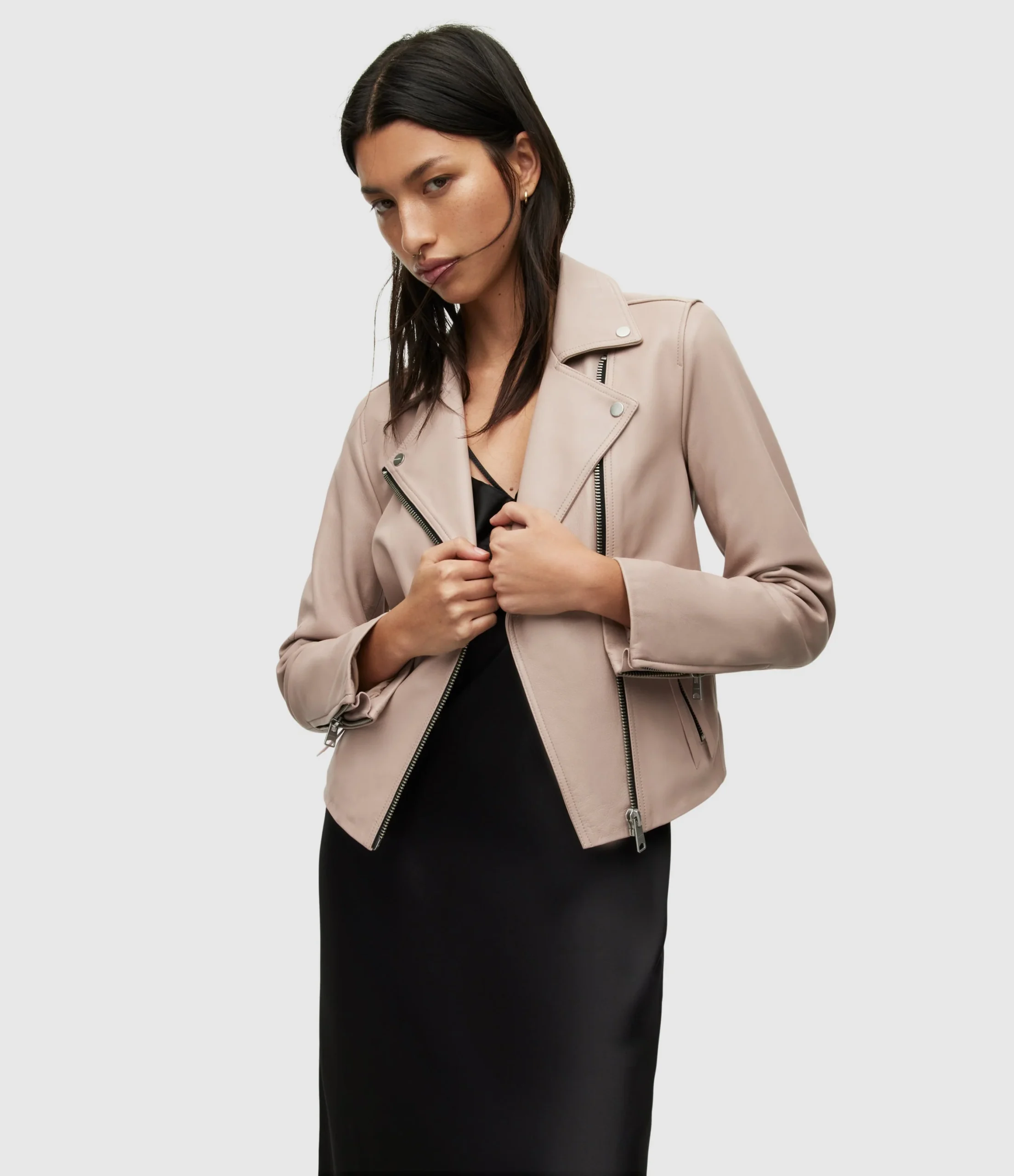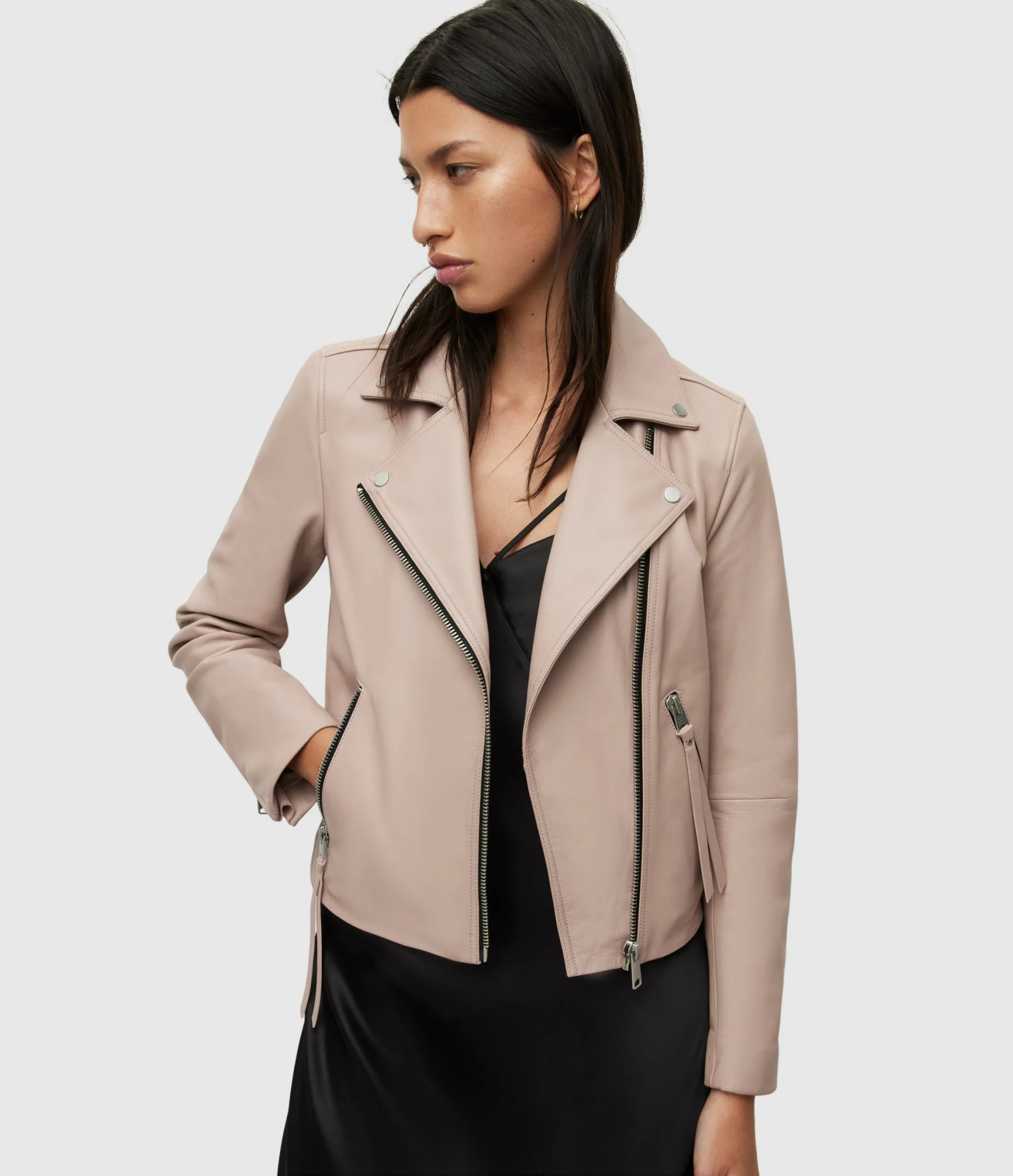 Chamarra Dalby Rosa para mujer, marca AllSaints, estilo biker. COMPOSICIÓN Y LAVADO: Consultar etiqueta interna.