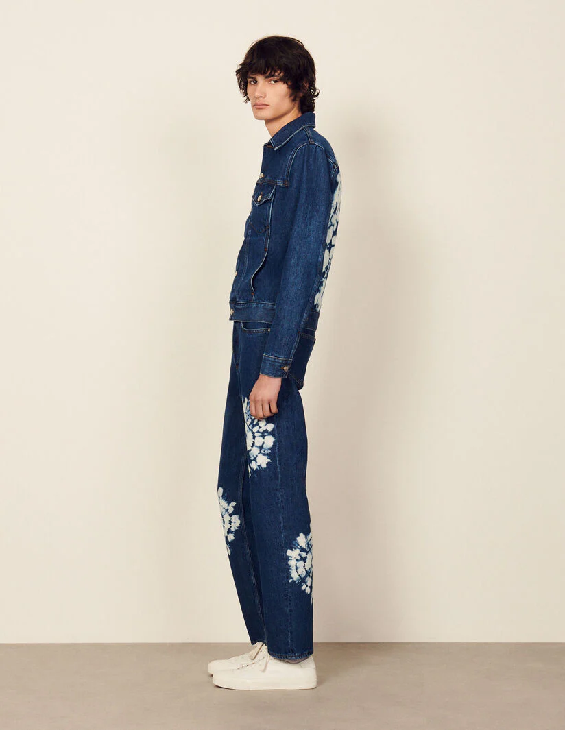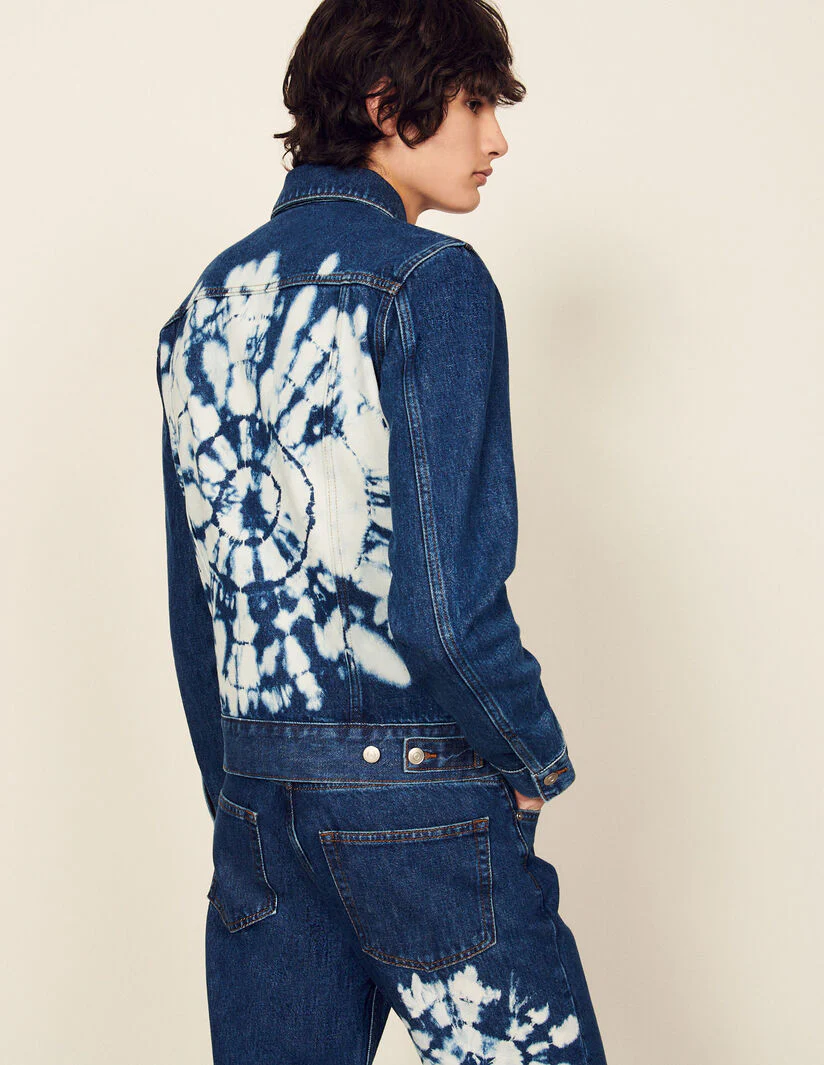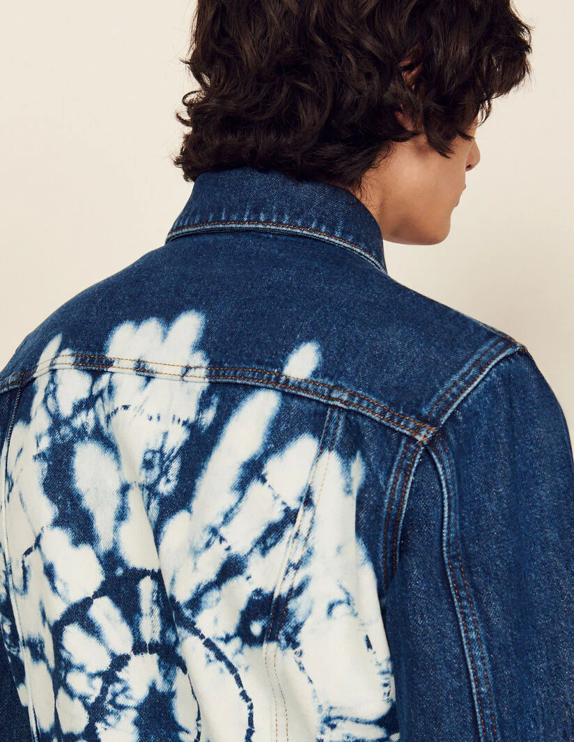 Cazadora de denim sublimada con un motivo tie & dye artesanal en la parte trasera, con bolsillos con solapa en el pecho y una tapeta de botones.