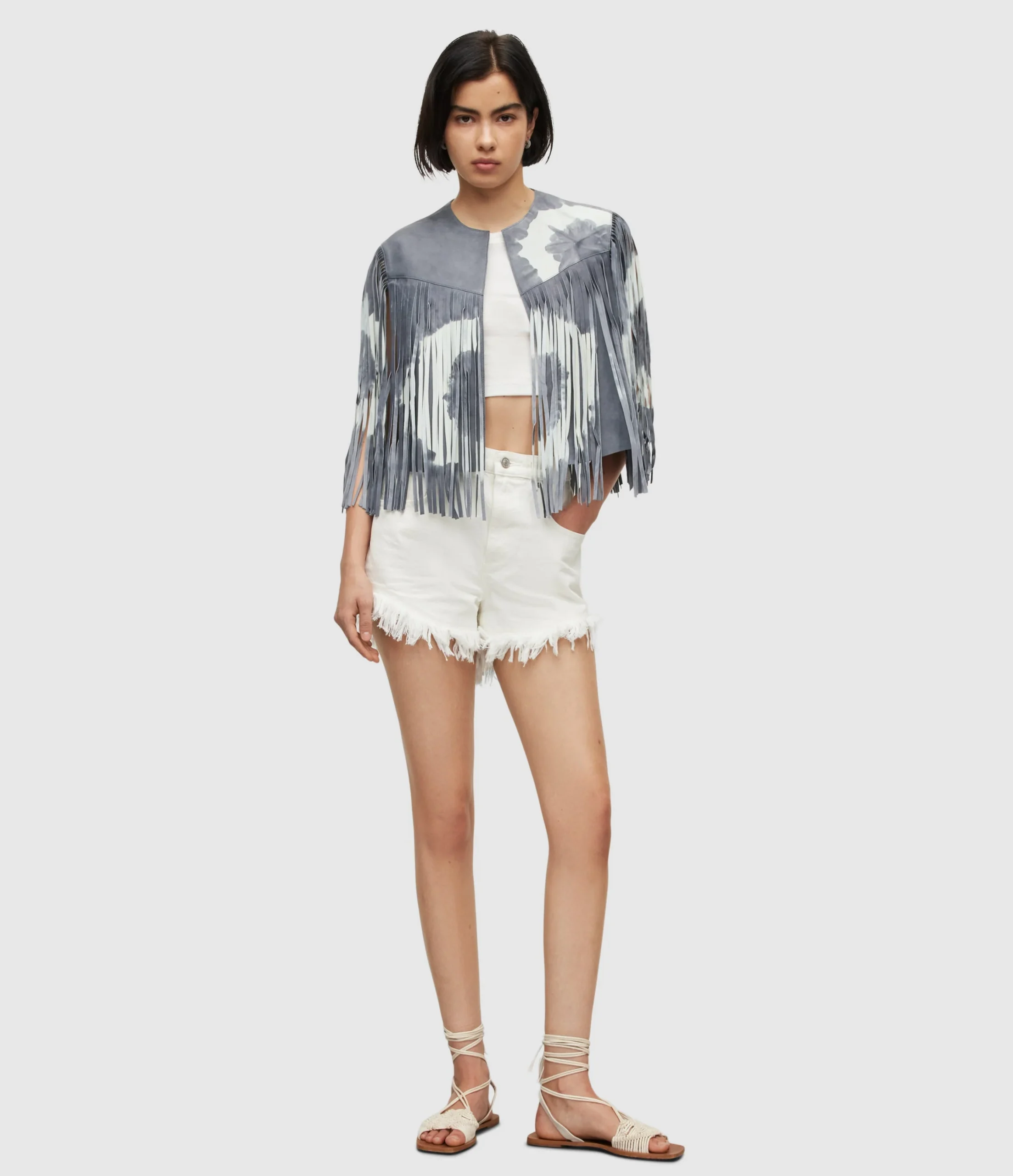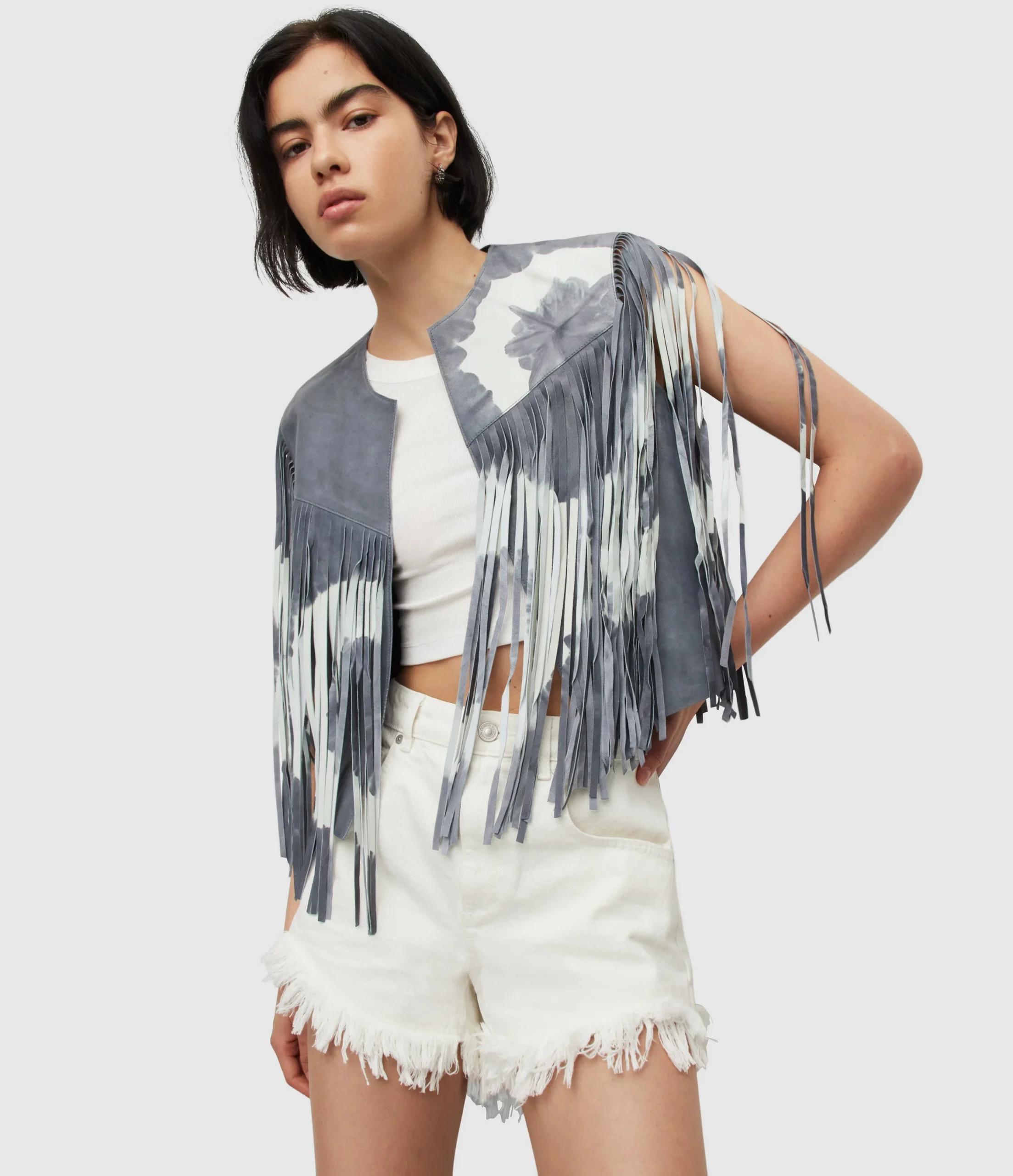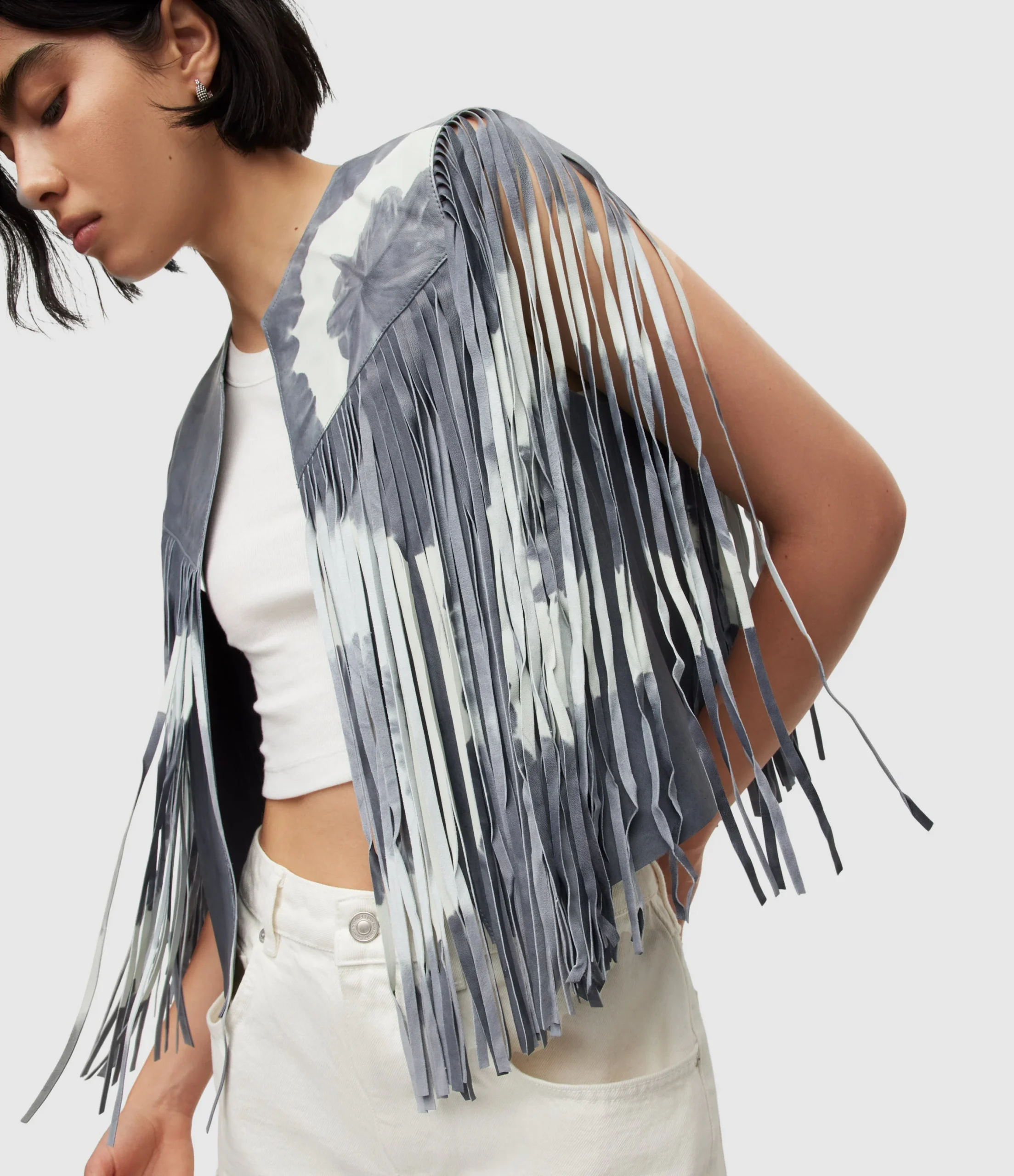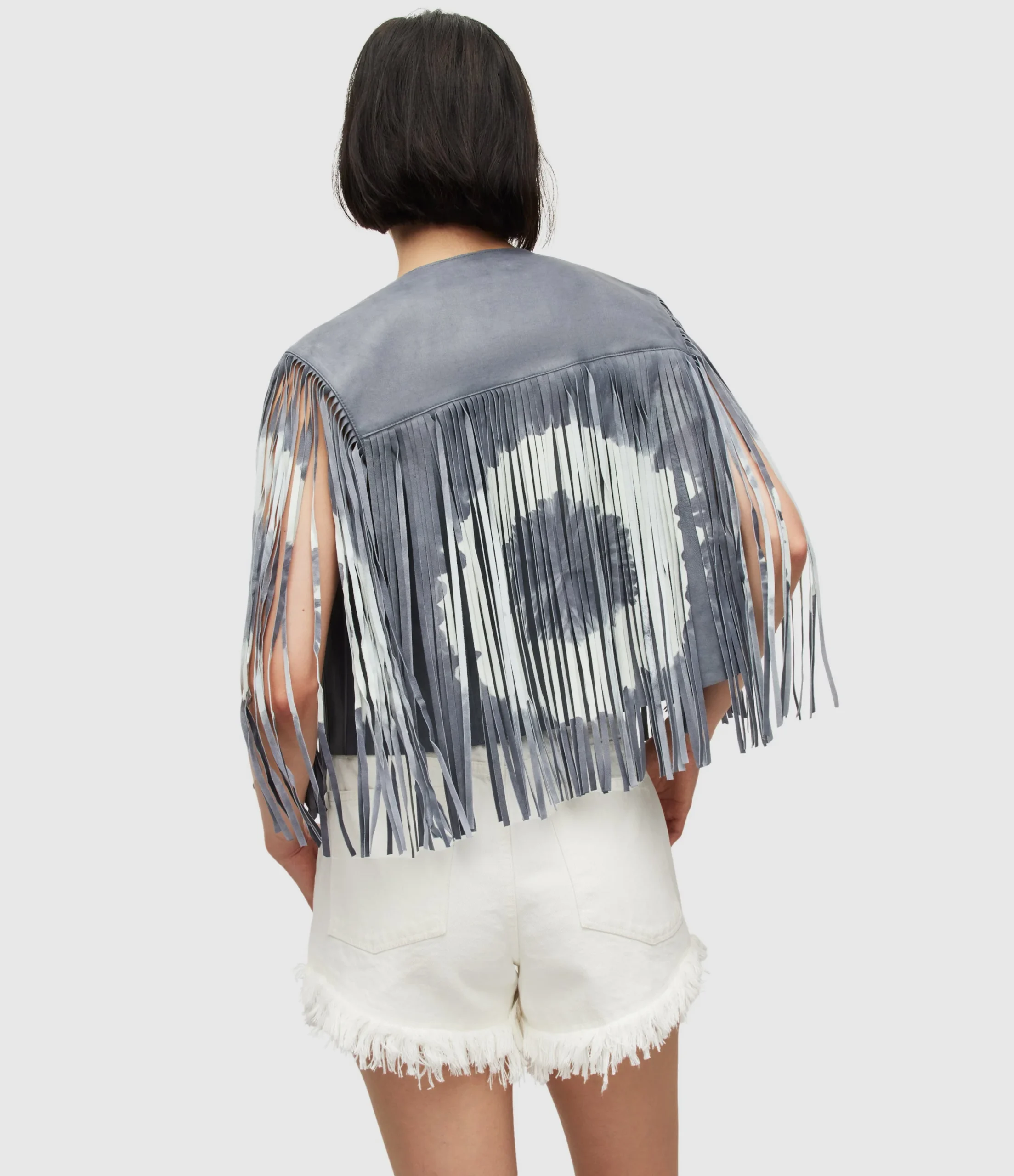 Chamarra Evie Tydy Tassel Azul Medio para mujer, marca AllSaints, corta estilo chaleco. COMPOSICIÓN Y LAVADO: Consultar etiqueta interna.