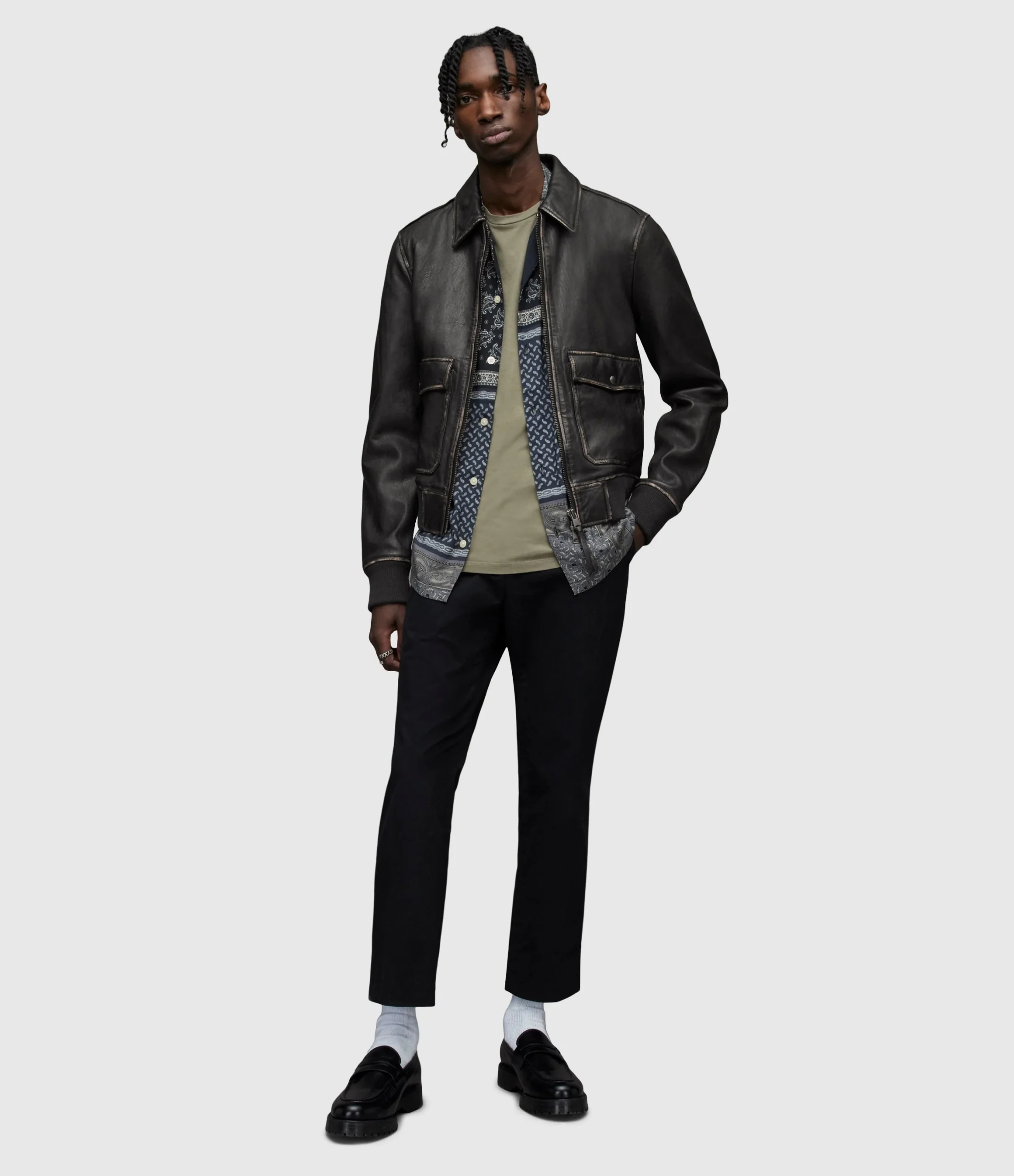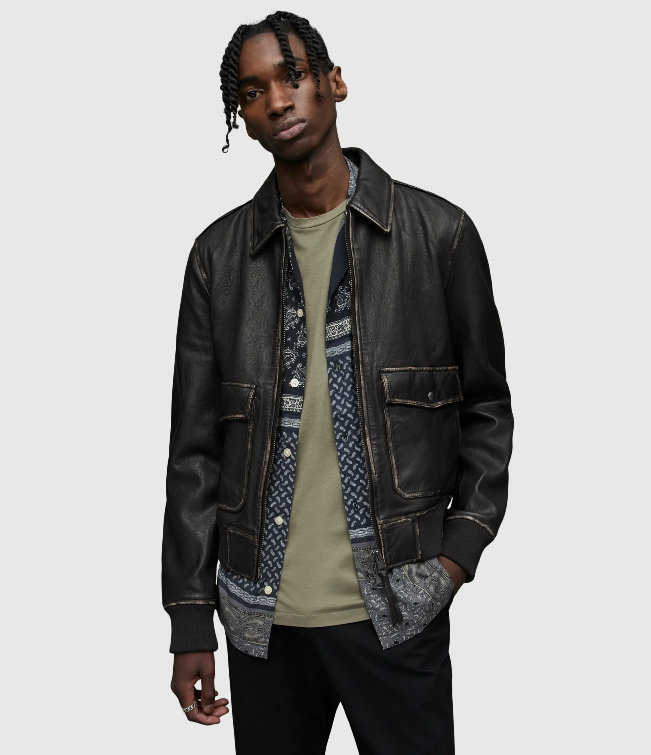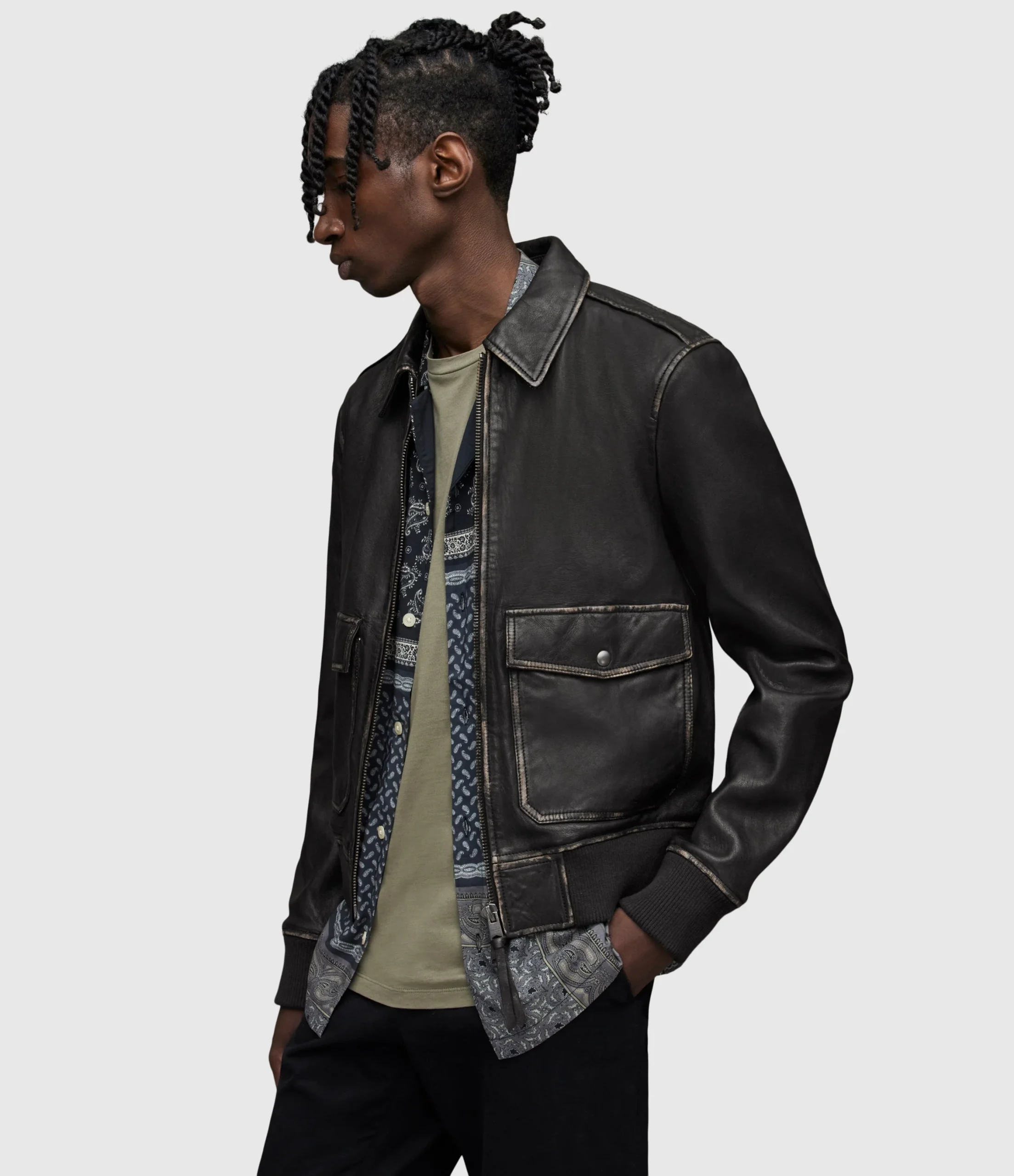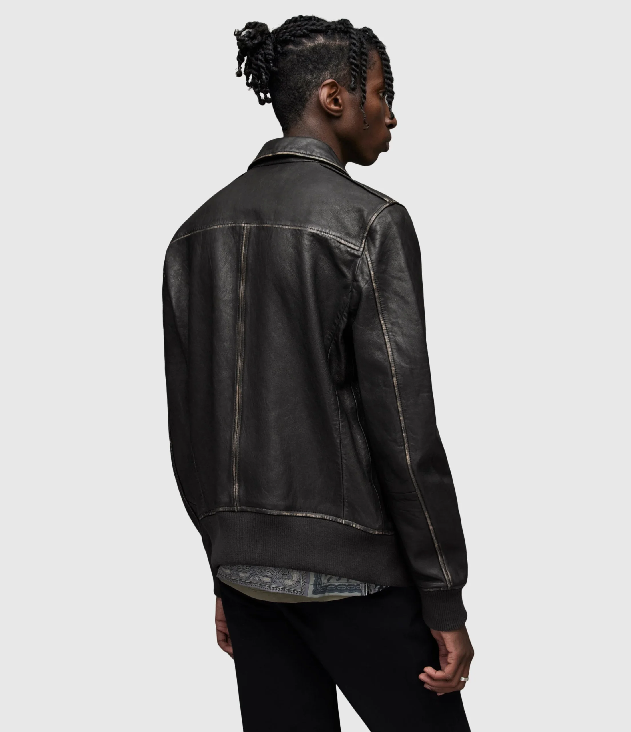 Chamarra Leroy Negro para hombre, marca AllSaints. COMPOSICIÓN Y LAVADO: Consultar etiqueta interna.