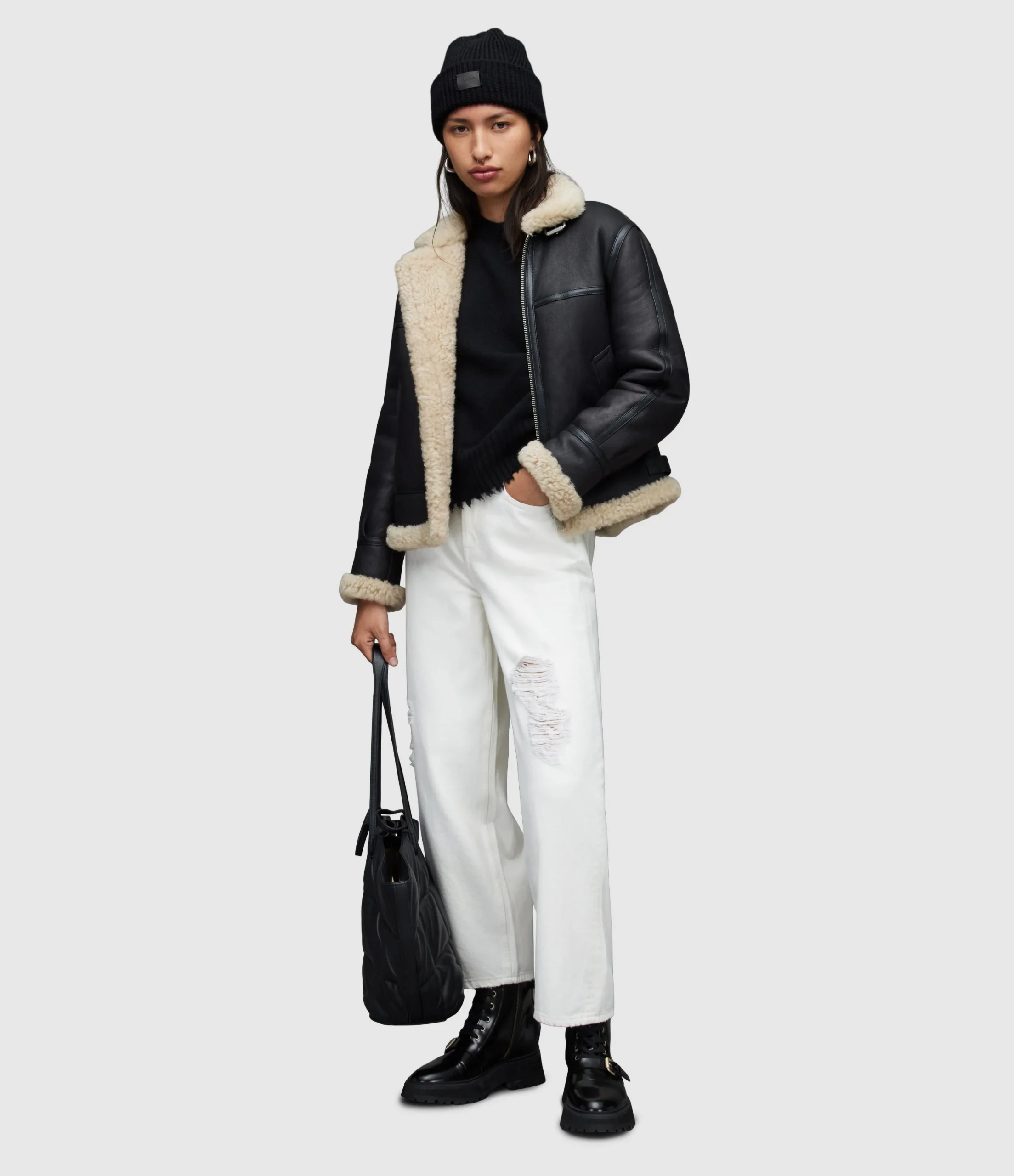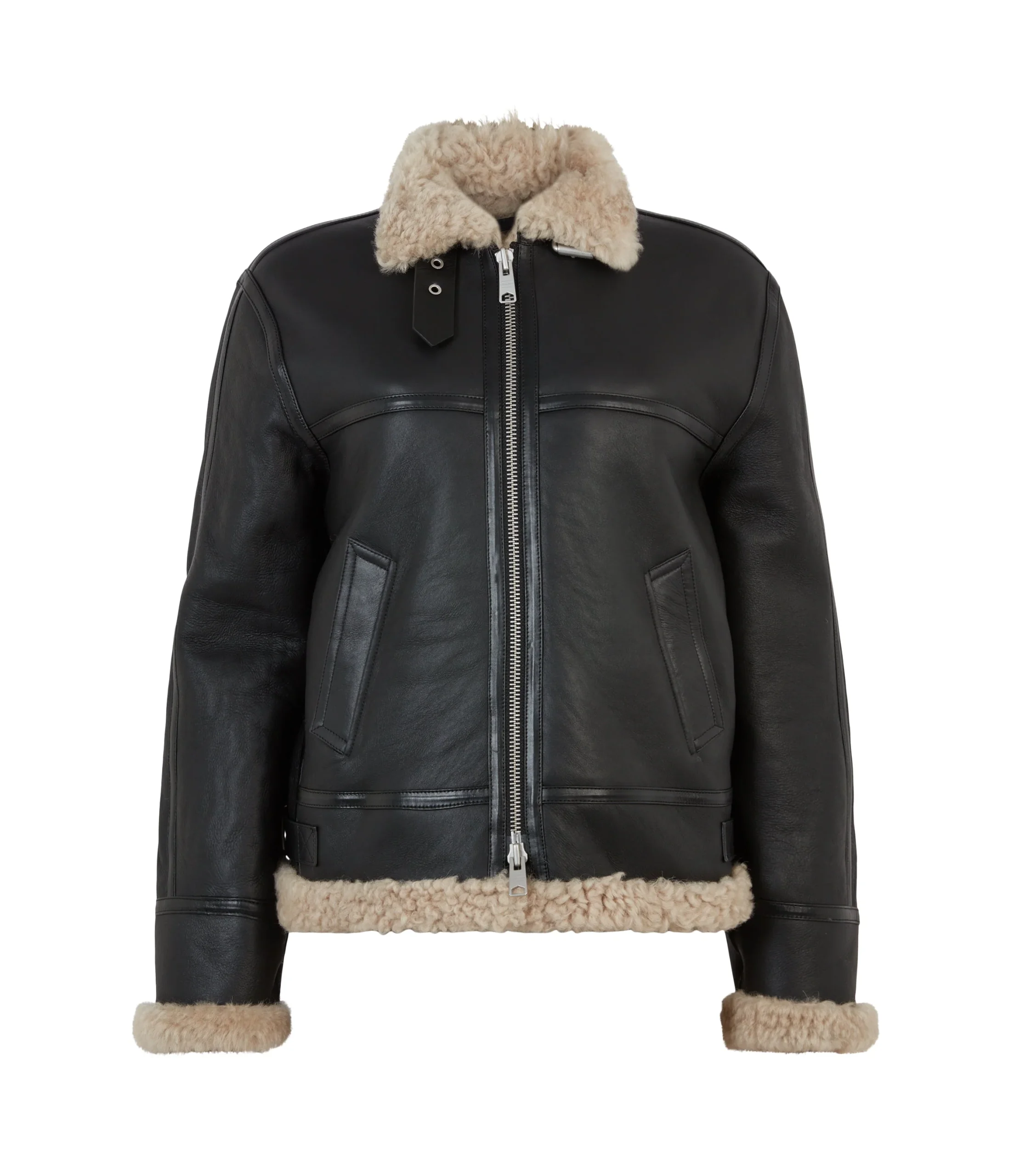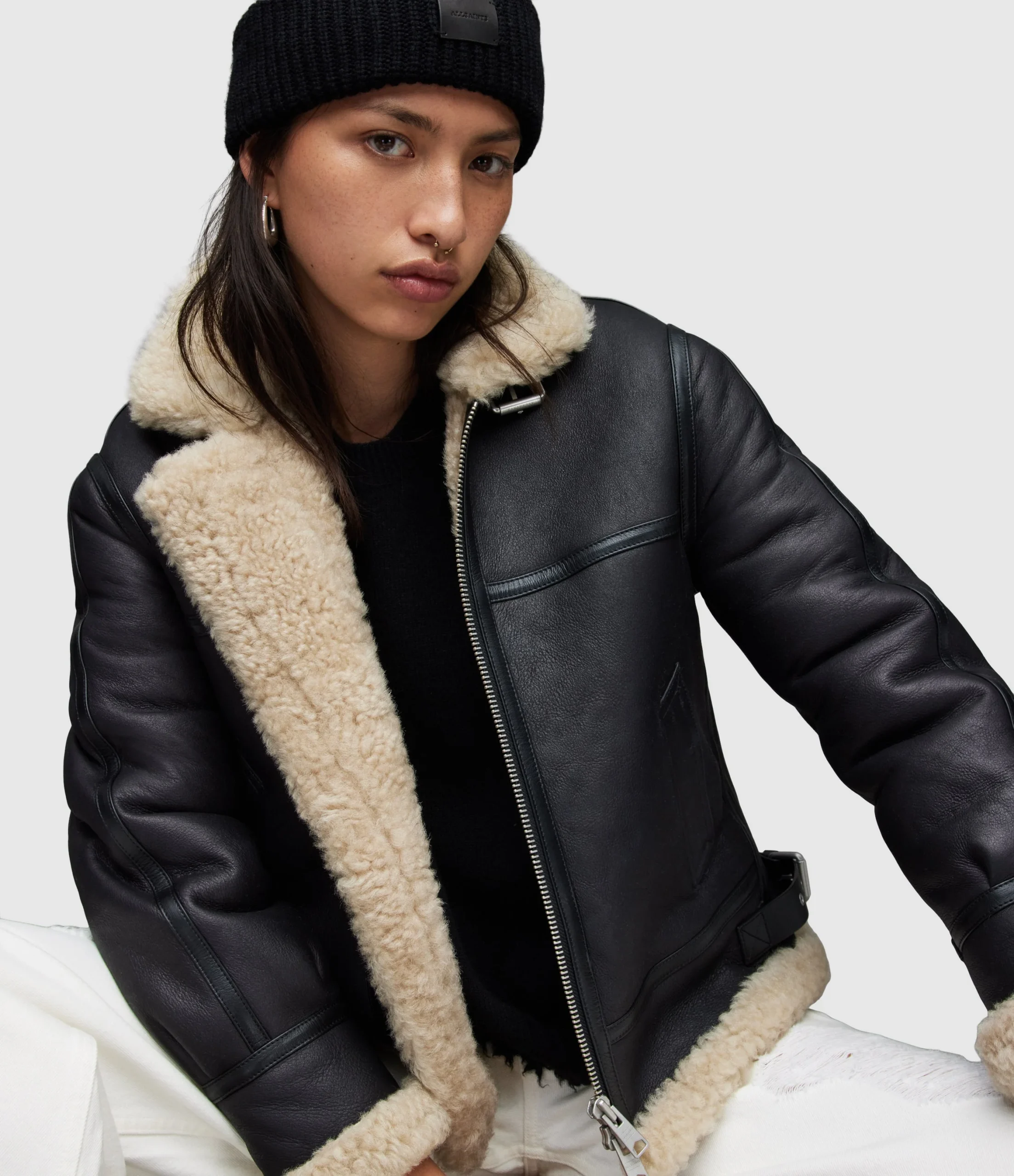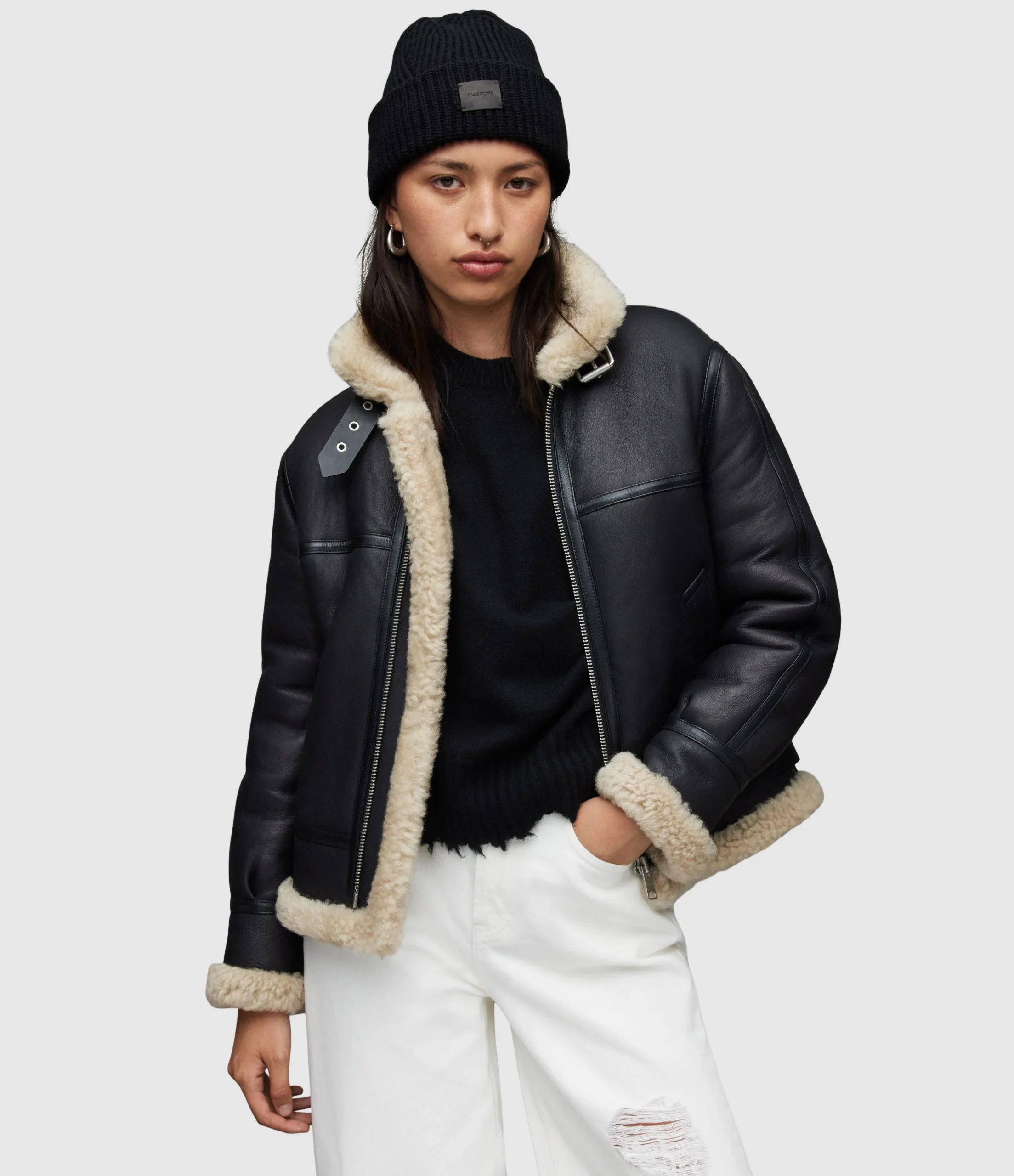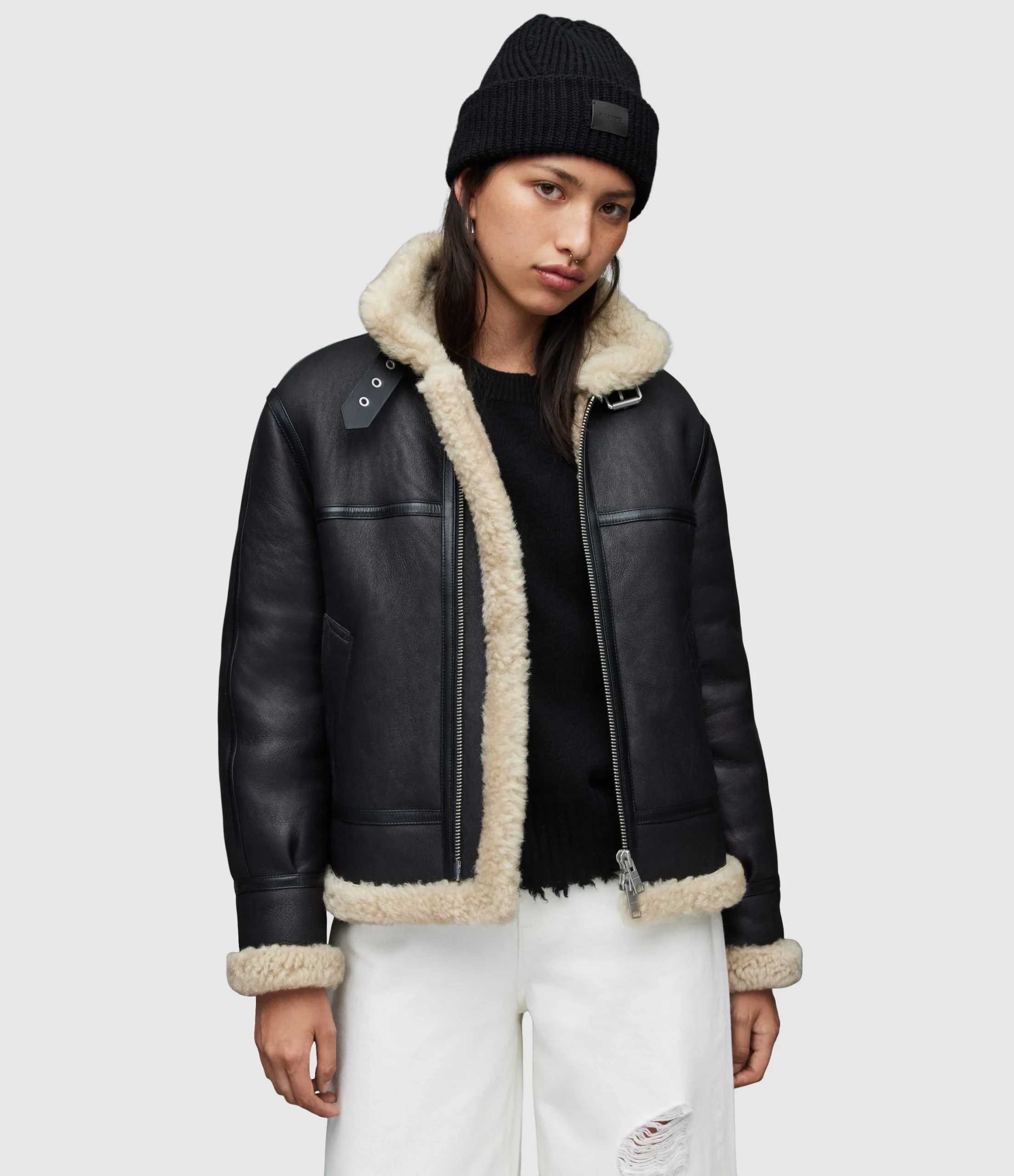 Chamarra Lorel Flying Negro para mujer, marca AllSaints. COMPOSICIÓN Y LAVADO: Consultar etiqueta interna.