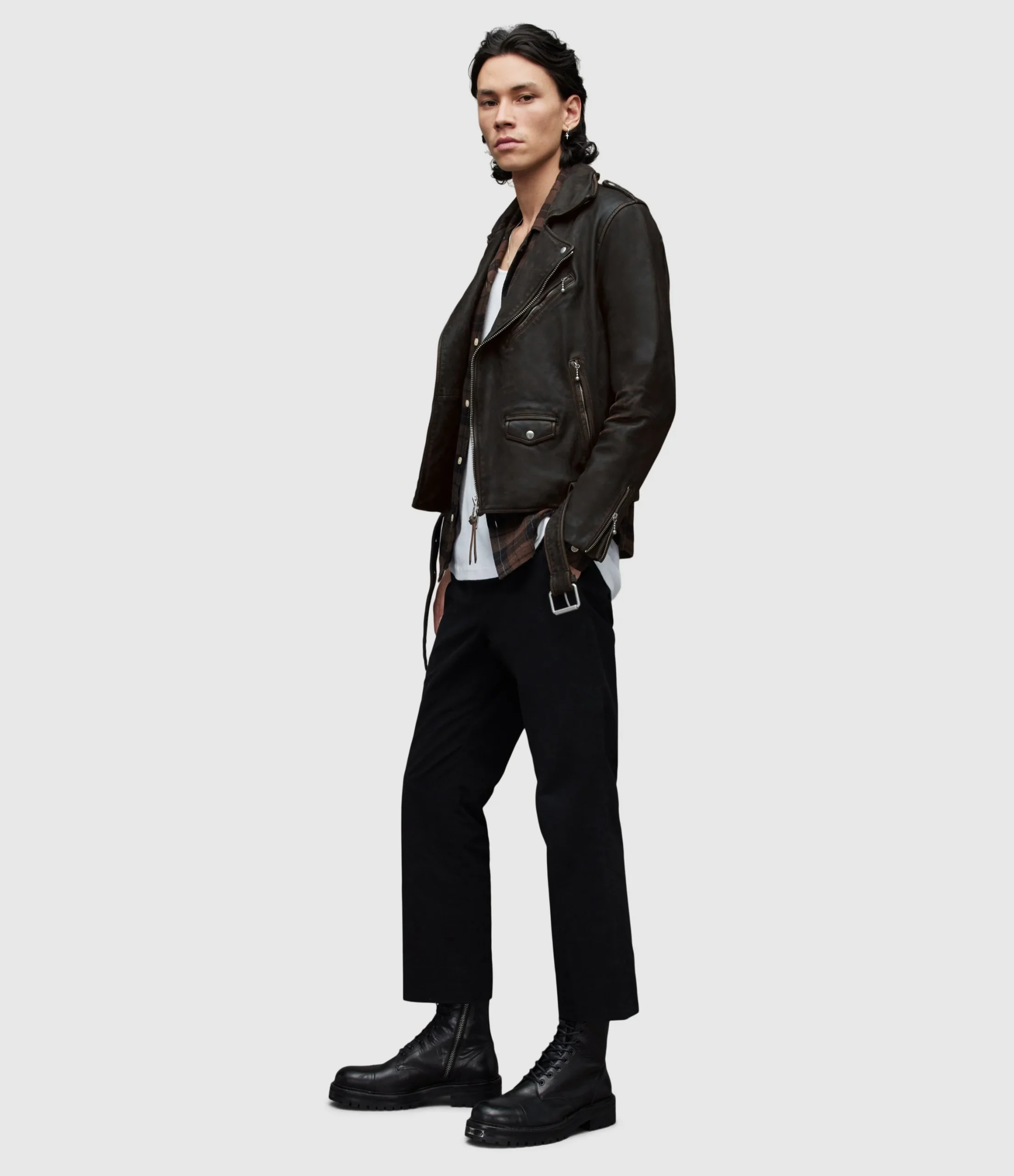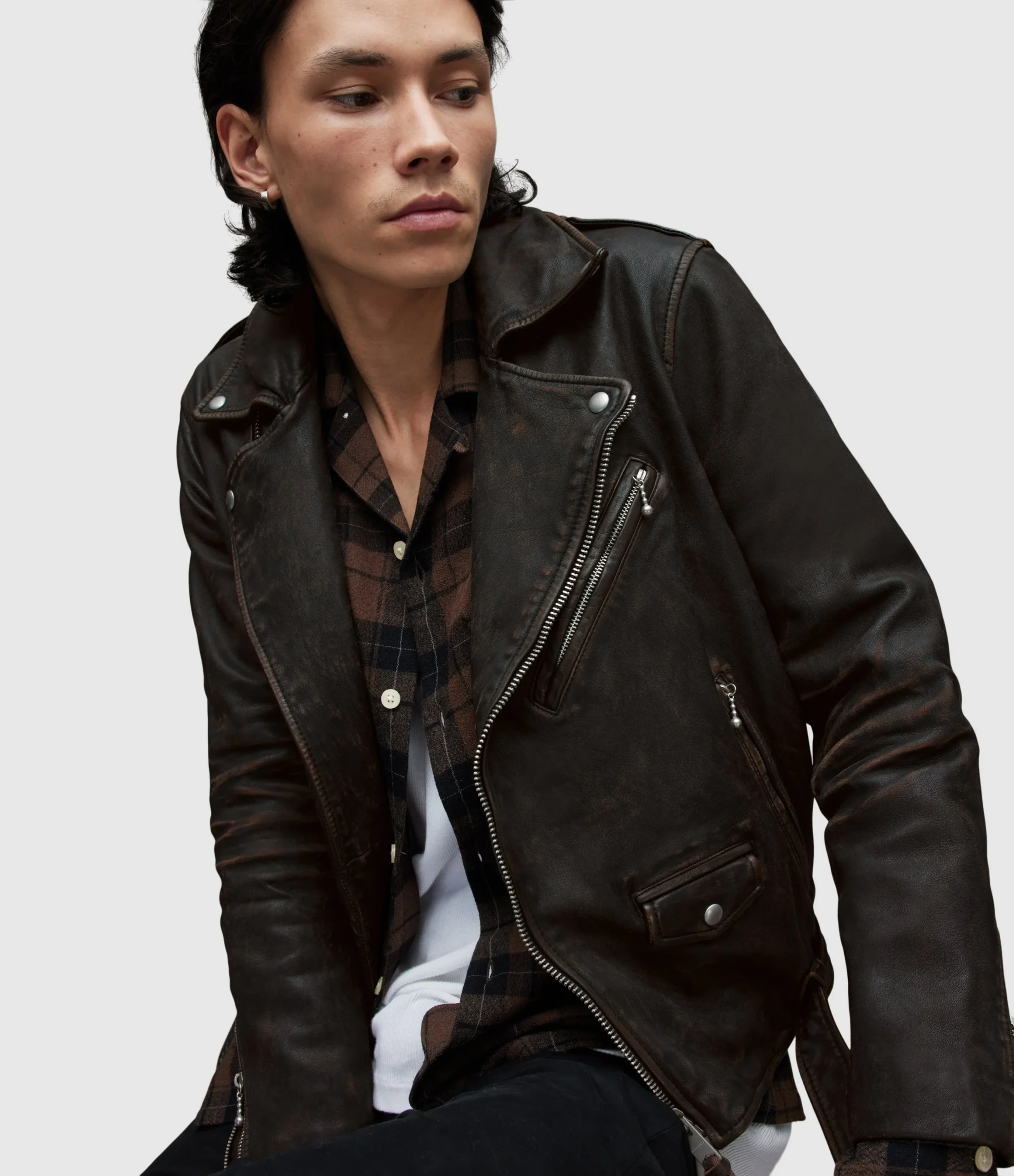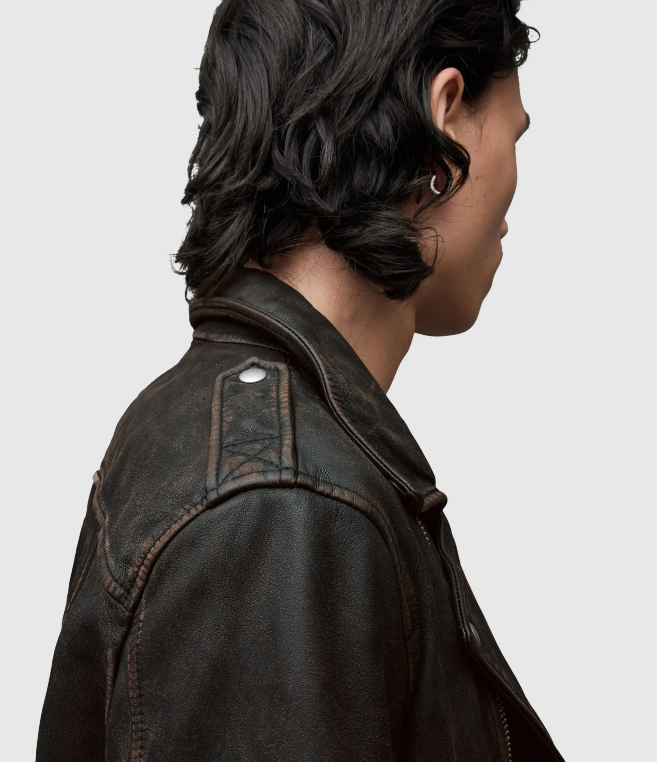 Chamarra Torren Café para hombre, marca AllSaints, estilo biker. COMPOSICIÓN Y LAVADO: Consultar etiqueta interna.