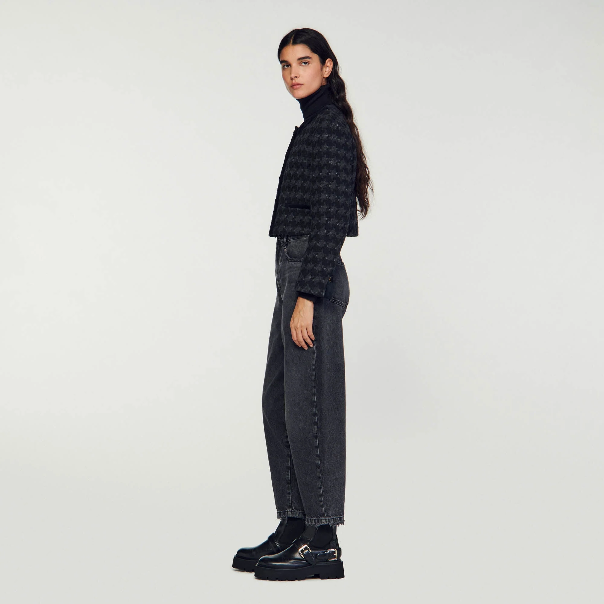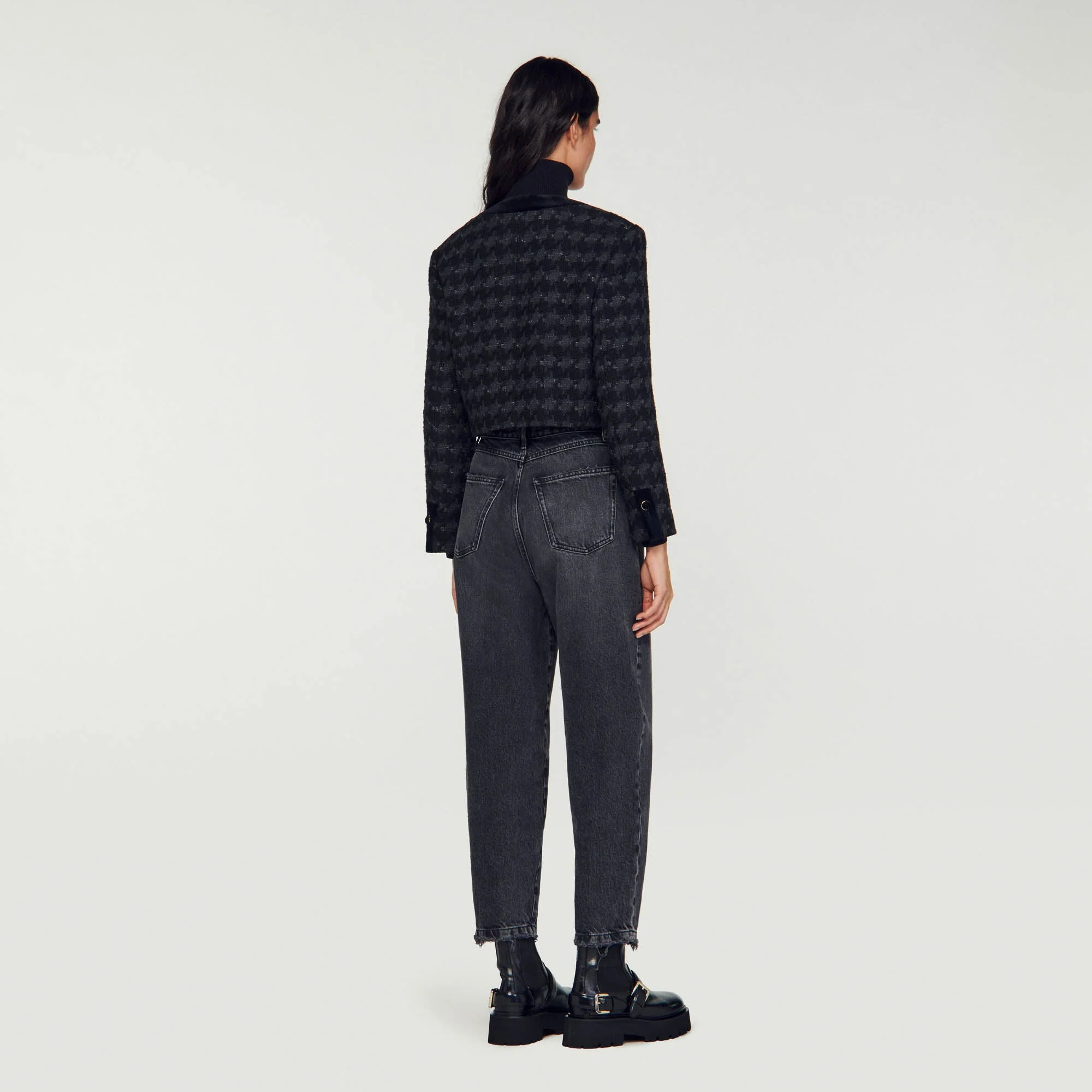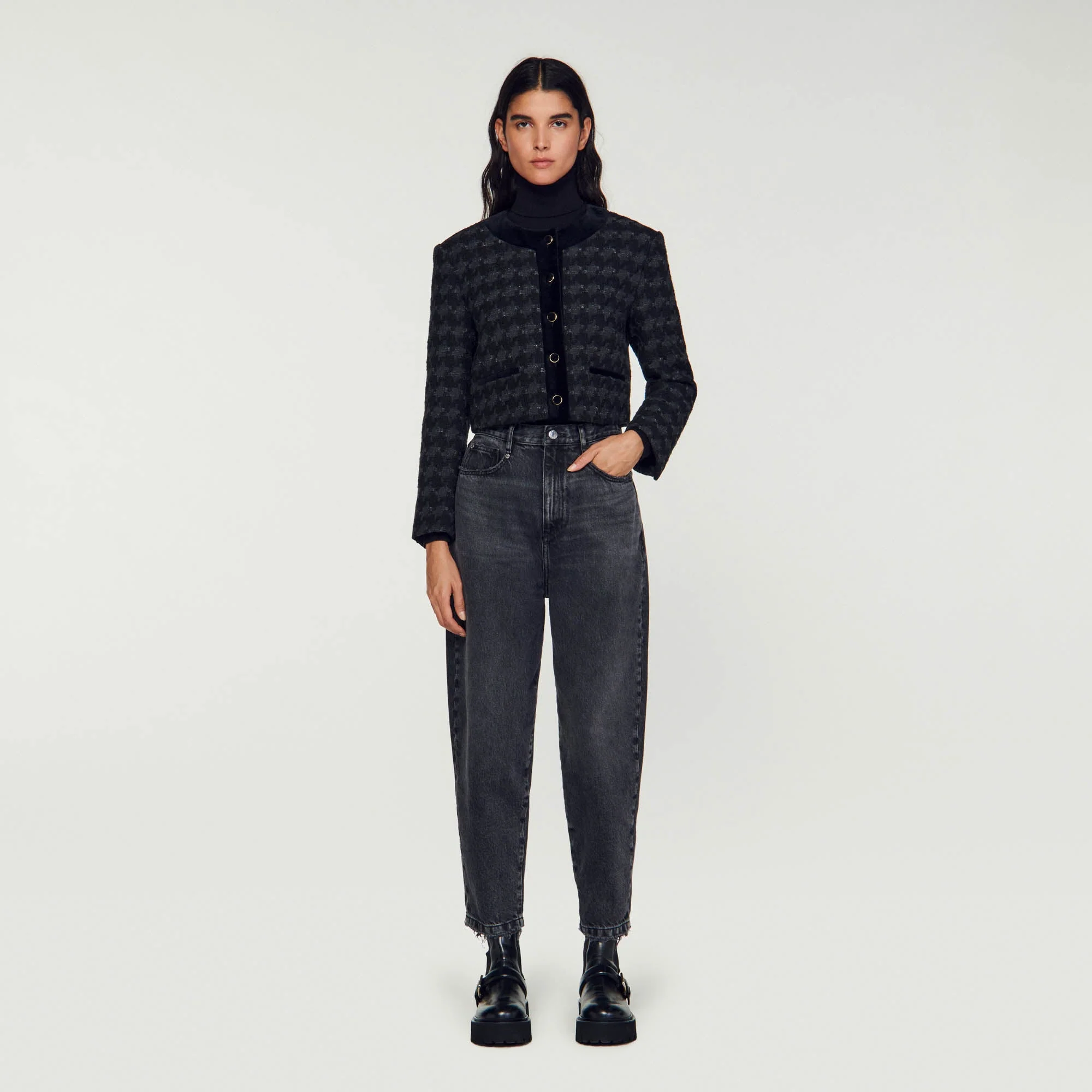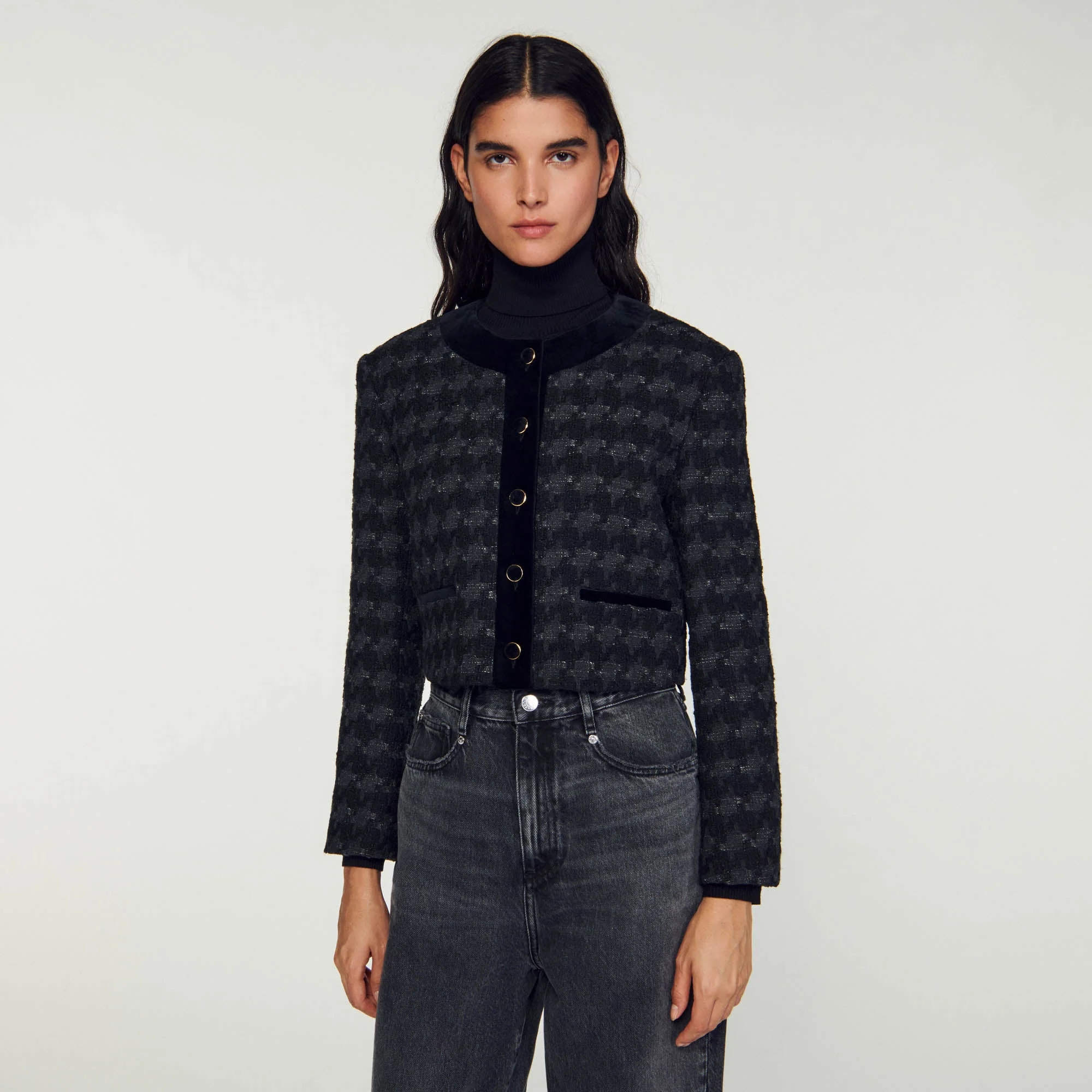 Chaqueta corta de tweed estructurado decorada con estampado de pata de gallo y detalles de terciopelo que contrastan, manga larga y cierre de botones.• Chaqueta corta de tweed Sandro mujer
