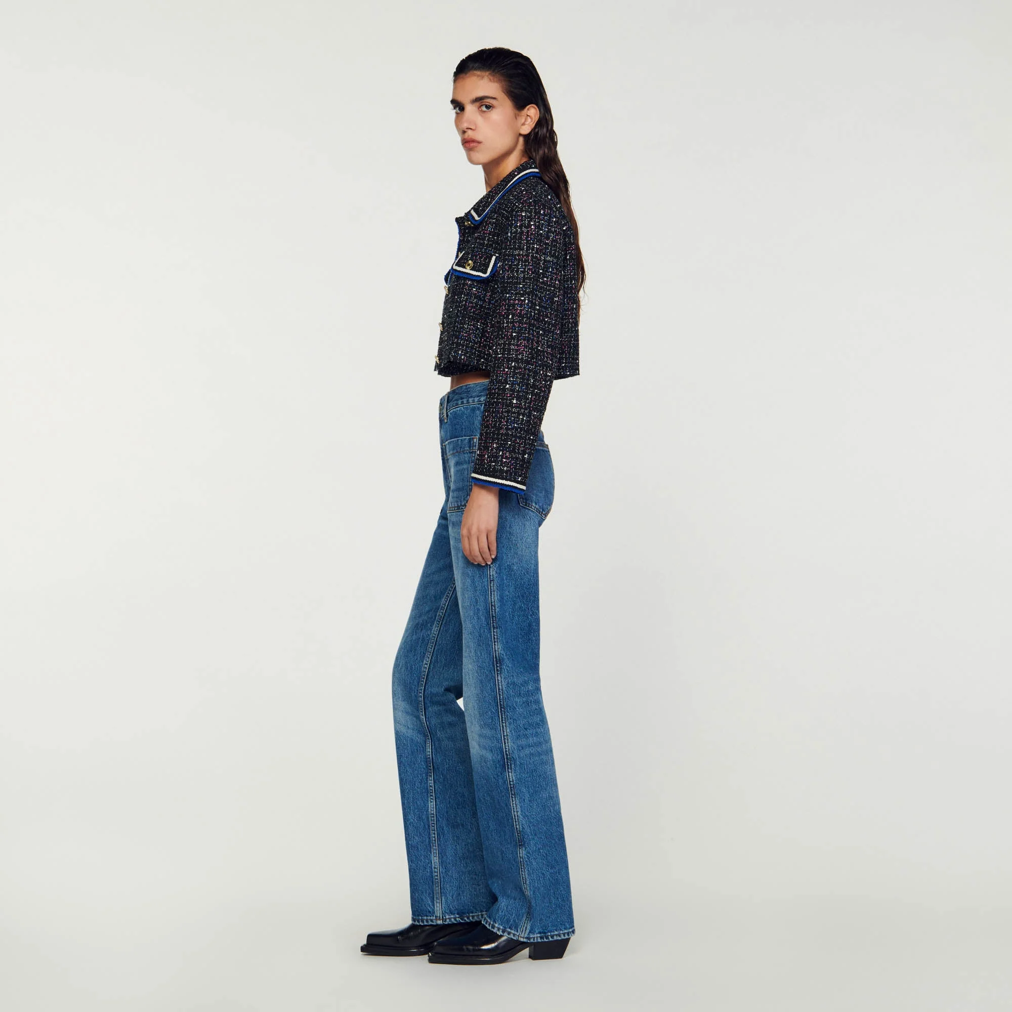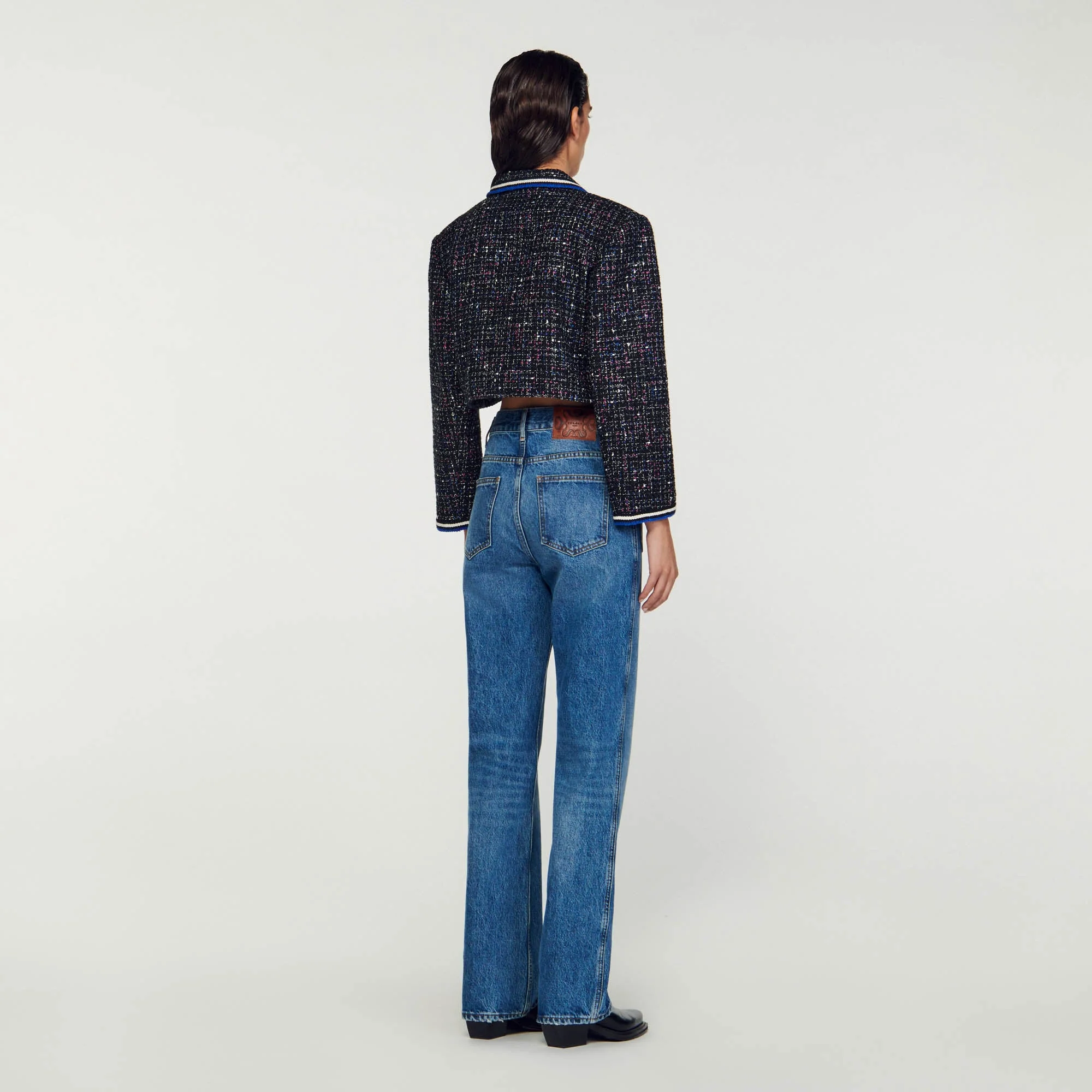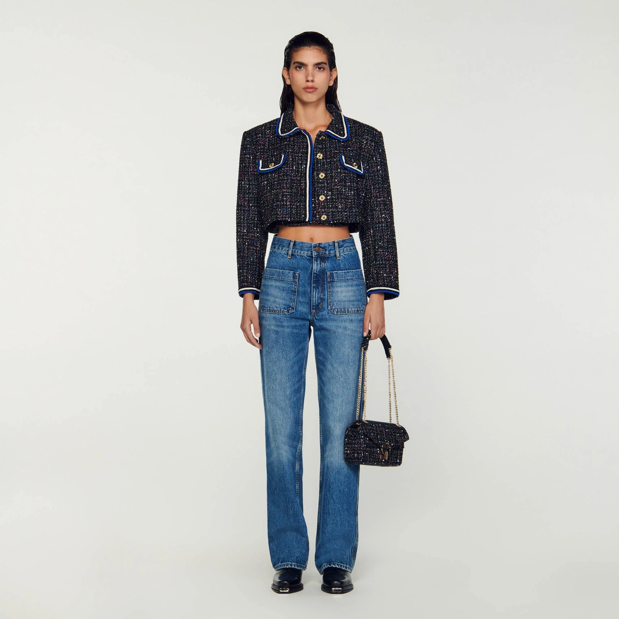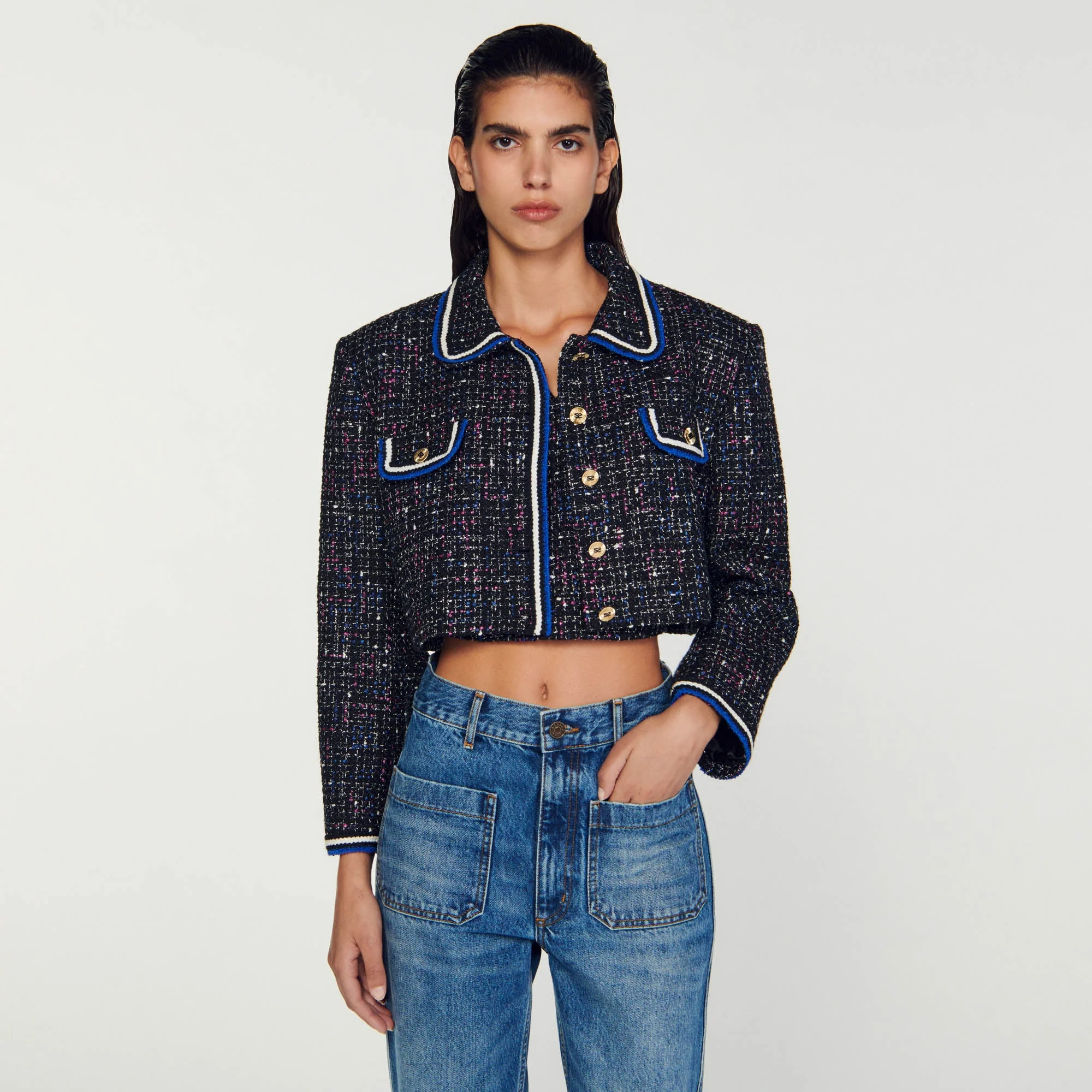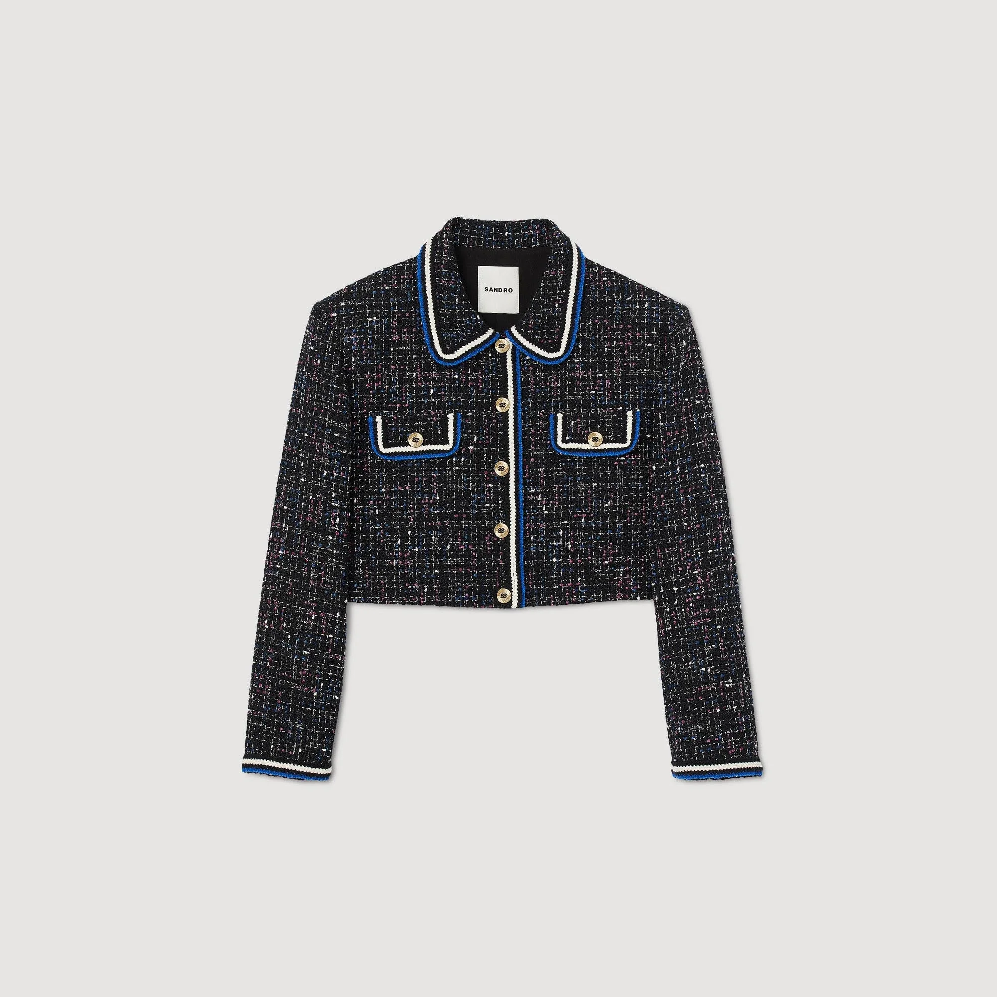 Chaqueta corta de tweed de fantasía, con cuello redondo, manga larga, cierre de botones, bolsillos de solapa en el pecho y adornada con galones que contrastan.• Chaqueta corta de tweed