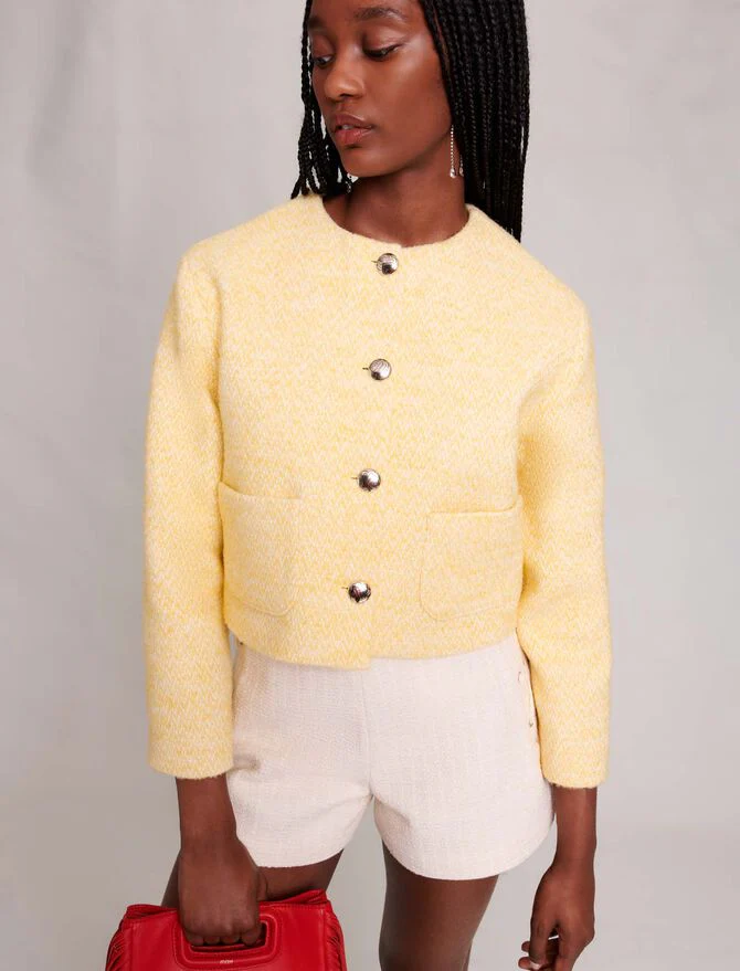 Descubra la nueva colección creada por el estudio de diseño. Aquí, el mundo urbano se encuentra con un atrevido toque roquero. Las piezas indispensables del guardarropa reciben una vuelta de tuerca. Dé rienda suelta a su creatividad y mezcle los estilos a su antojo.Corta y entallada, esta chaqueta de tweed con un color alegre revela hilos metalizados centelleantes. Con mangas largas, un forro satinado y bolsillos de parche, tiene un cierre de botones grabados de metal.Opte por un «look» tendencia añadiendo un pantalón corto de tweed y accesorios con carácter como un colorido bolso M y botas de cuero.Ref.: MFPVE00497El tejido principal de esta prenda está compuesto por al menos un 50 % de acrílico, algodón, lana y poliéster reciclados. Un nuevo hilo fabricado a partir de residuos textiles y plásticos, para una mayor circularidad.En Maje, imaginamos el futuro. Compartimos el objetivo de reducir, un poquito más cada temporada, el impacto en el medio ambiente de las prendas que diseñamos.