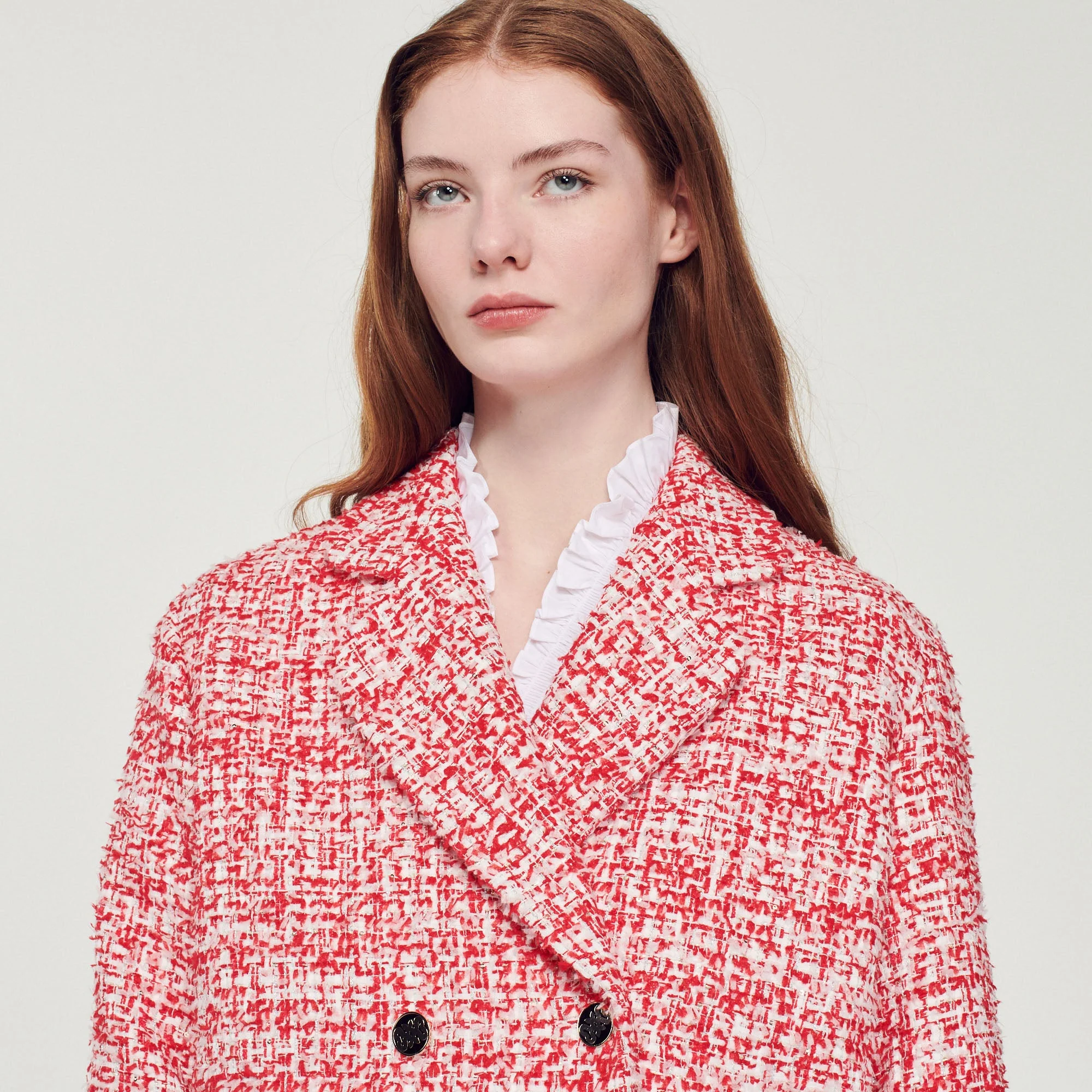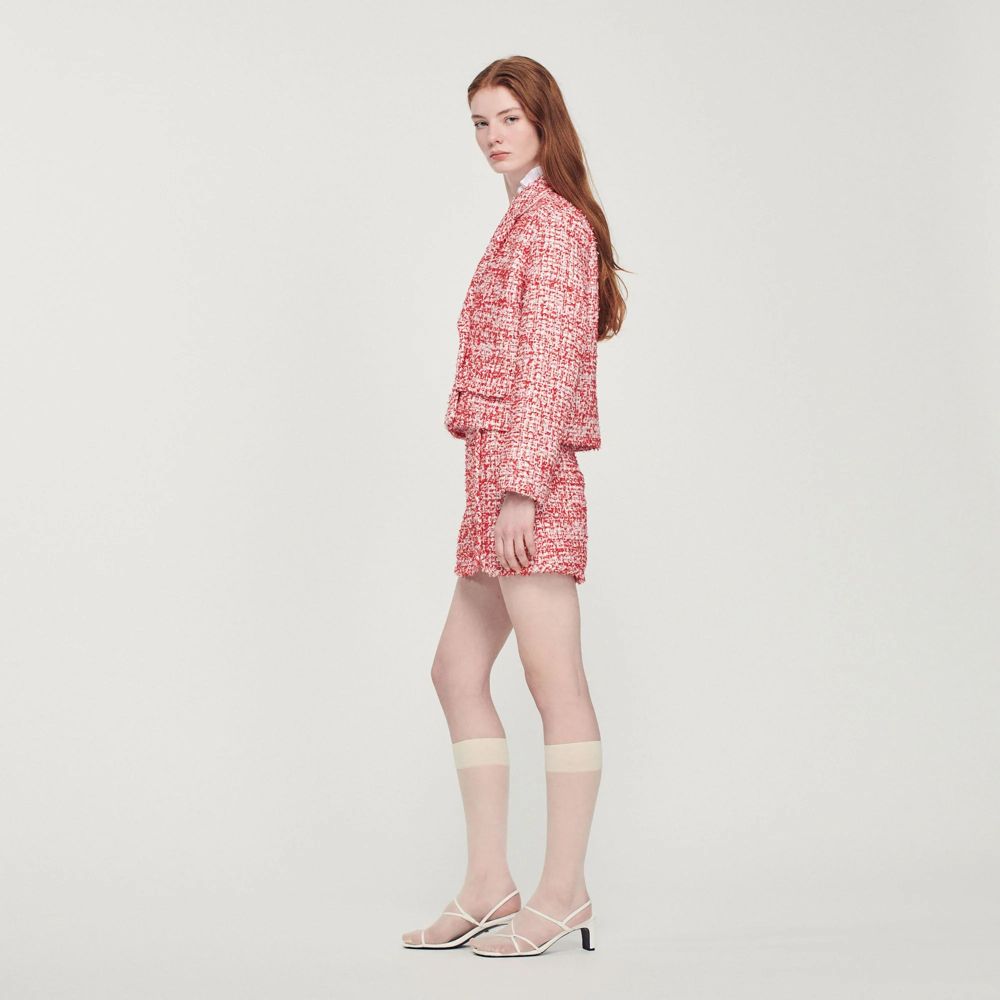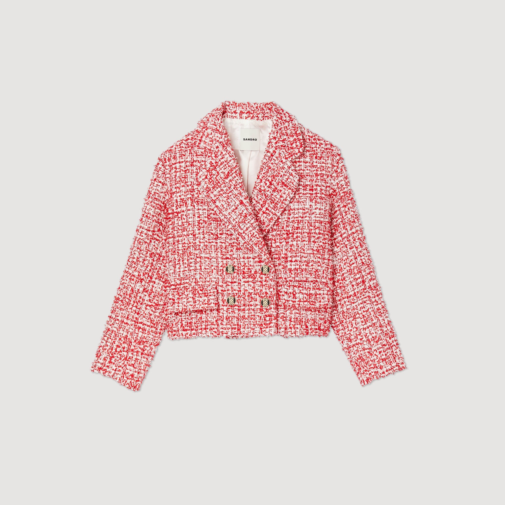 Chaqueta corta de manga larga y cuello sastre de tweed con cierre de doble botonadura.• Chaqueta corta de tweed Sandro de mujer